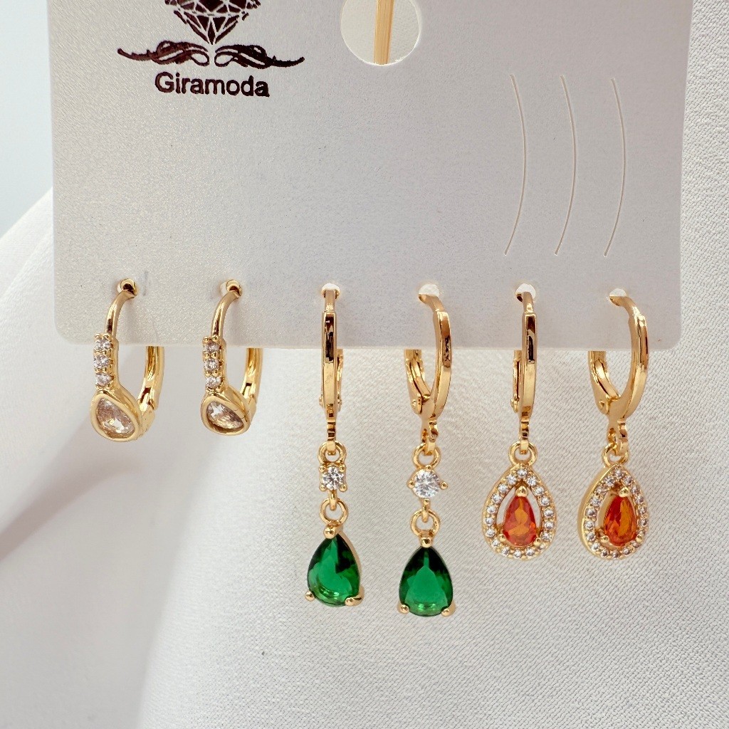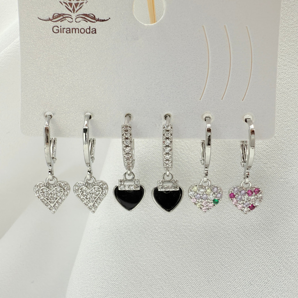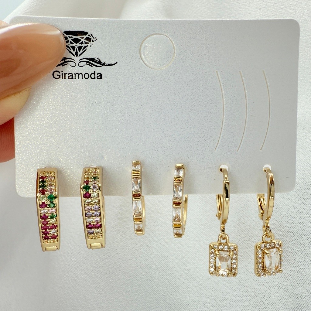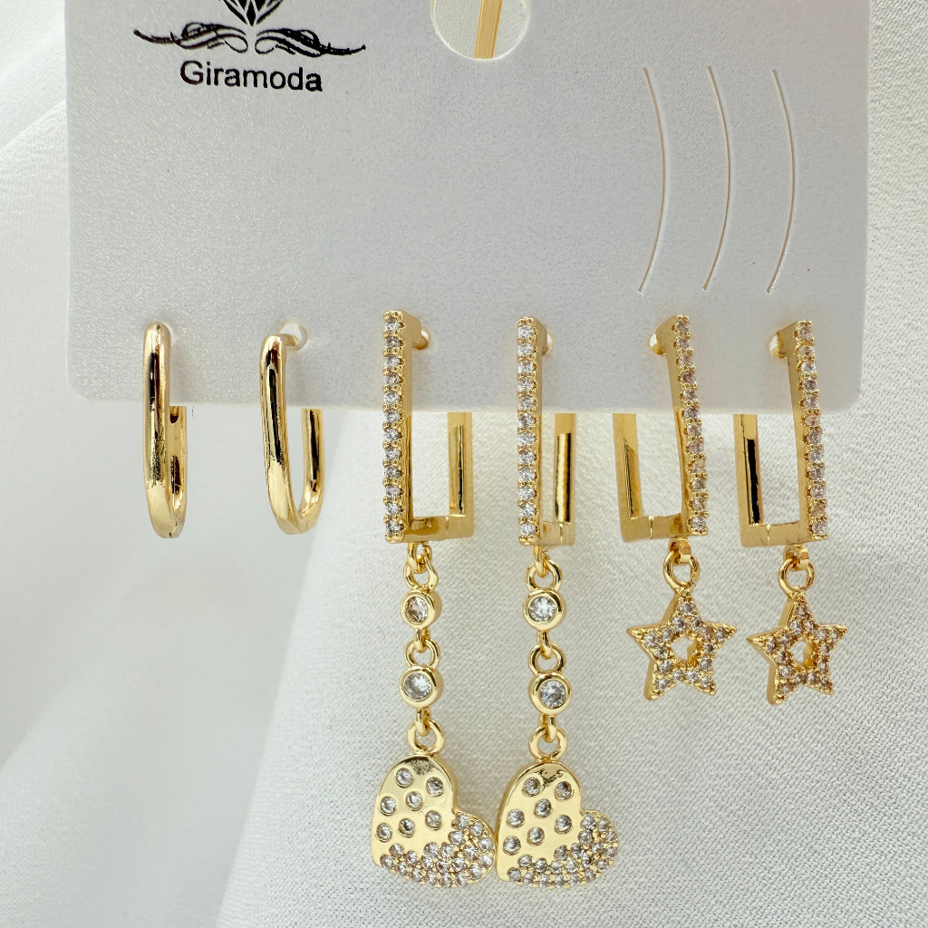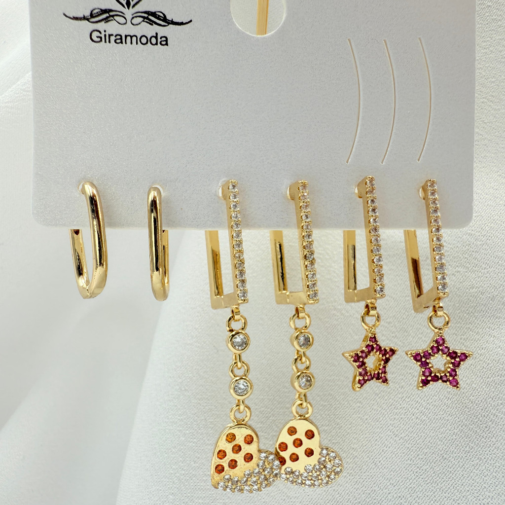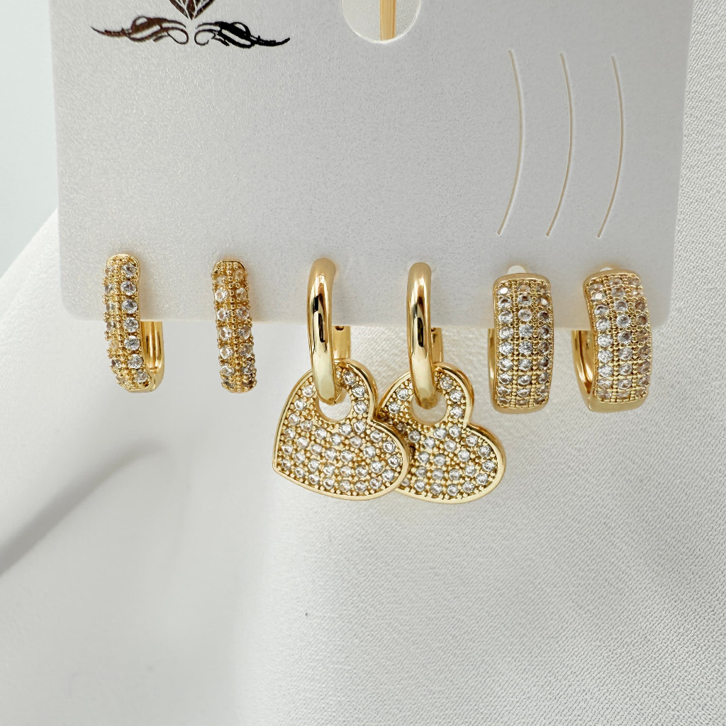 Kit 3 Pares de Brincos Femininos Banhados a Ouro 18K e Prata 925, Coração, Argola e Zircônias Coloridas