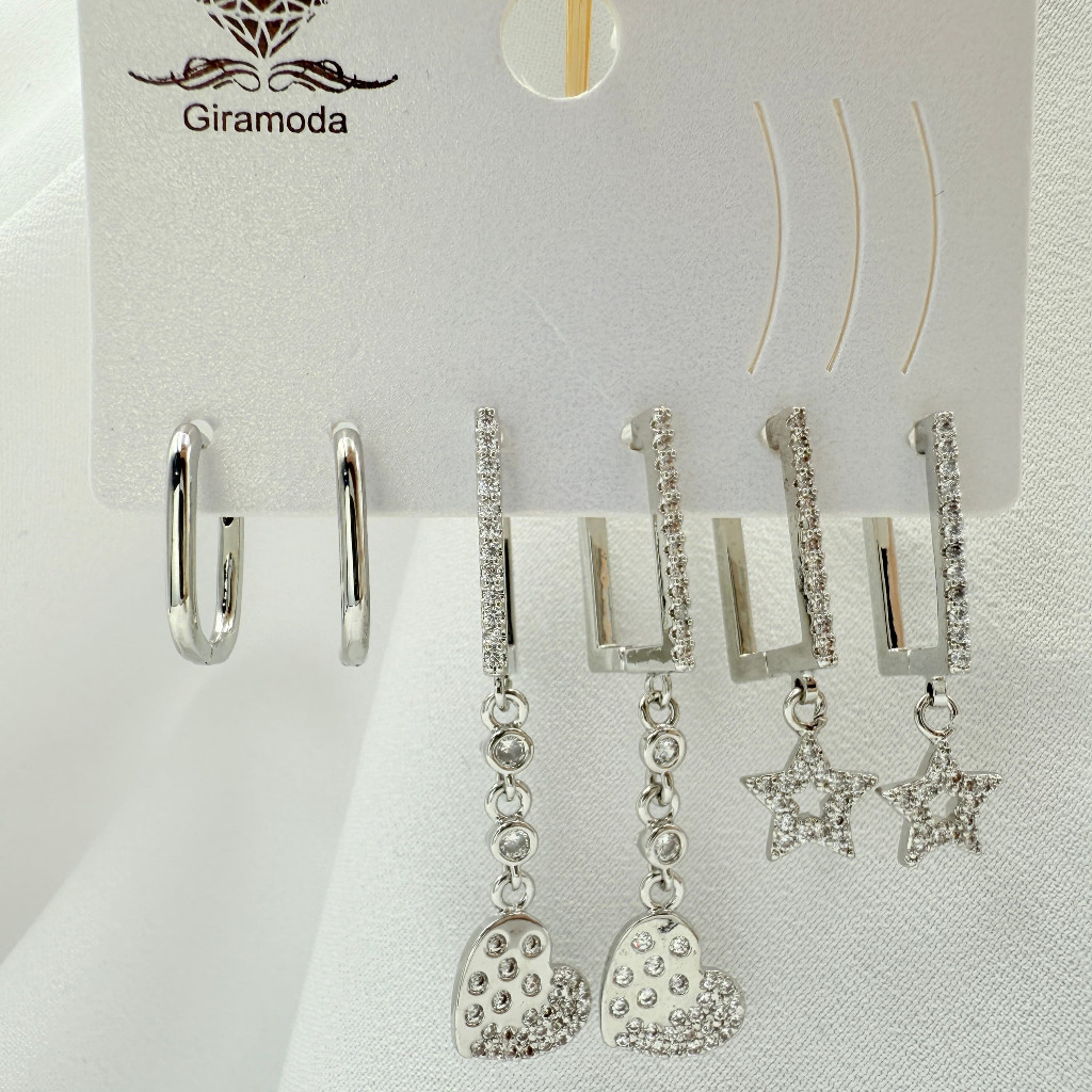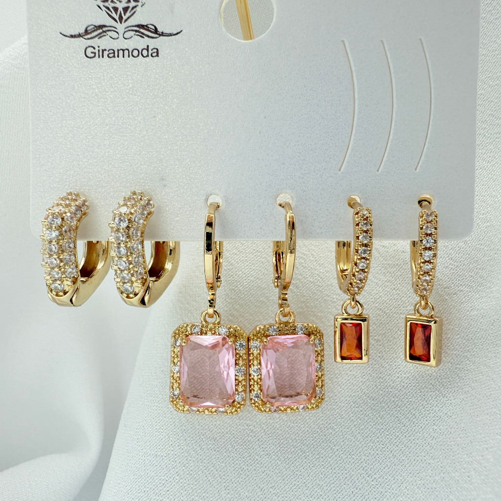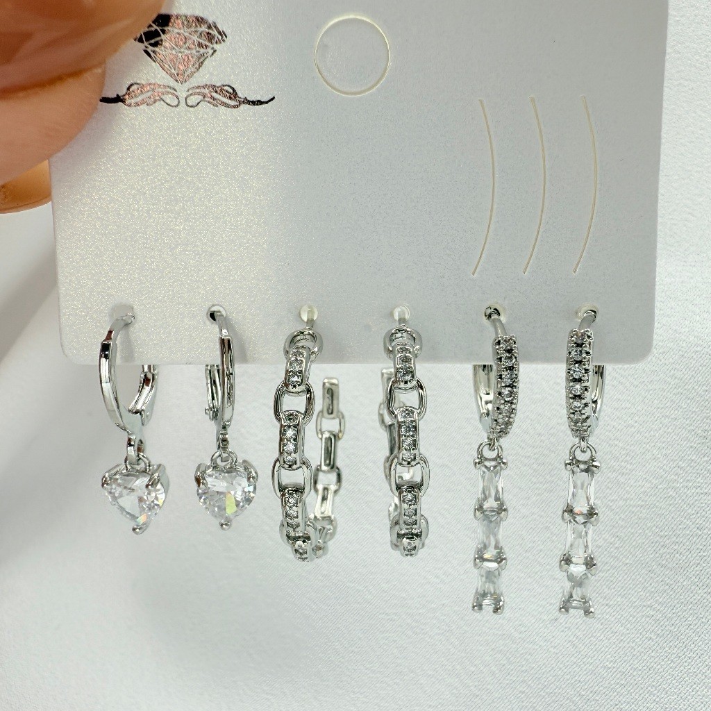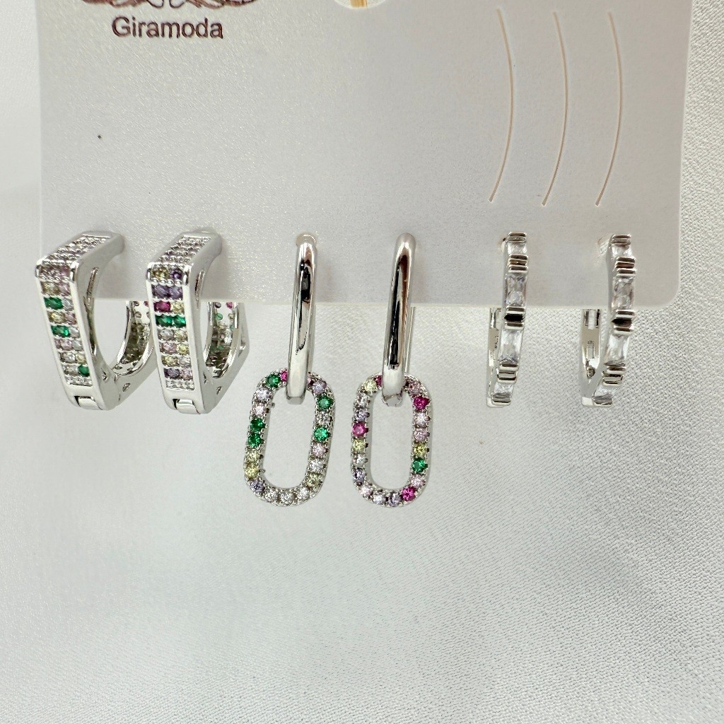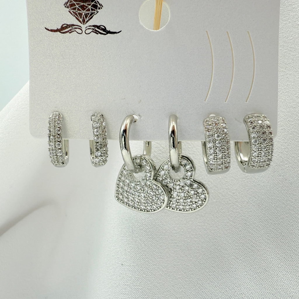 Kit 3 Pares de Brincos Femininos Banhados a Ouro 18K e Prata 925, Coração, Argola e Zircônias Coloridas
