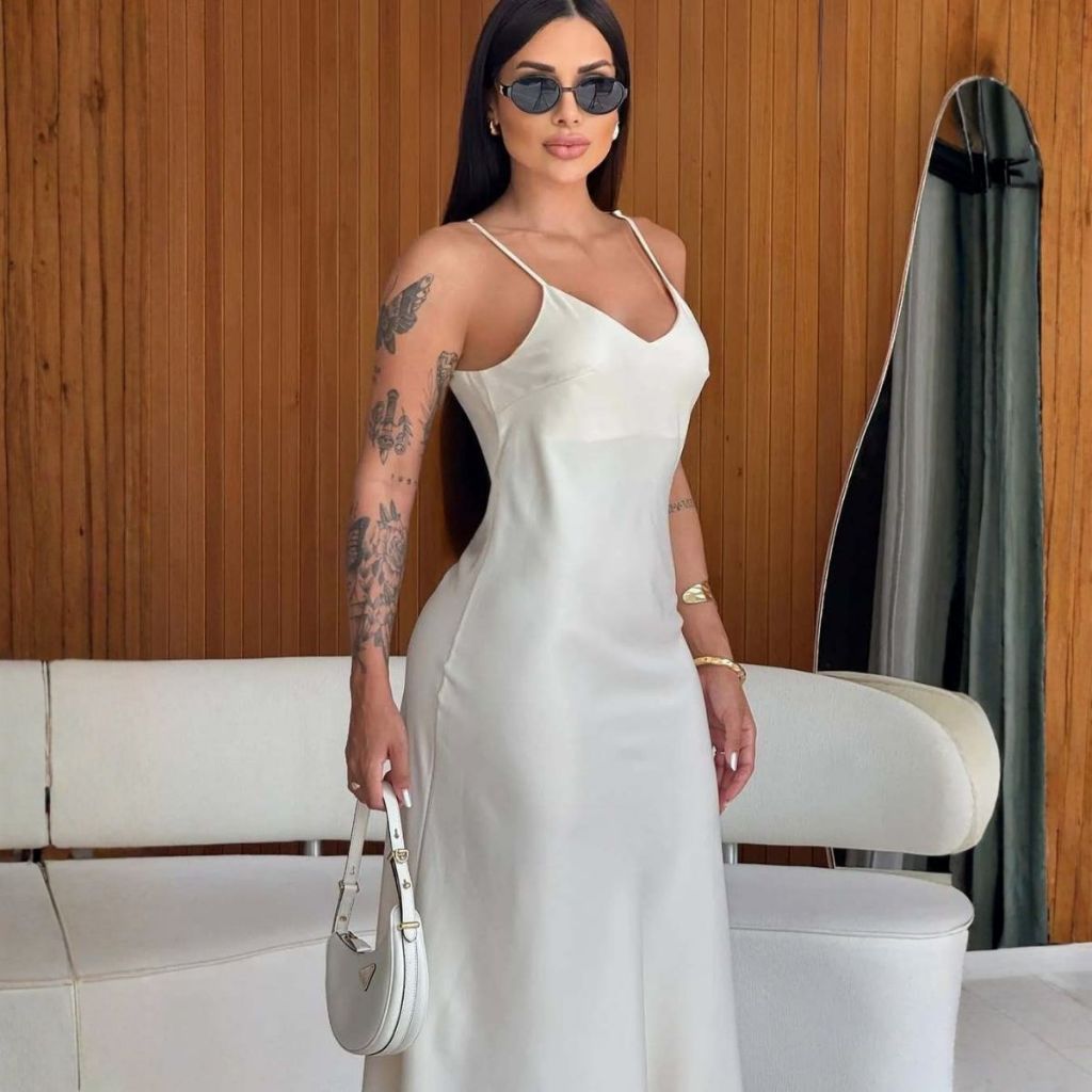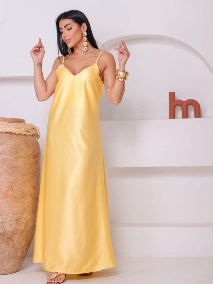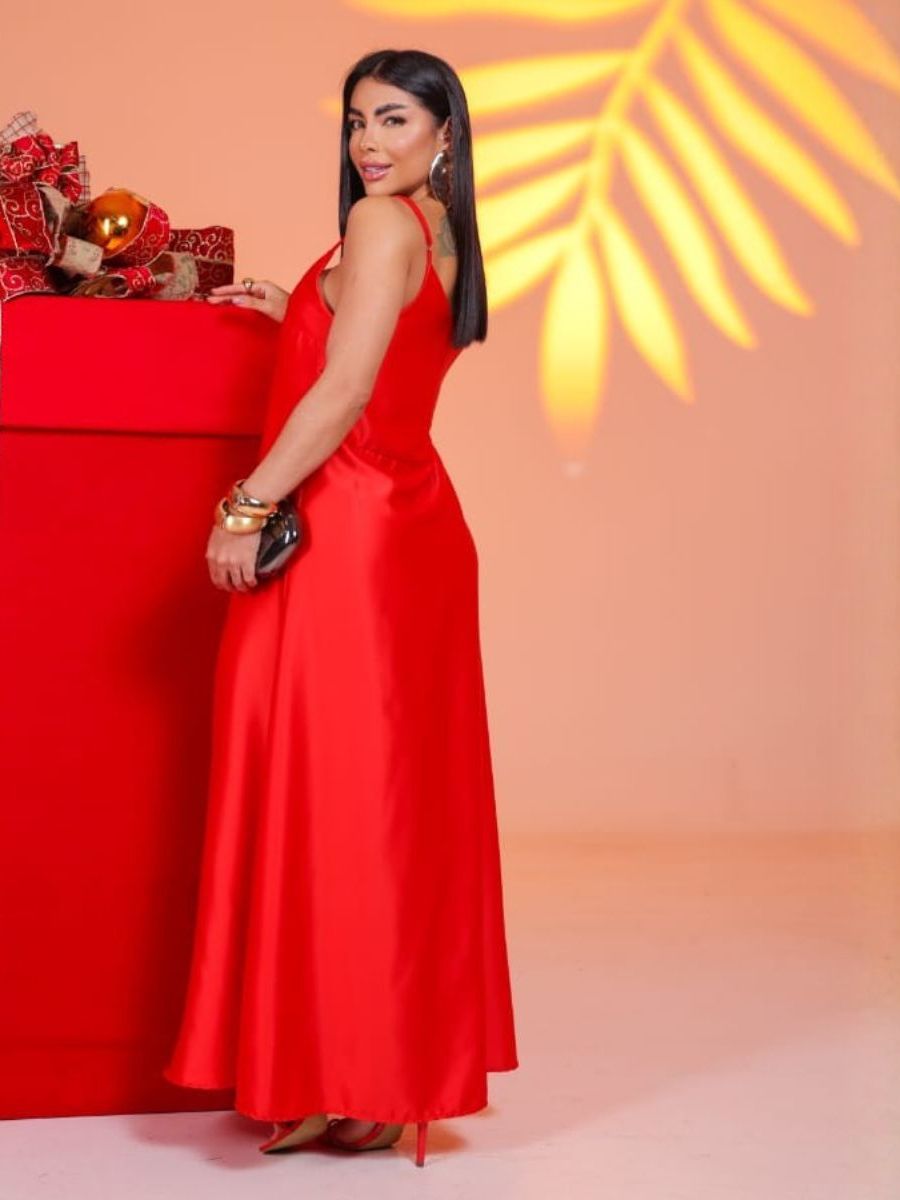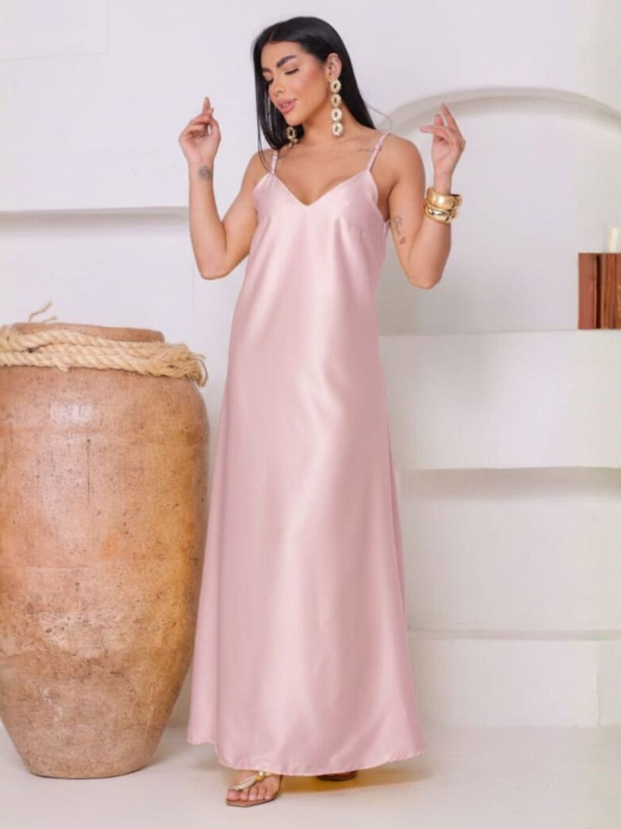 Vestido Feminino Cetim Longo Seda Elegante Semi - Brilho Evasê Alcinhas Modelagem Justa