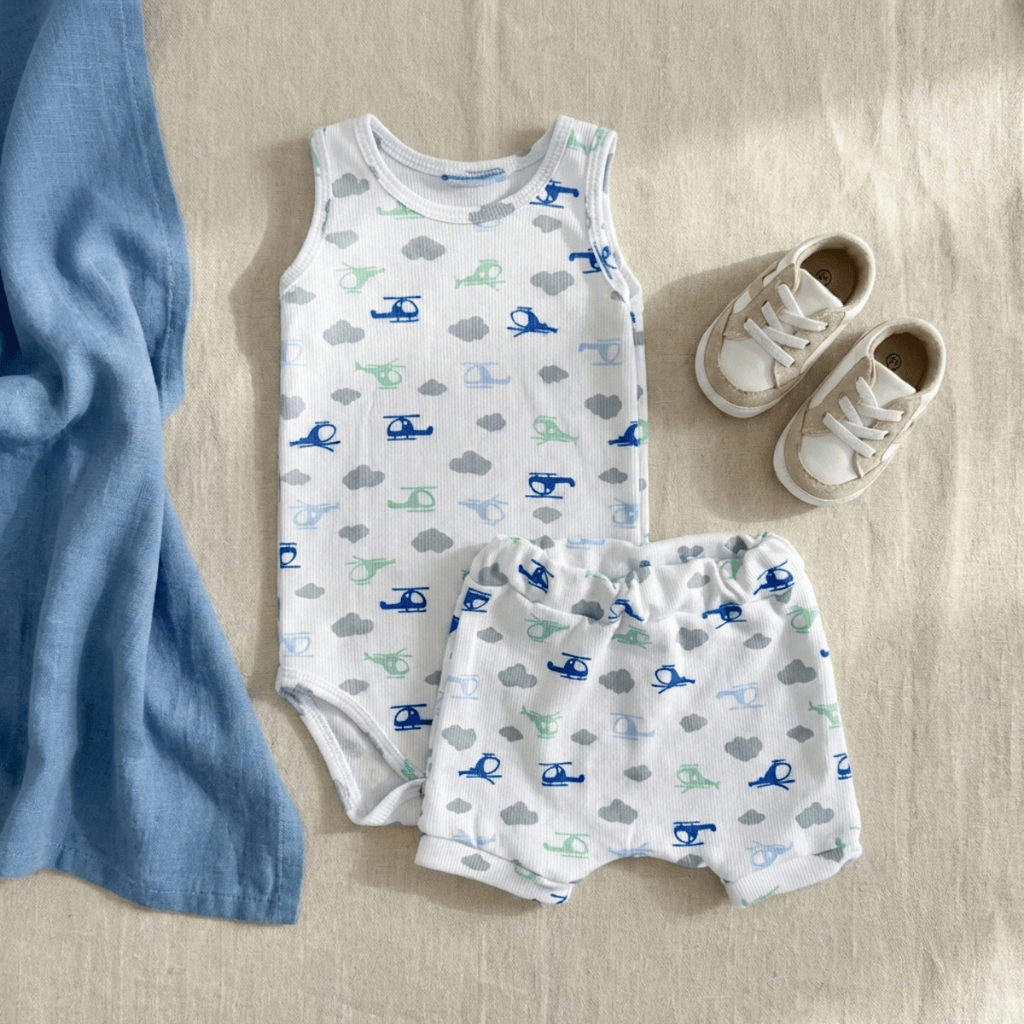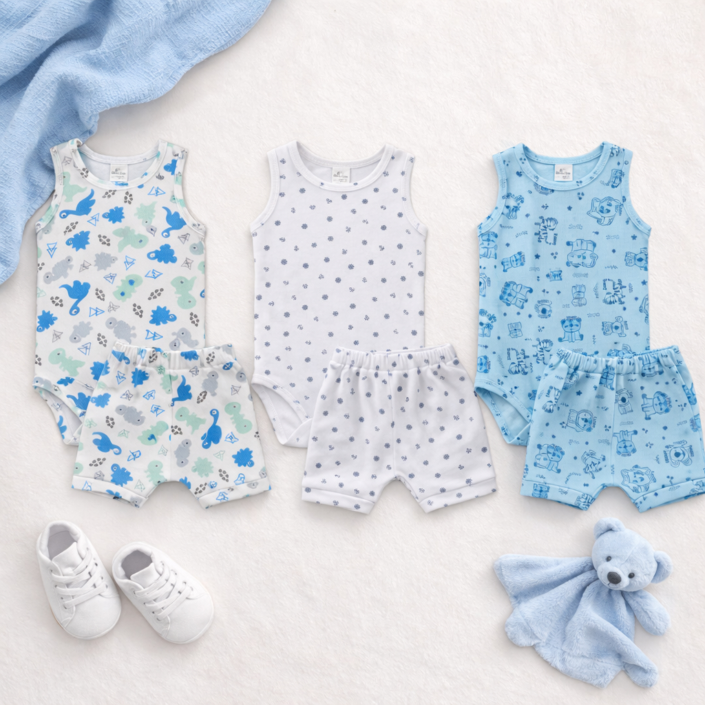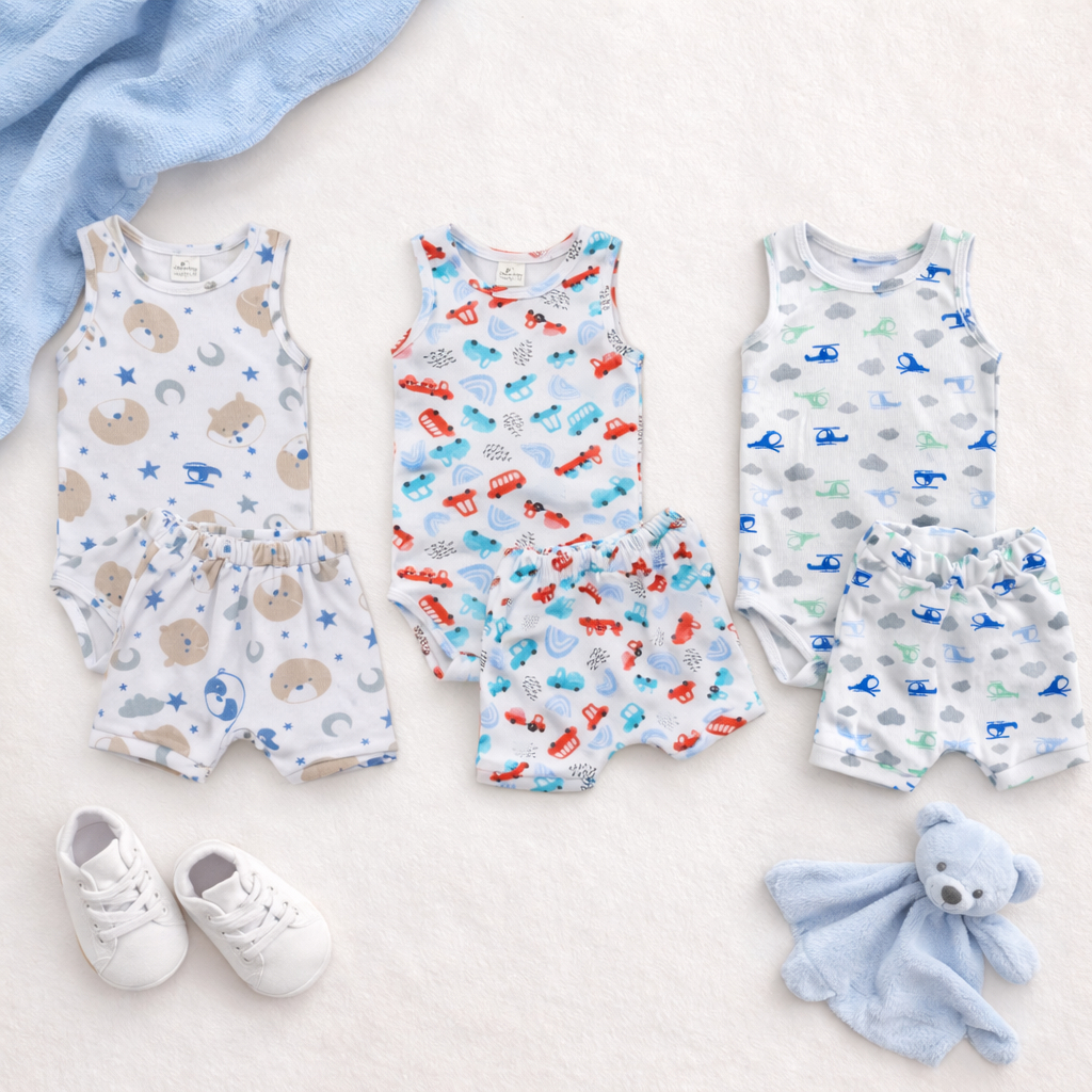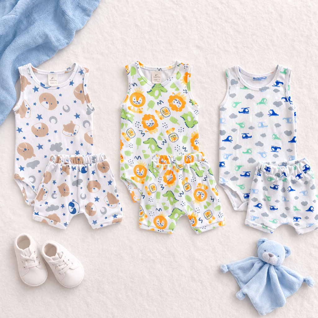 Kit Body Regata de Bebe + Short Canelado Estampado Menino Enxoval de Bebe de Verão 100% Algodão