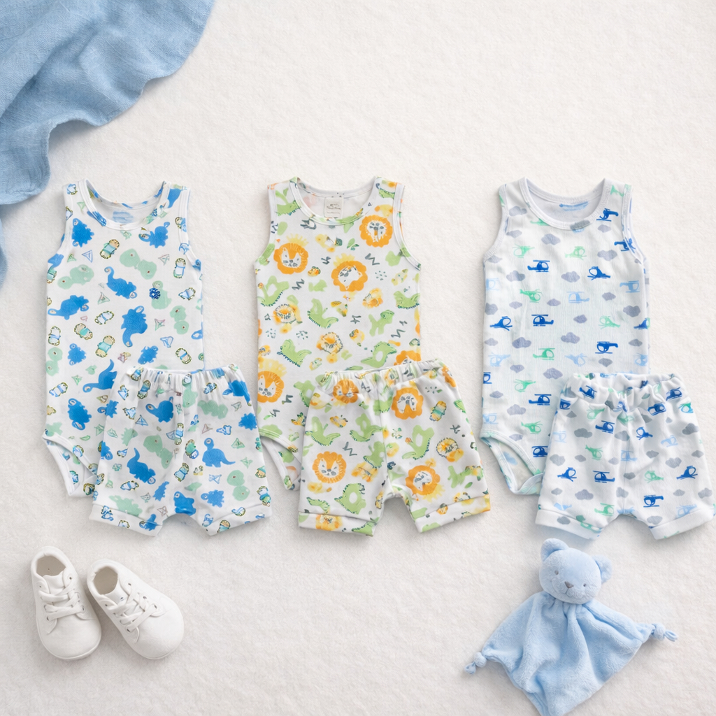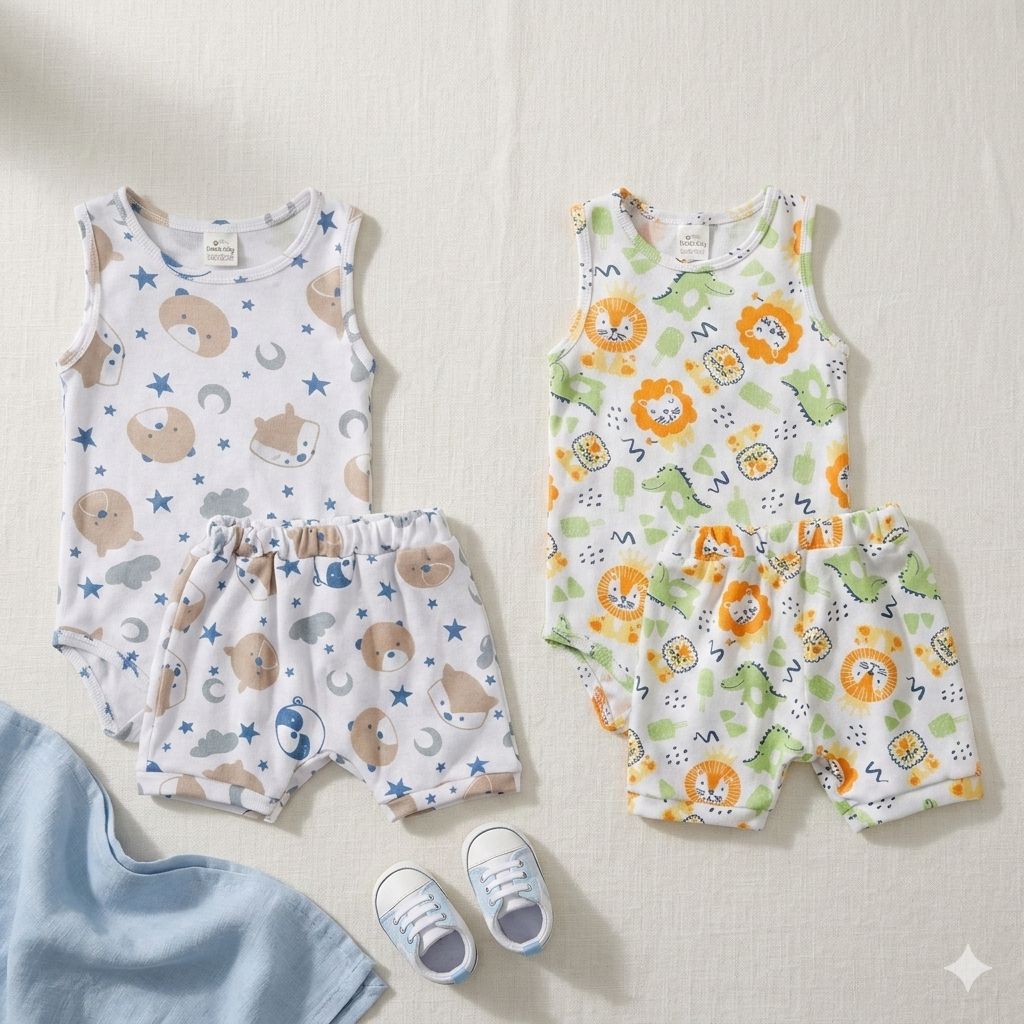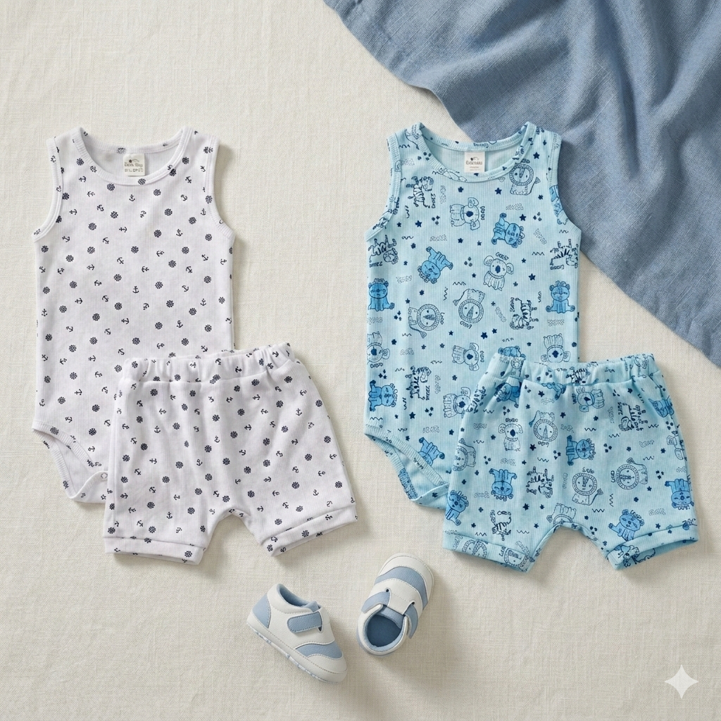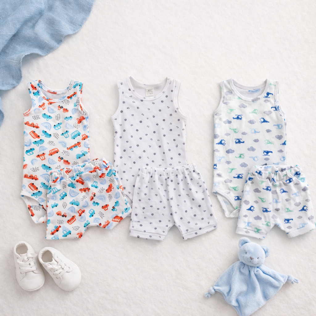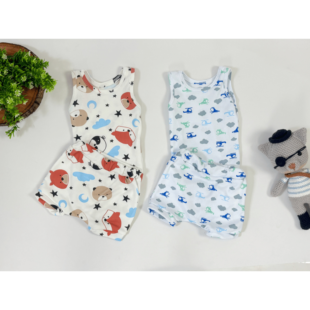 Kit Body Regata de Bebe + Short Canelado Estampado Menino Enxoval de Bebe de Verão 100% Algodão