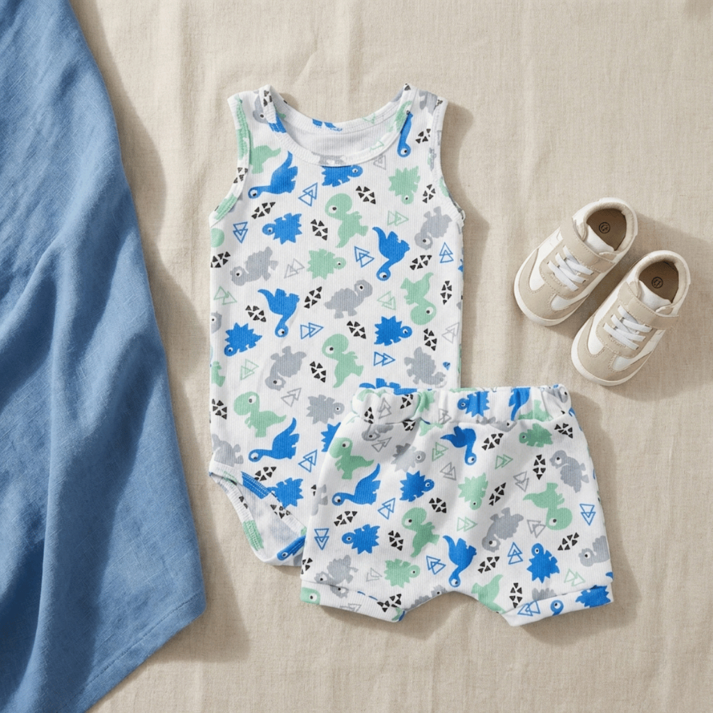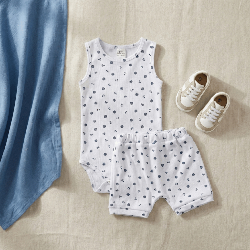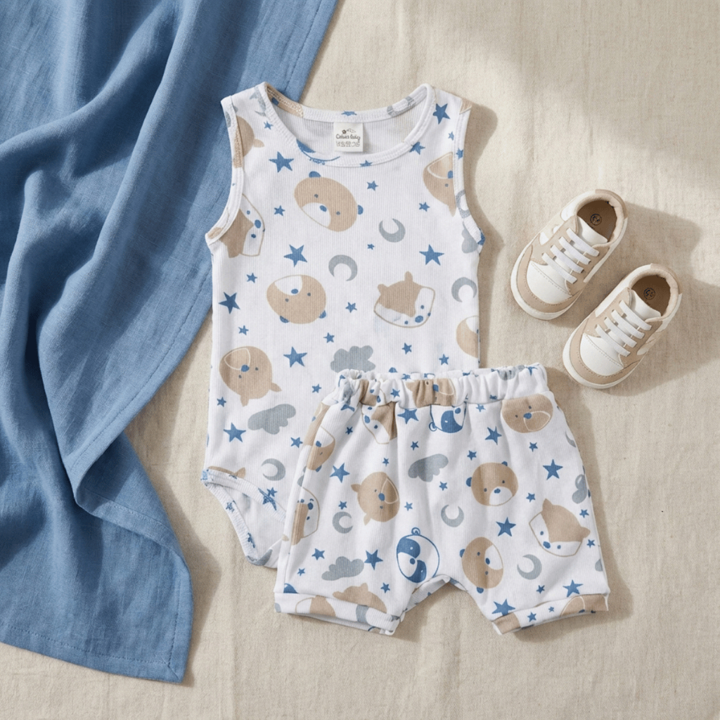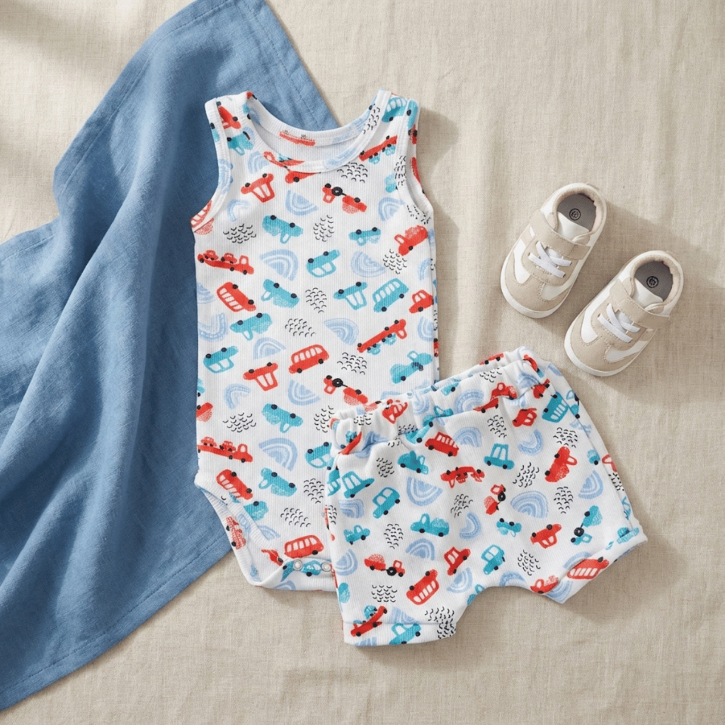 Kit Body Regata de Bebe + Short Canelado Estampado Menino Enxoval de Bebe de Verão 100% Algodão