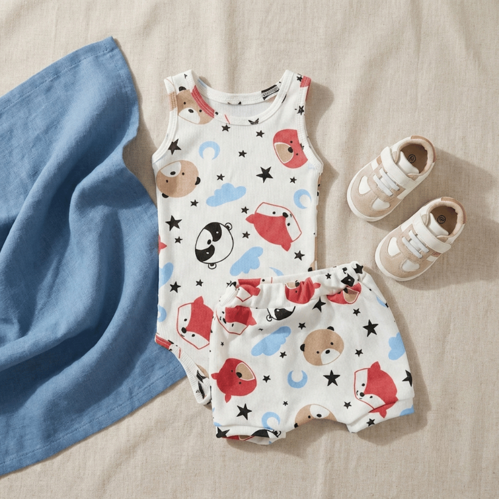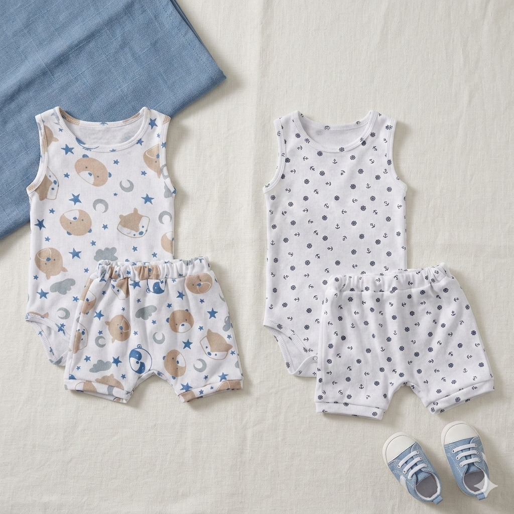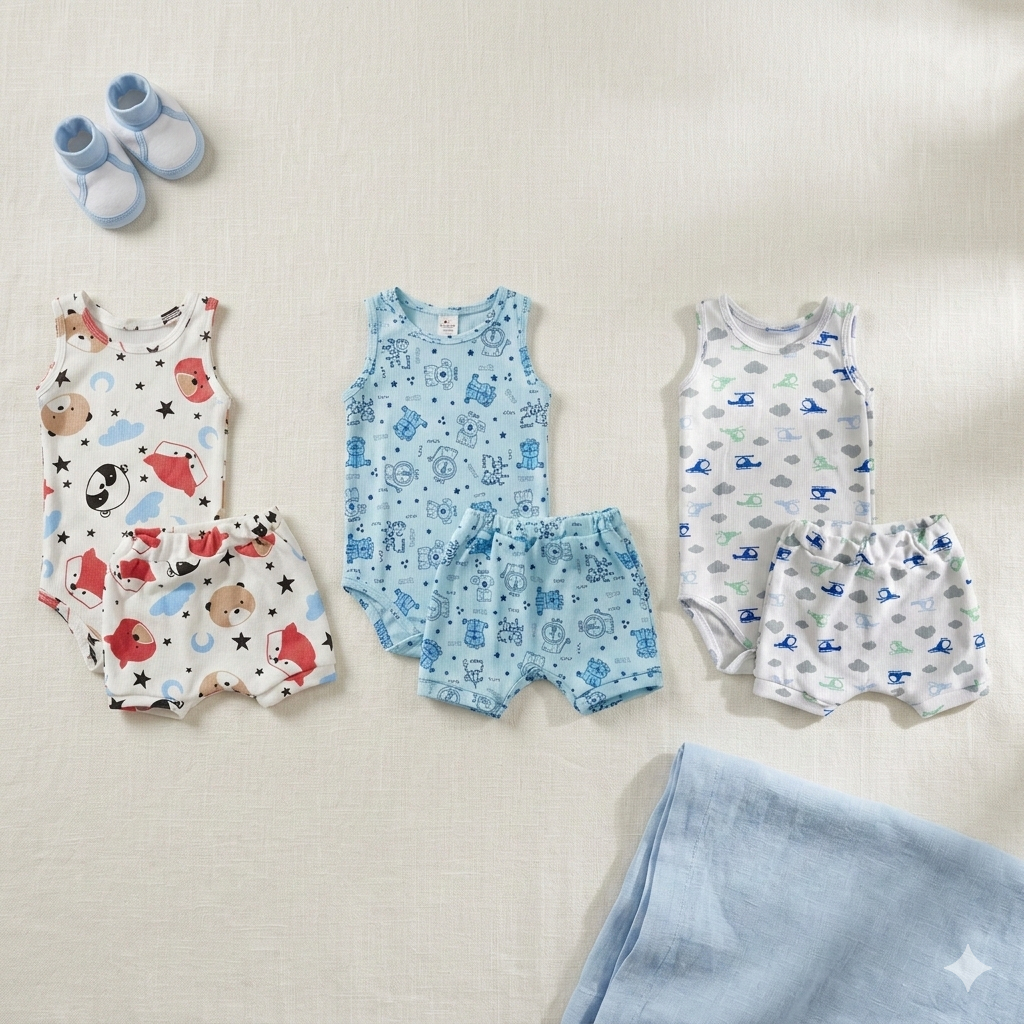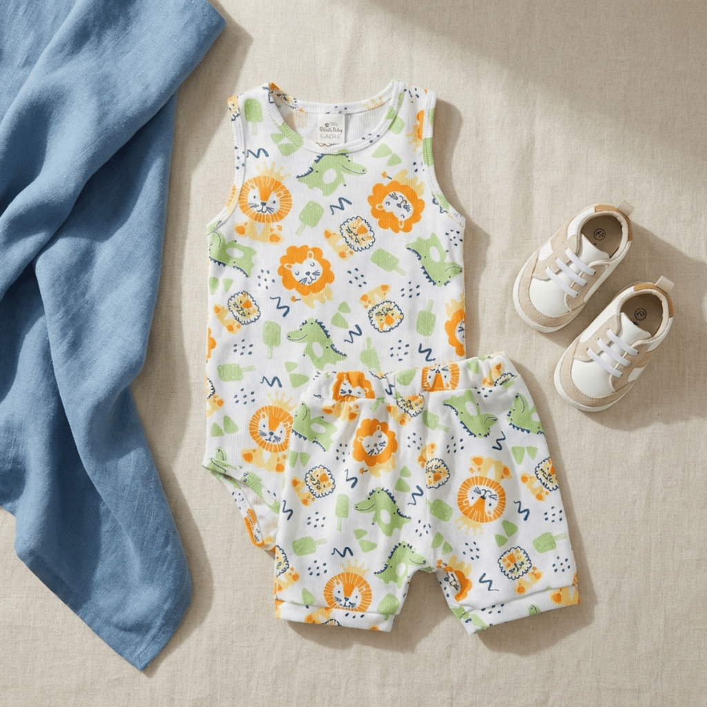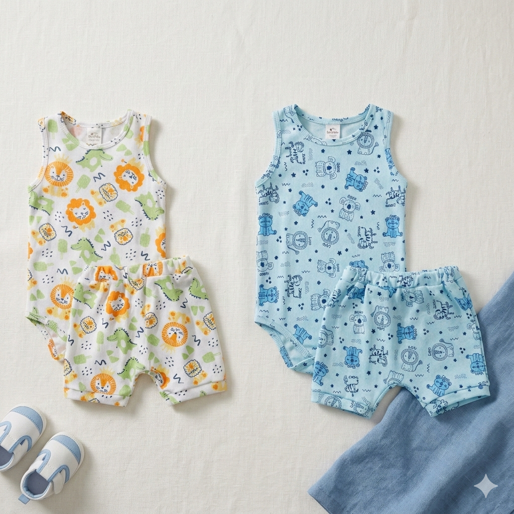 Kit Body Regata de Bebe + Short Canelado Estampado Menino Enxoval de Bebe de Verão 100% Algodão