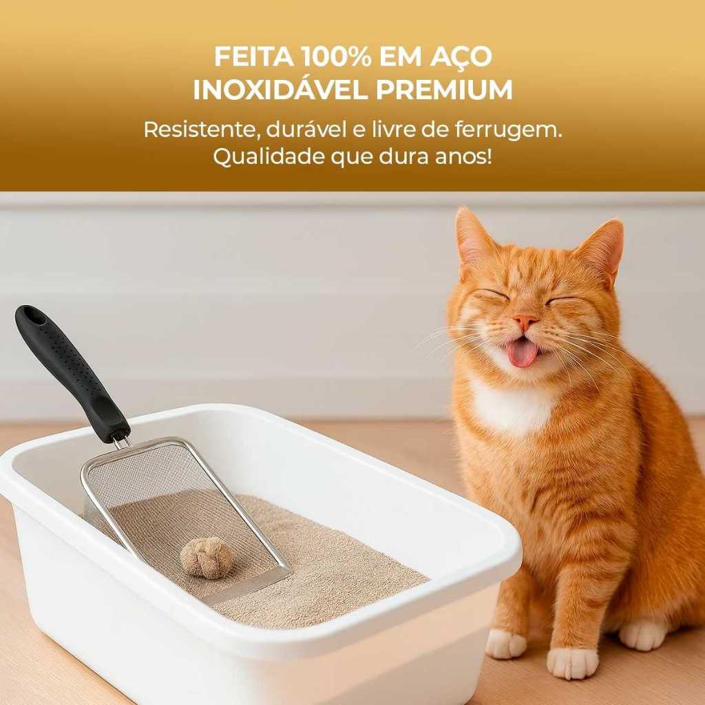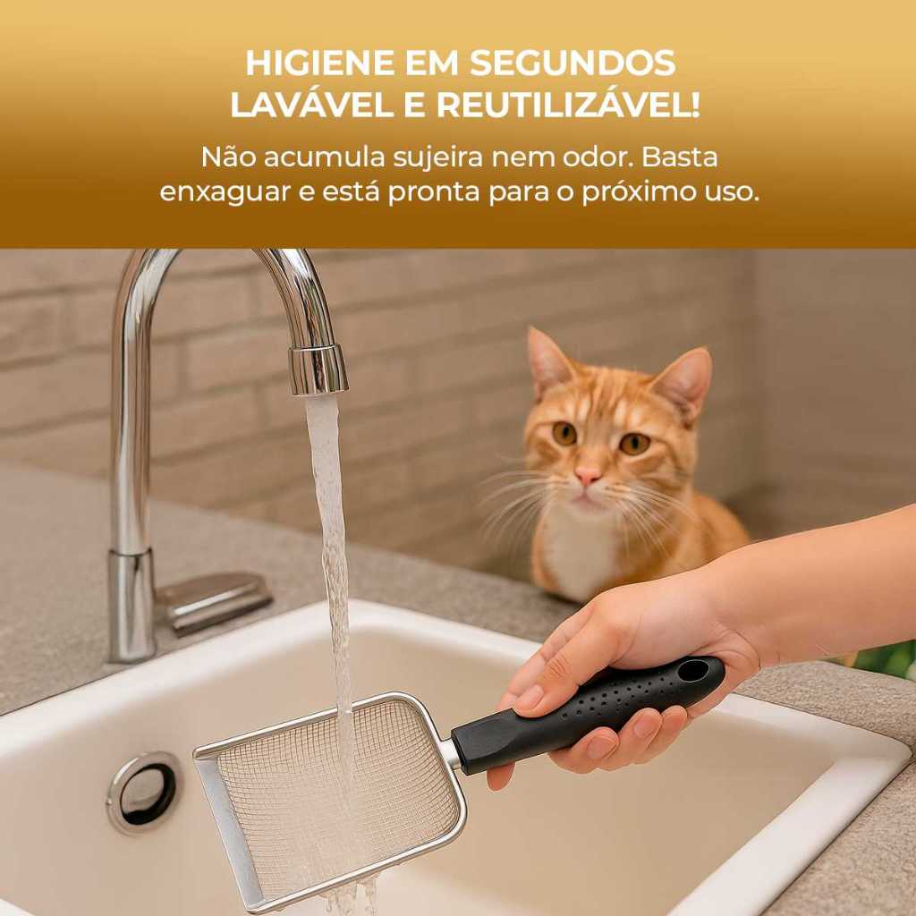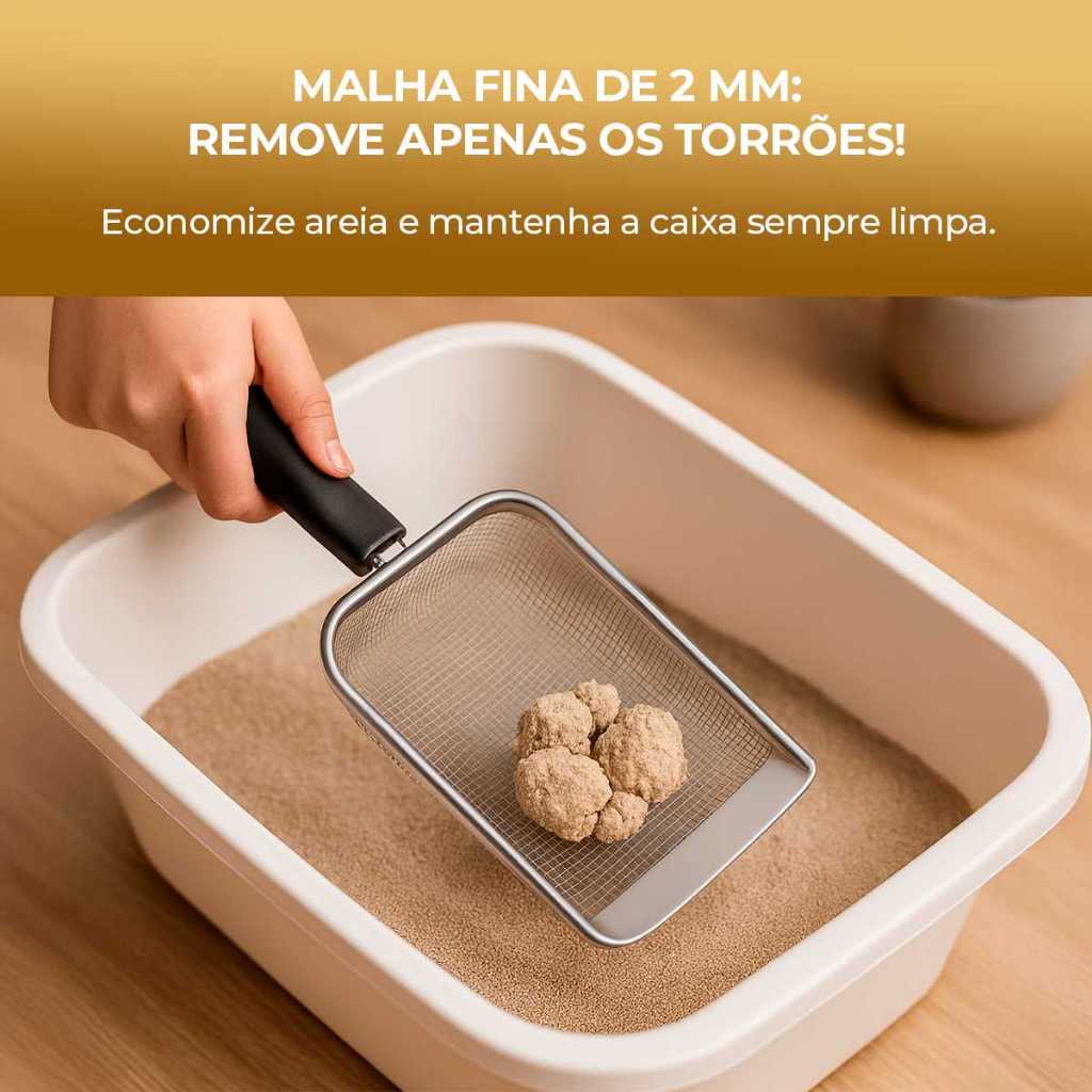 Pá Higiênica Aço Inox para Areia de Gato Malha Fina 2mm, Cabo Ergonômico e Lavável Reutilizável
