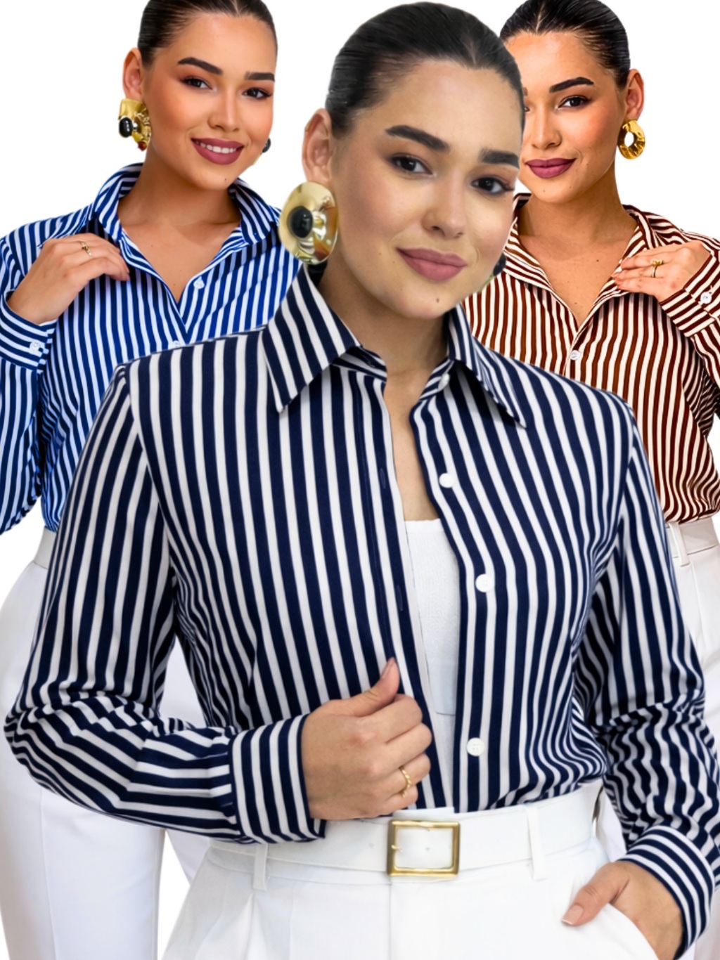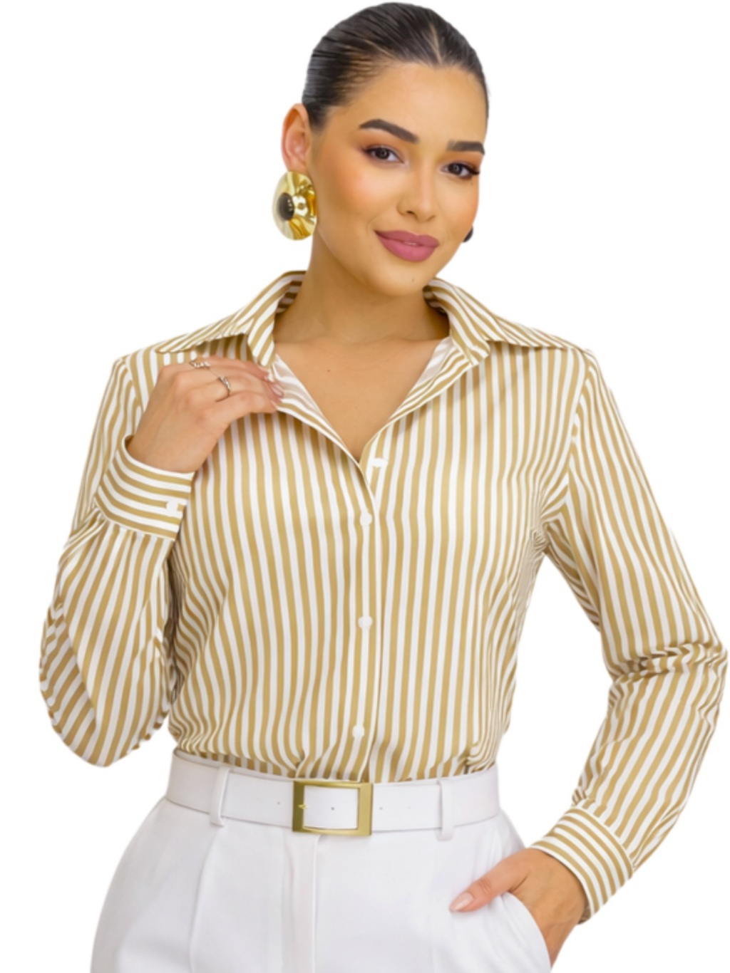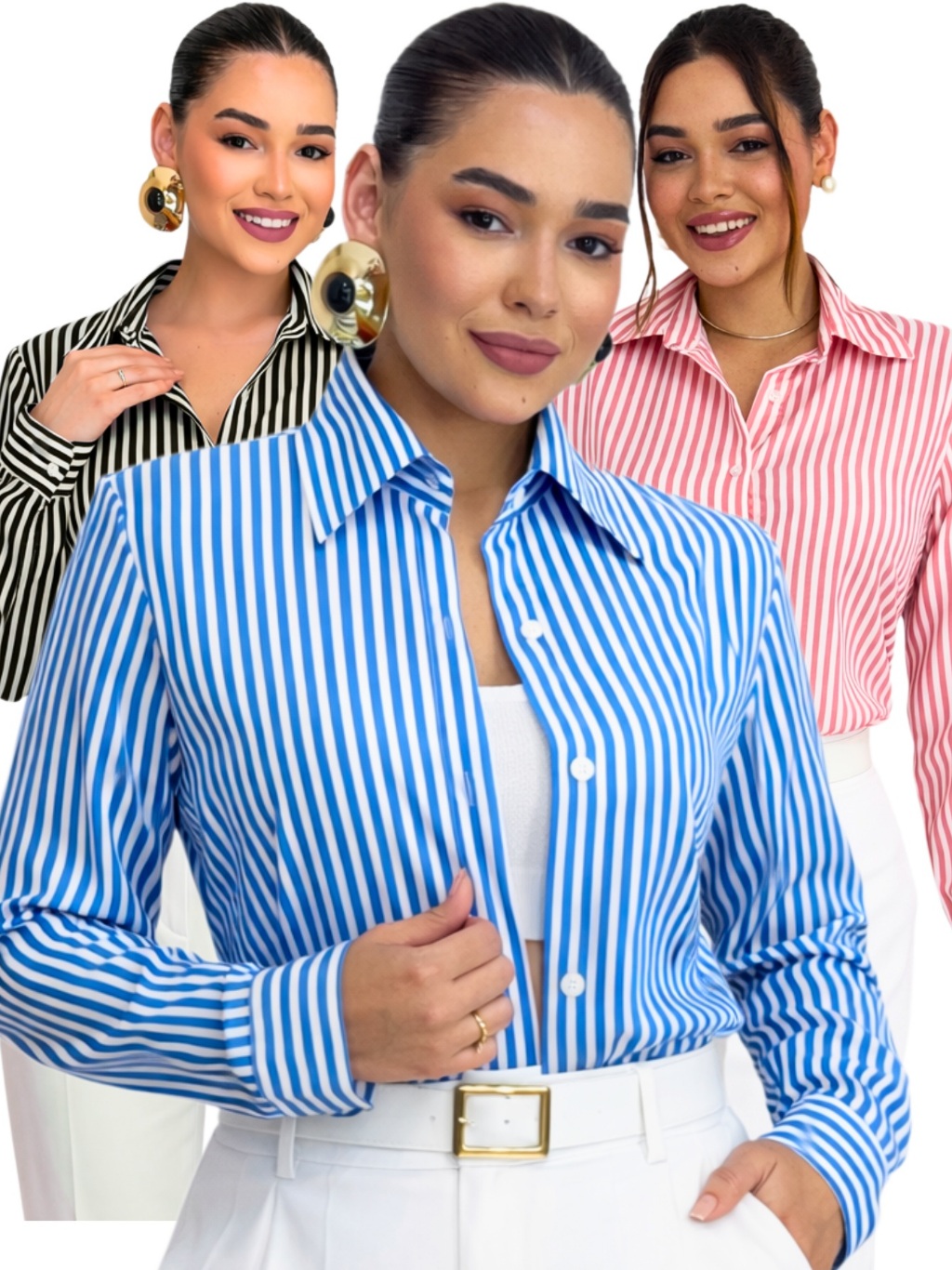 Camisa Listrada Feminina Plus Size Elegante em Crepinho – M ao G1