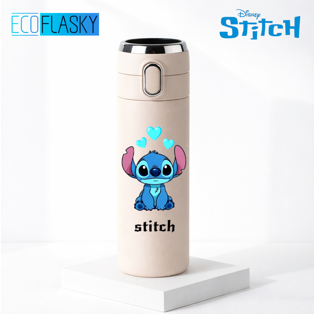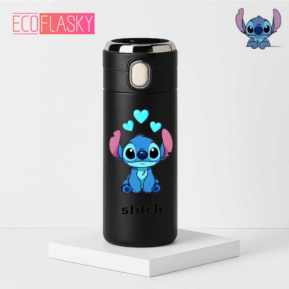 Garrafa Térmica Infantil Stitch Estampada Aço Com Termometro Digital Medidor de Temperatura 420ml