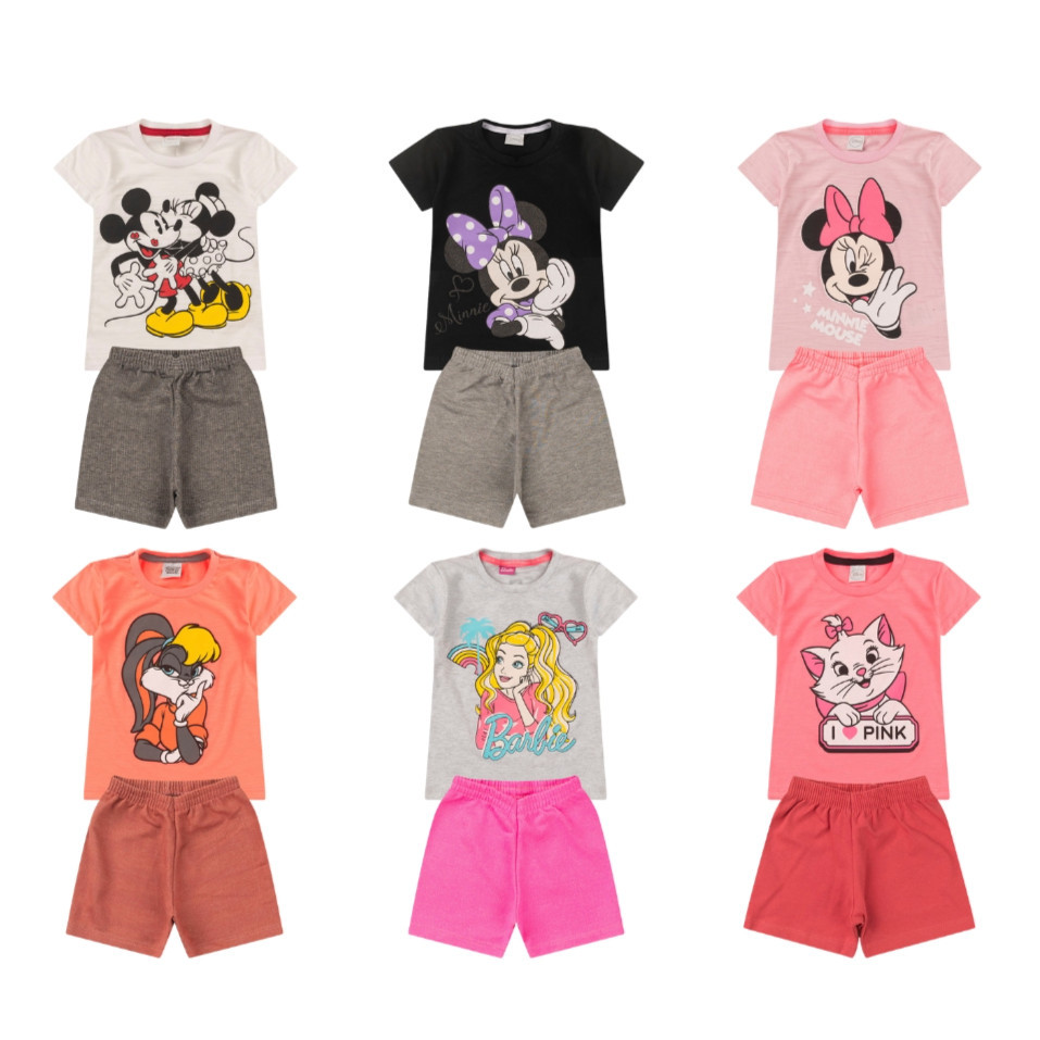 Kits de Roupa Menina Infantil Personagens Verão Conjunto Feminino Calor Barbie Minnie Stitch
