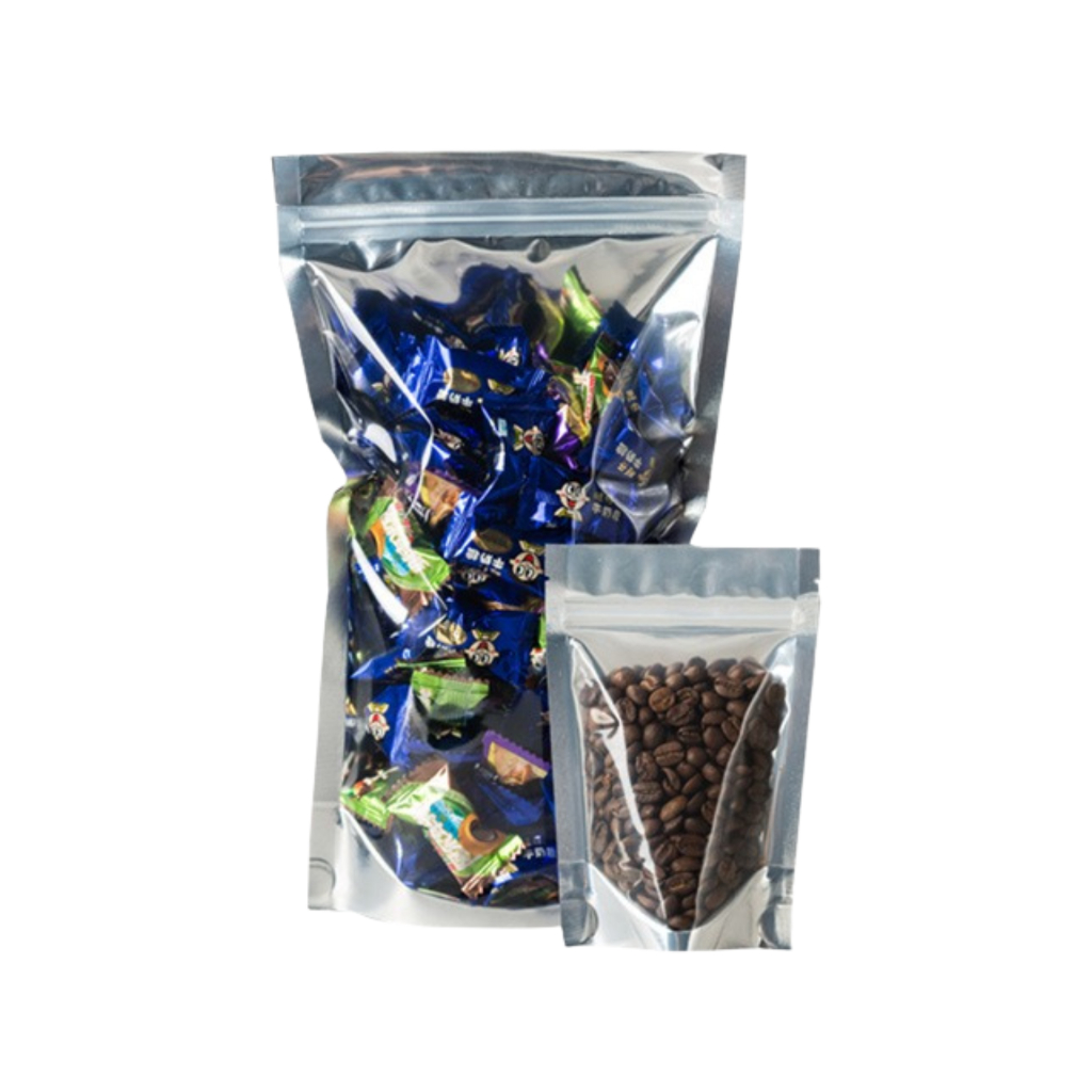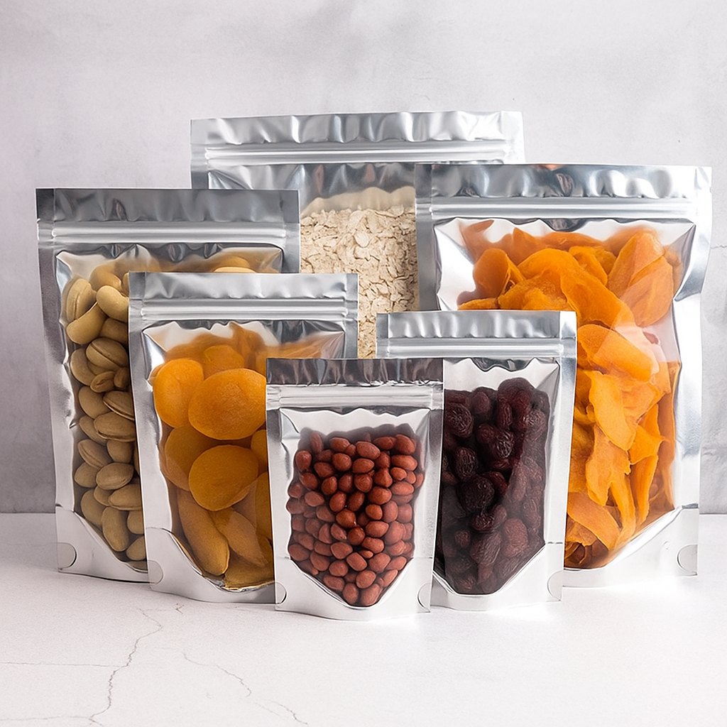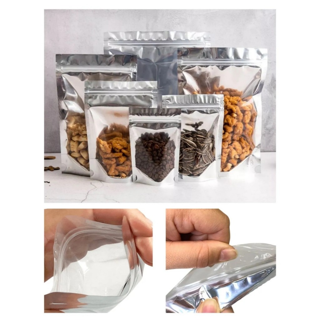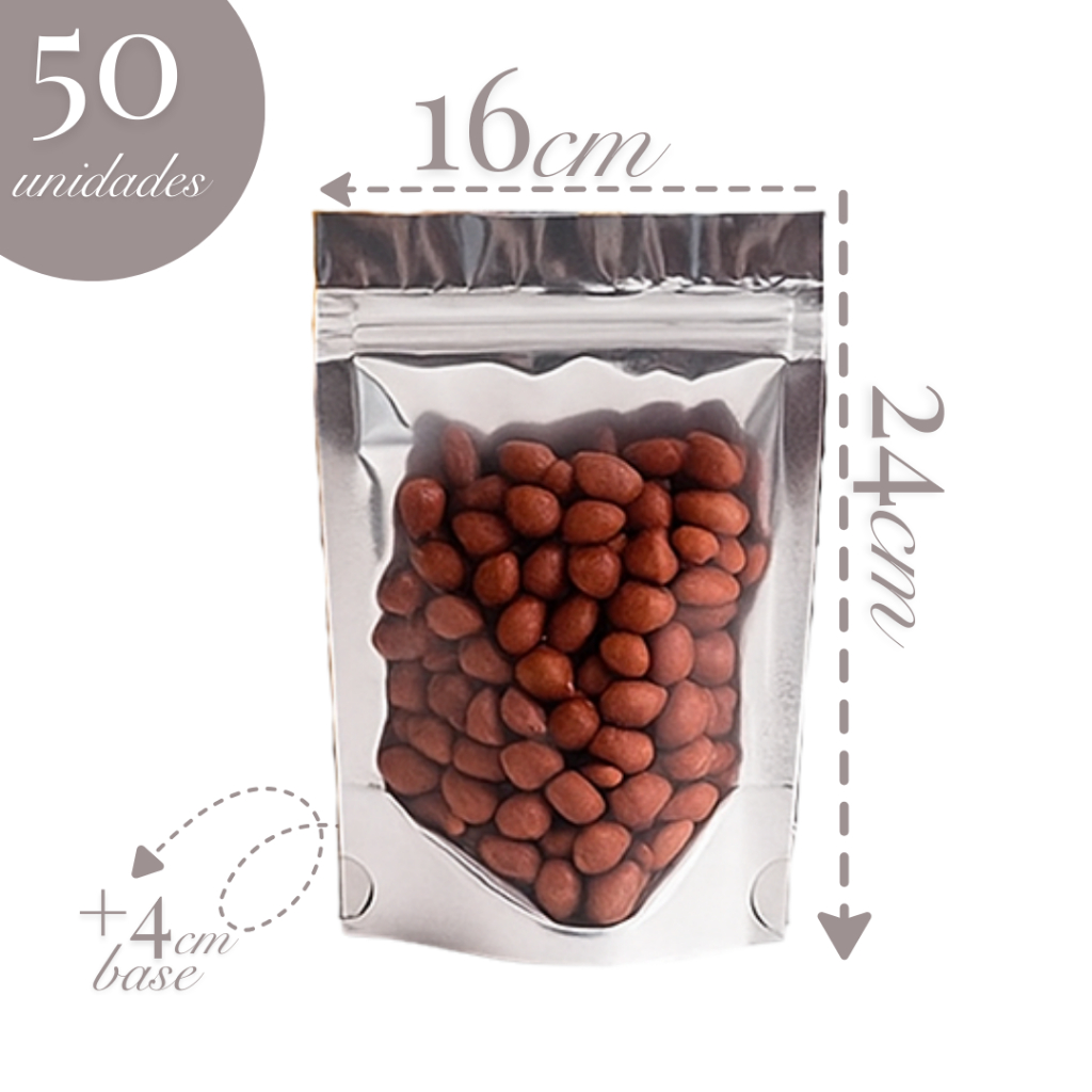 Saco Stand Up Pouch Prata Brilhante C/50Un Laminado Metalizado Zip C/ Visor Hermético Impermeável