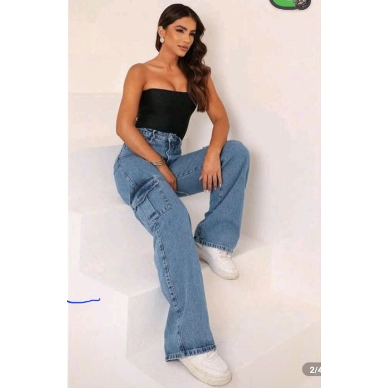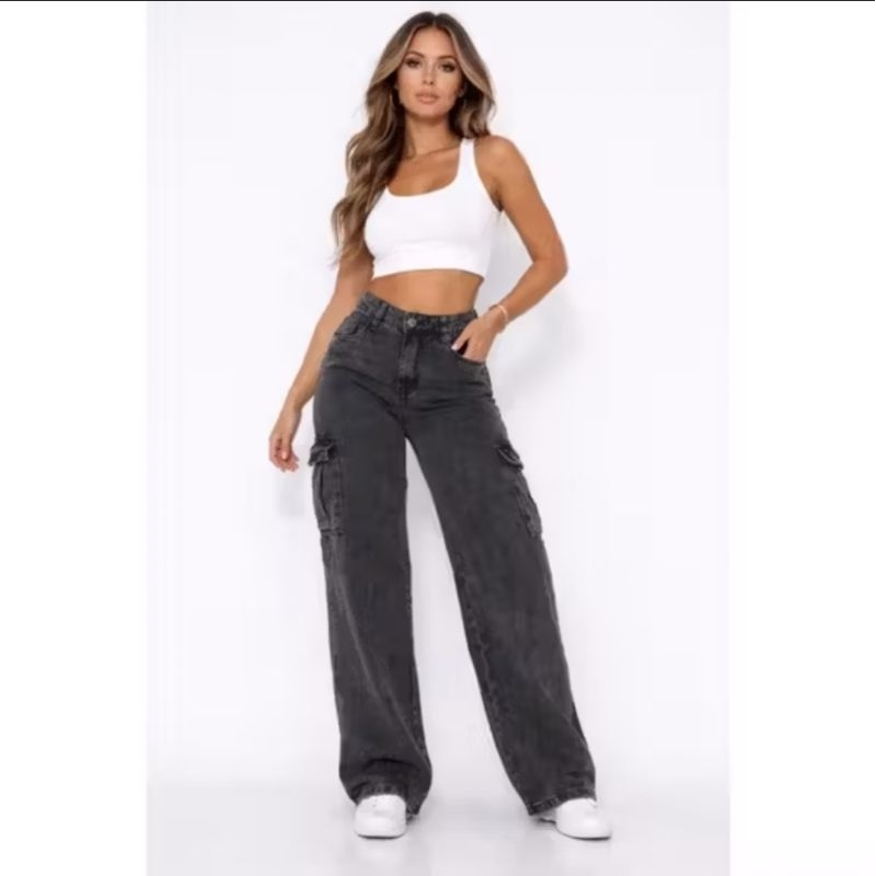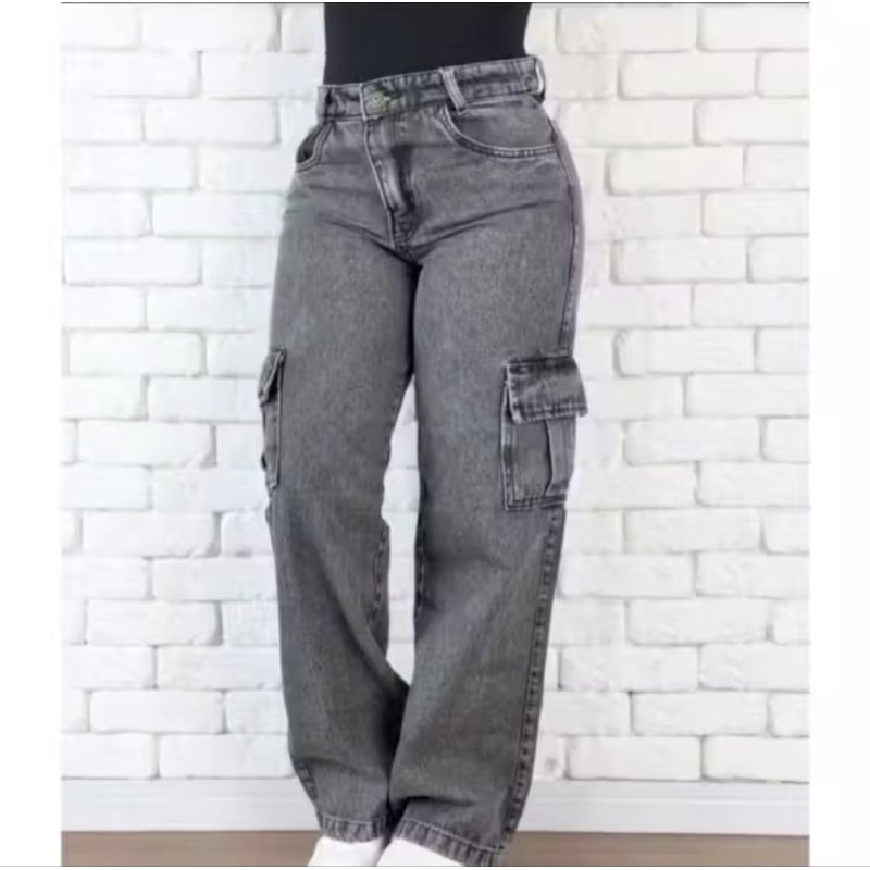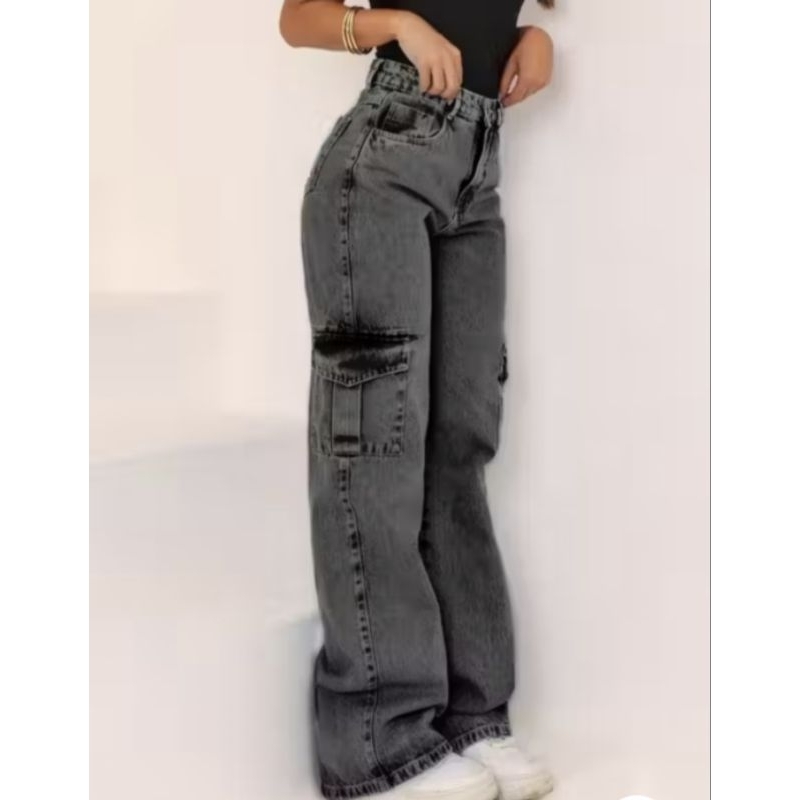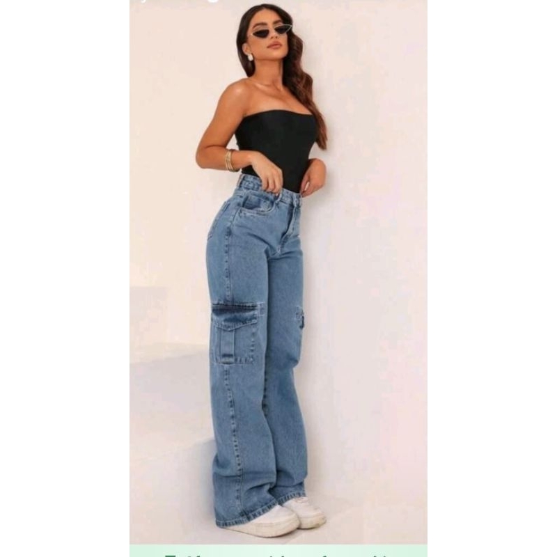 Calça Cargo Feminina Jeans Bolso Lateral Wid Leg 36 ao 44 Pantalona Cintura Alta