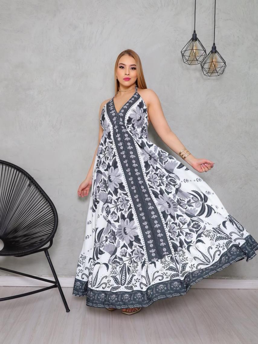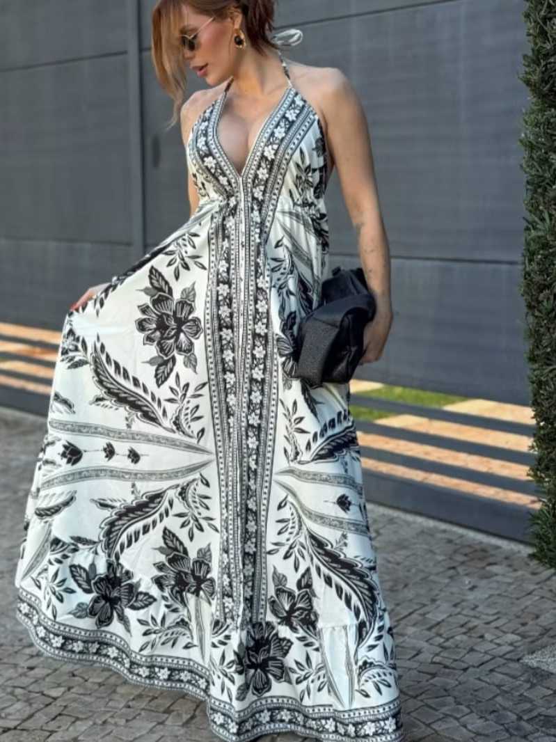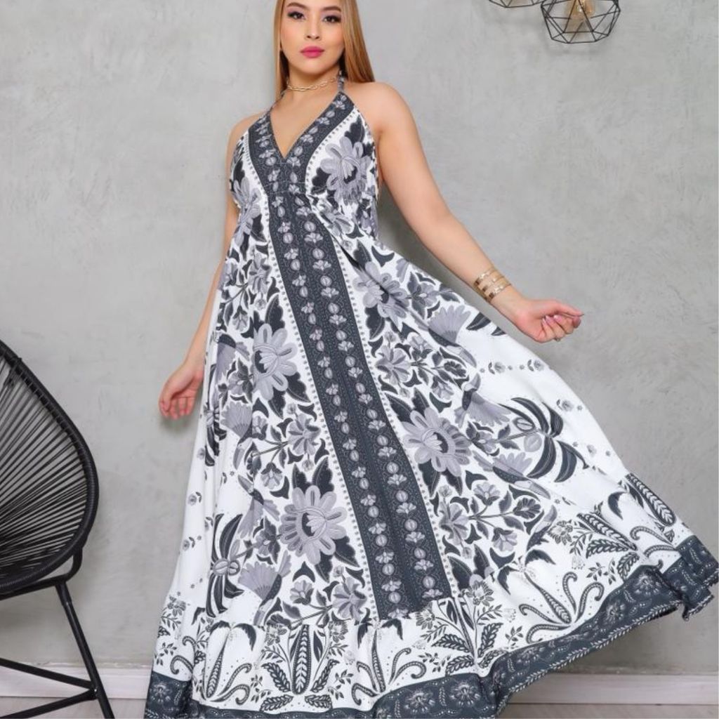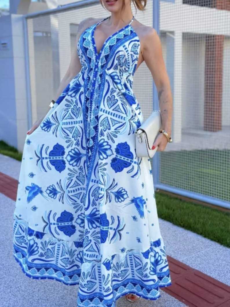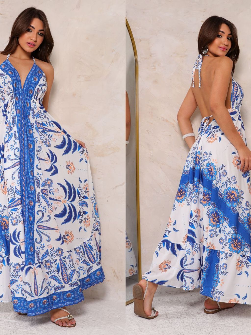 Vestido Feminino Longo Estampado Boho com Decote Halter e Costas Abertas