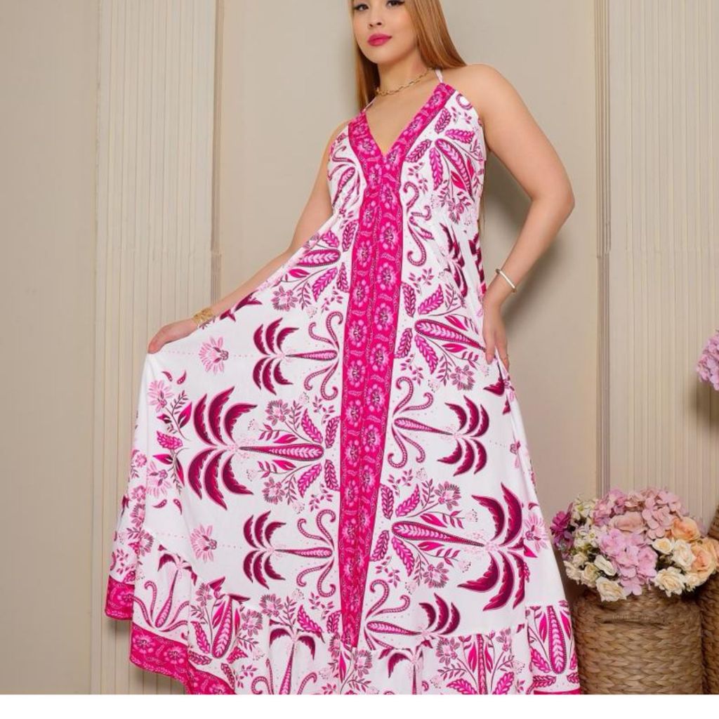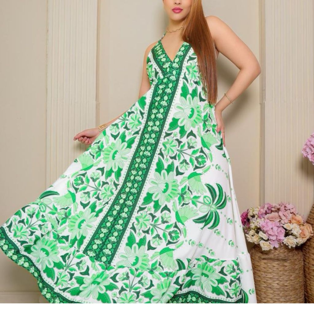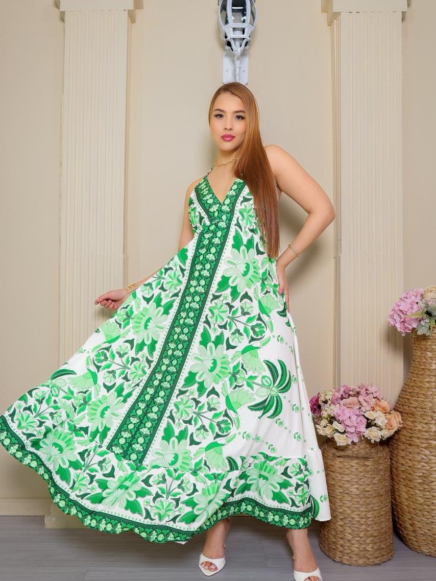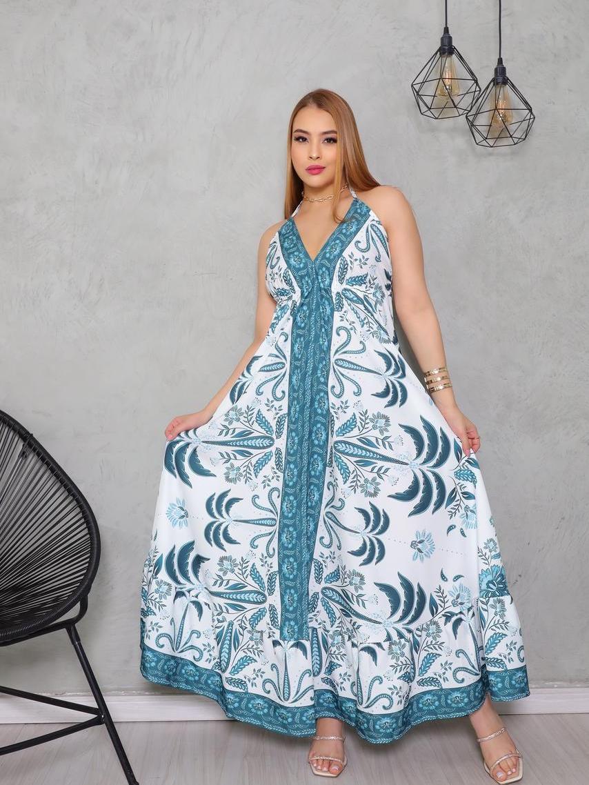 Vestido Feminino Longo Estampado Boho com Decote Halter e Costas Abertas