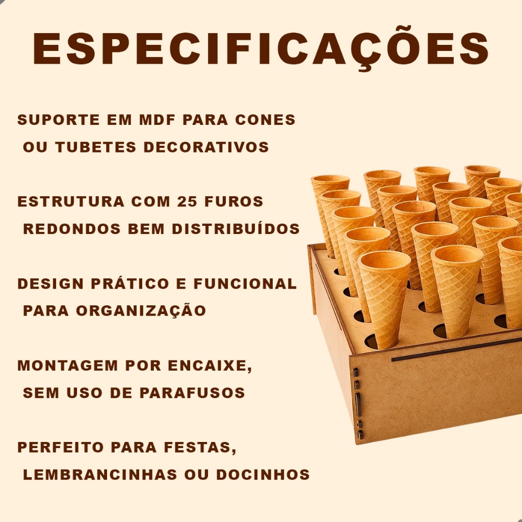 Porta Cones e Tubetes (25 FUROS) MDF Cru Suporte Festa Mesa de Doces Lembrancinhas Decoração Expositor Encaixe Fácil