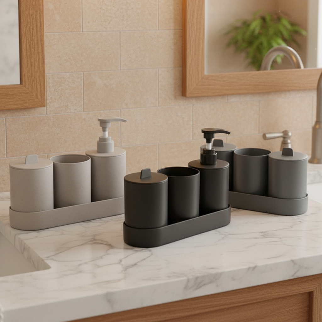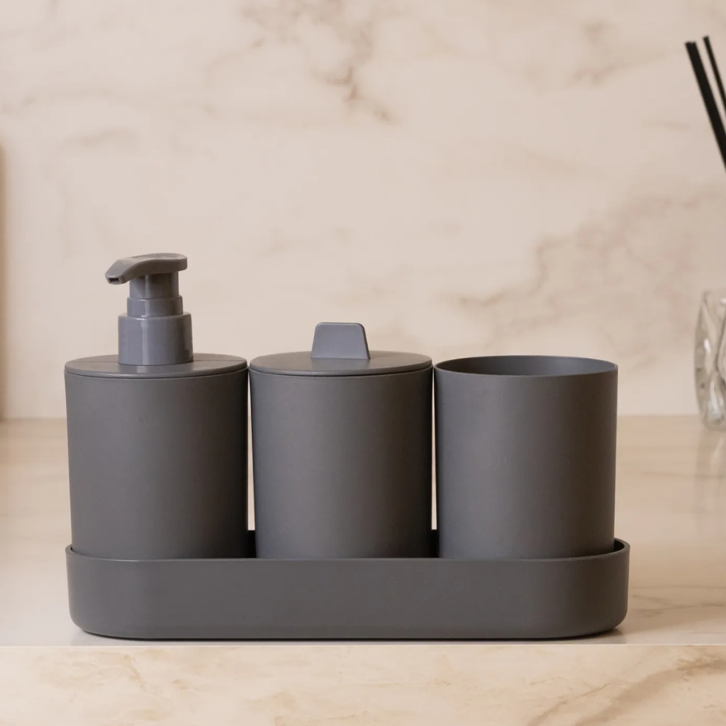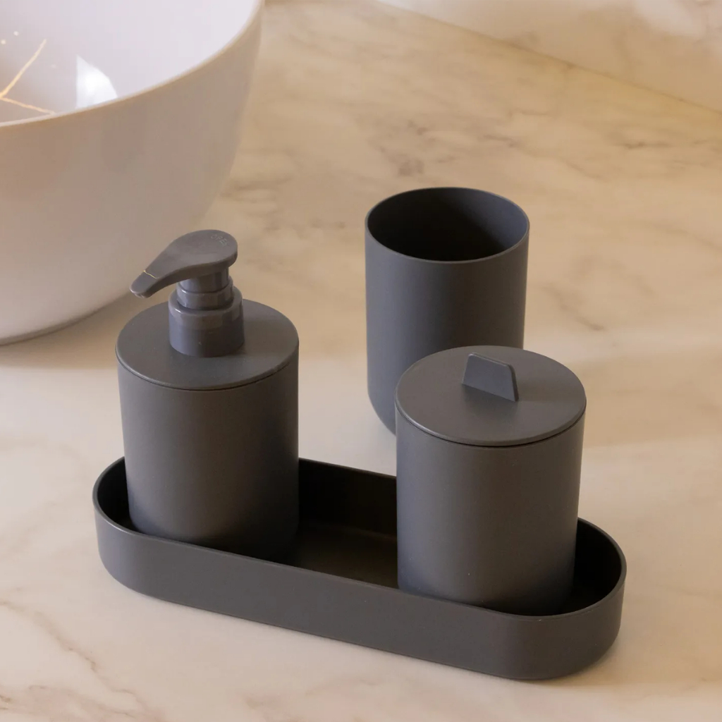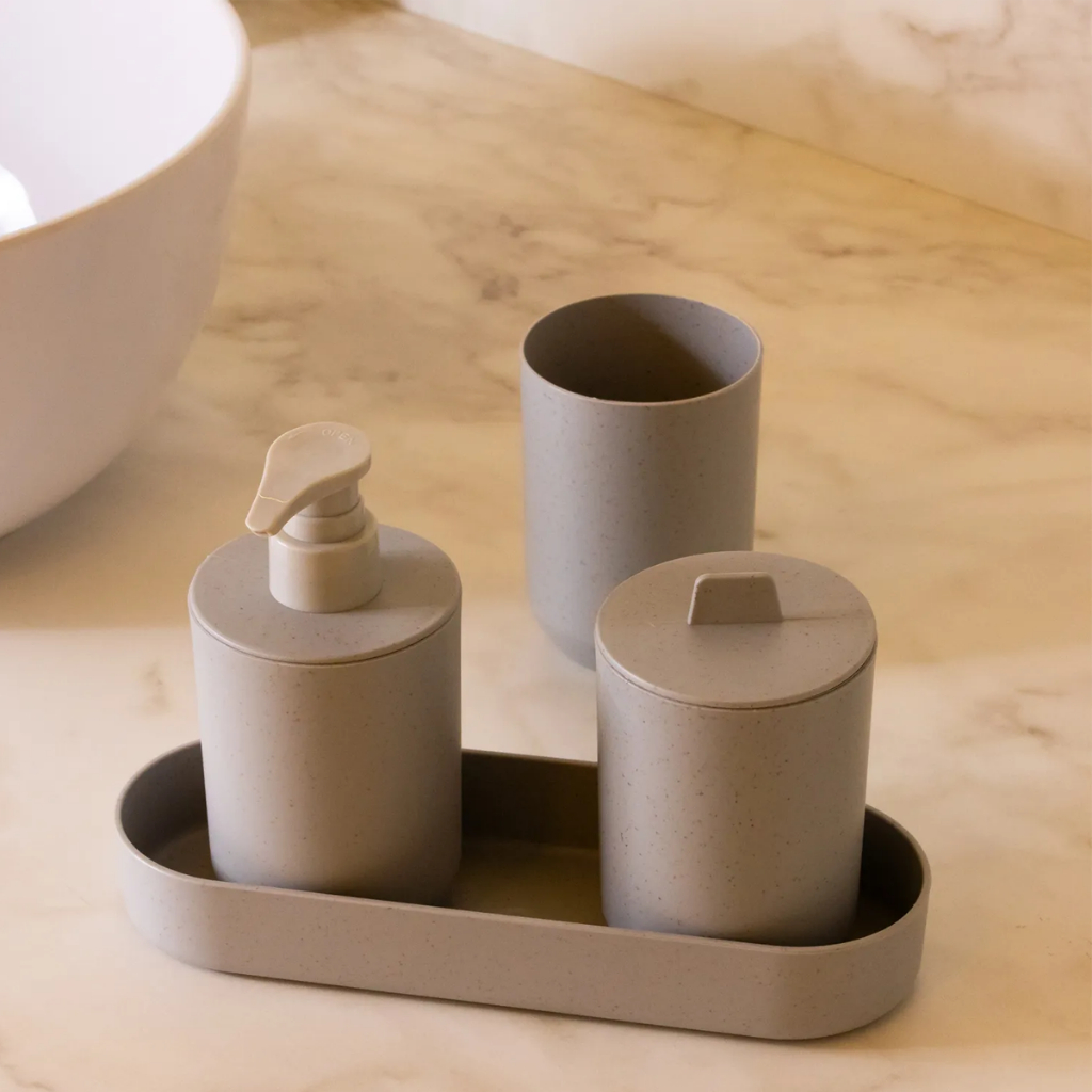 Kit 4 Peças Banheiro Saboneteira Porta Escovas Bandeja Fibra Bambu PP Pia Lavabo Lyor Dispenser Sabonete Liquido Algodao