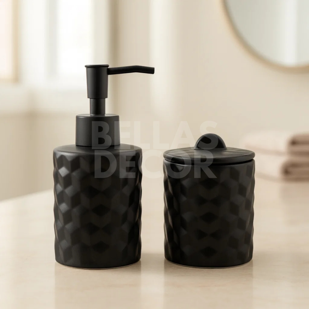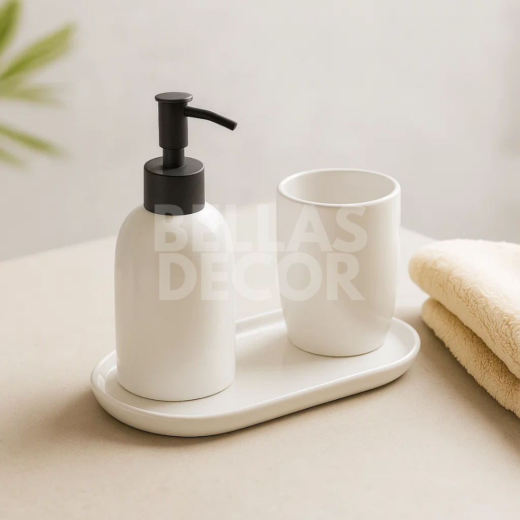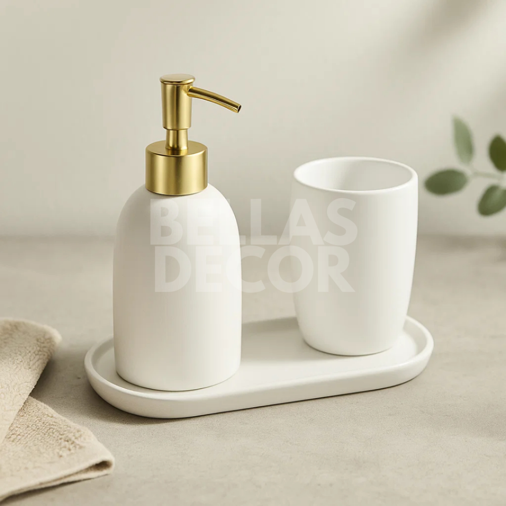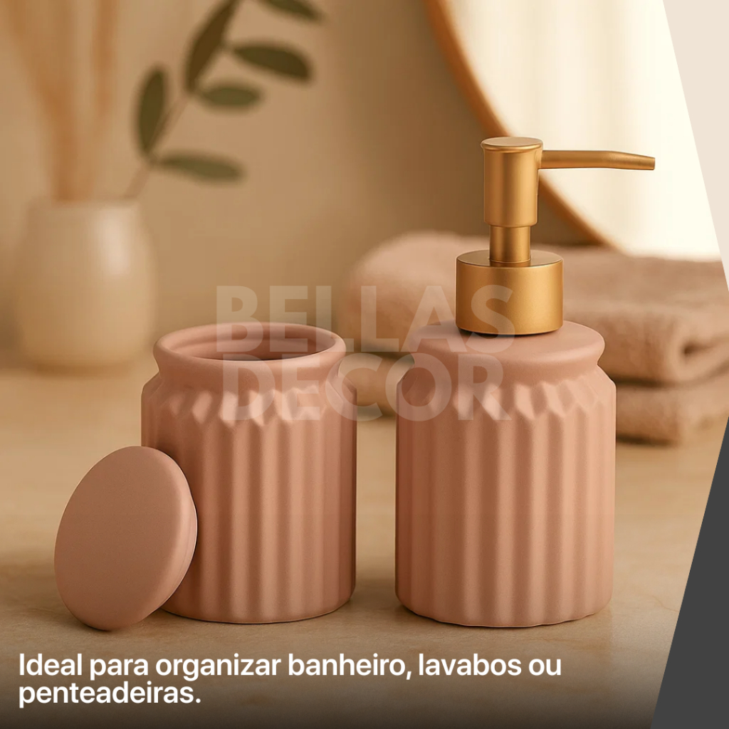 Conjunto de Banheiro LYOR 2 Peças em Cerâmica - Stripes Nud – Porta Sabonete, Porta Algodão