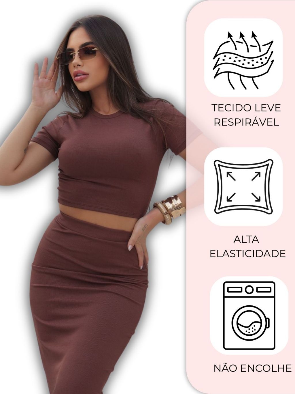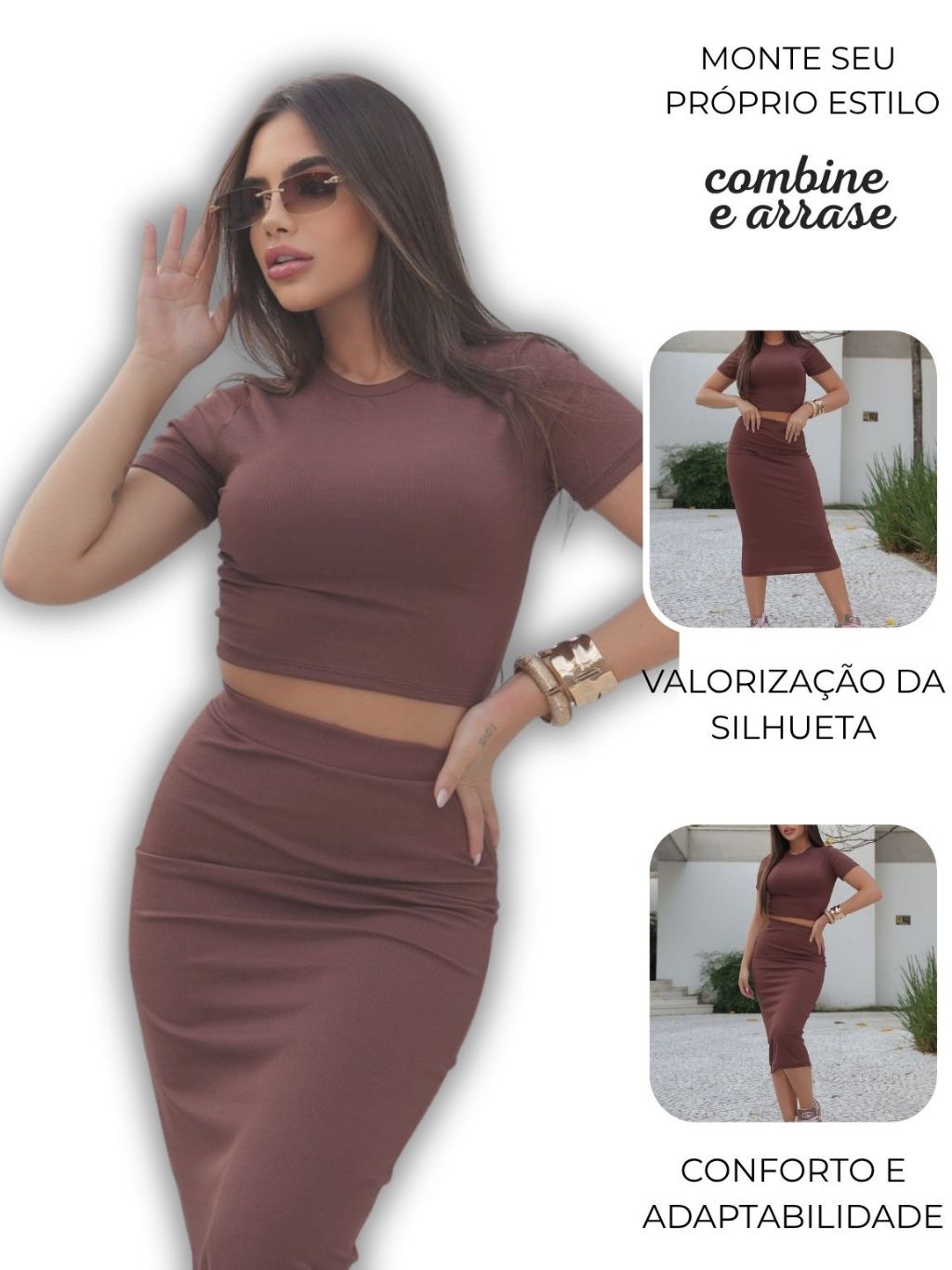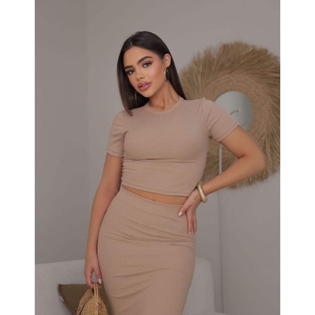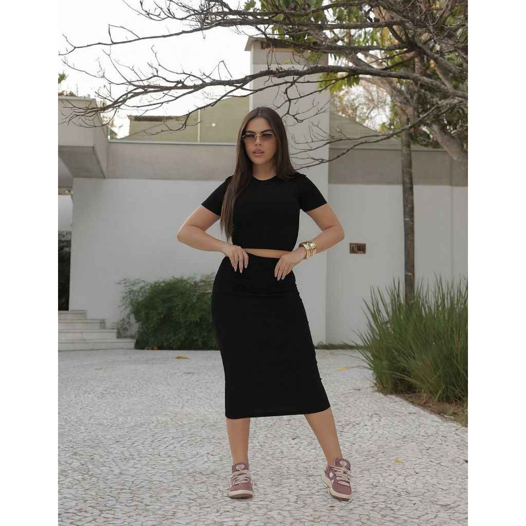 Conjunto Feminino Cropped + Saia Midi Casual Ribana Canelada Elegante.
