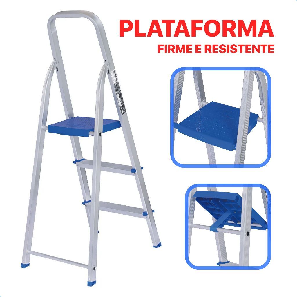 Escada 3 Degraus Alumínio Dobrável Resistente Doméstica Suporta 120kg MOR