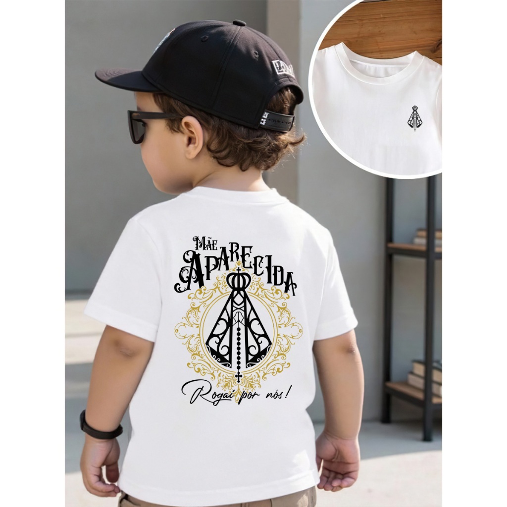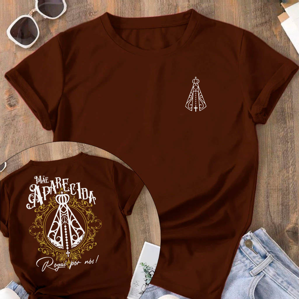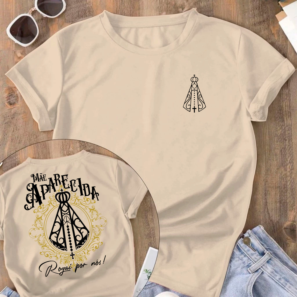 Camiseta Tradicional Adulto Infantil Jesus petalas de rosas Maria Mãe Aparecida Religiosa Catolica Cristã 100% Algodão