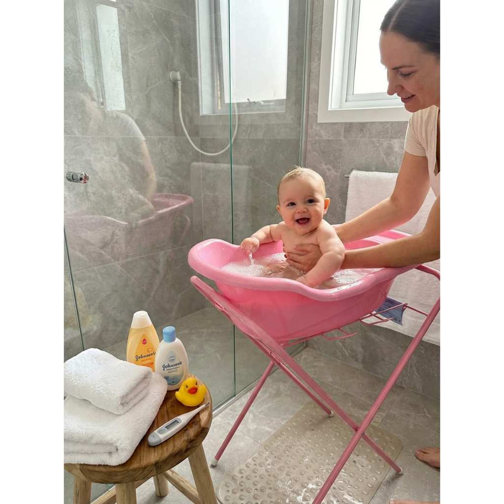 Banheira de Bebê com Suporte de Chão Retrátil Seguro Suporta 18kg - Rosa