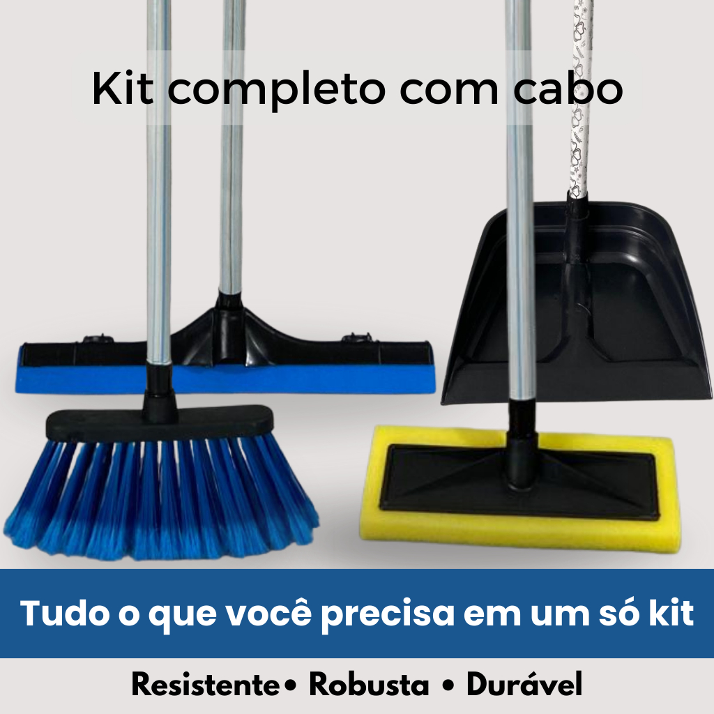 Kit Limpeza 4 Peças com Cabo Vassoura + Rodo + Pá de Lixo + Limpa Azulejo