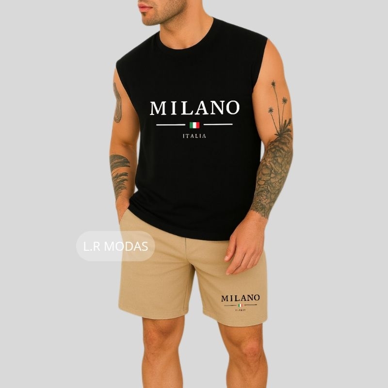 Conjunto Regata Machão Milano Italia Camisa Masculina Camiseta Algodão Bermuda Moletom com Bolso Estampado