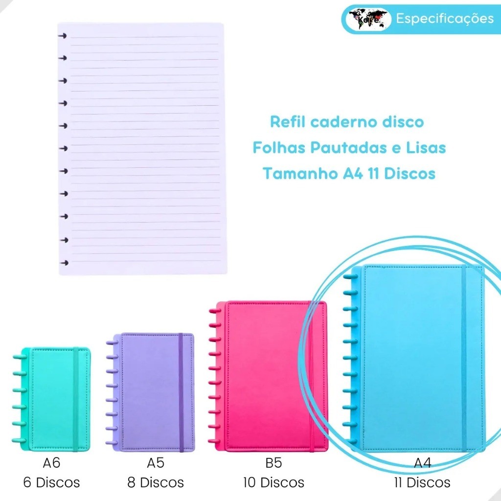 Refil Caderno Inteligente 11 Discos Grande Pautado 100 200 300 Folhas 90g Compatível