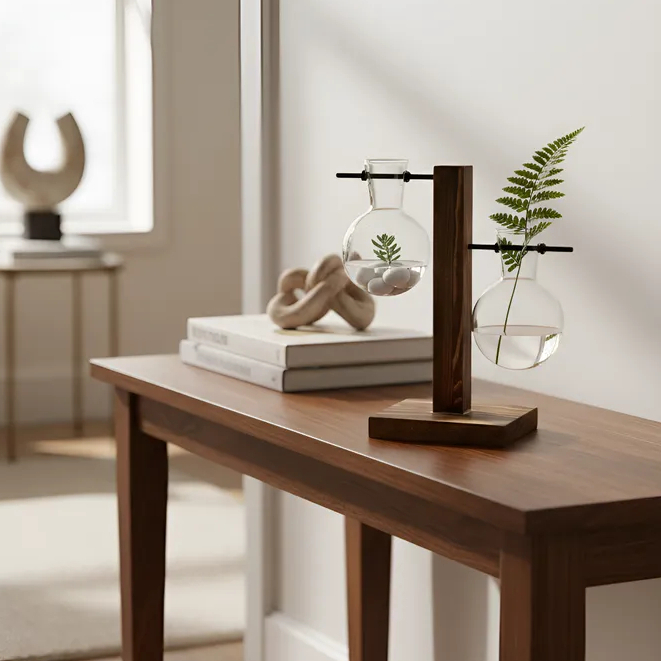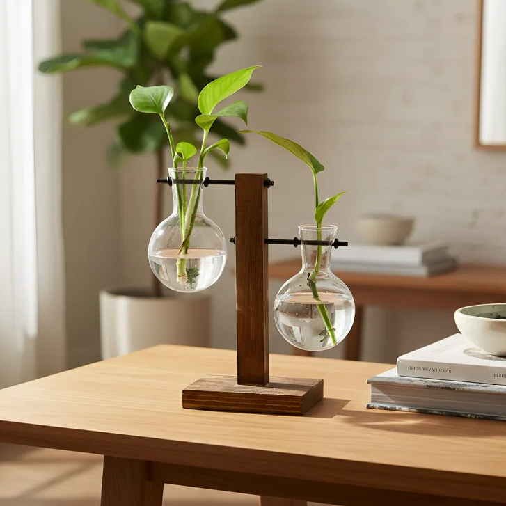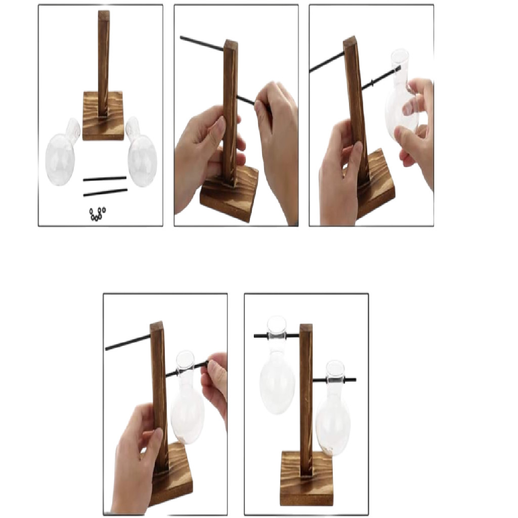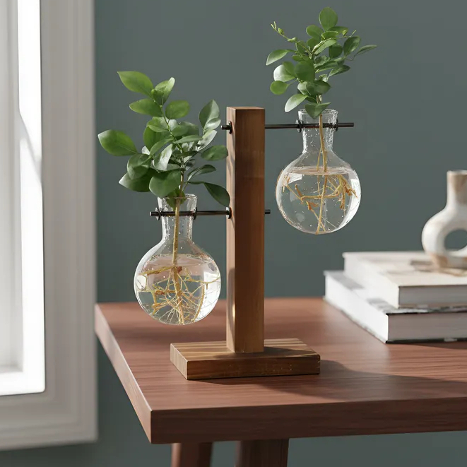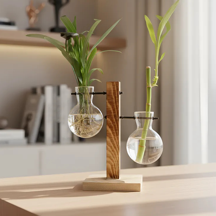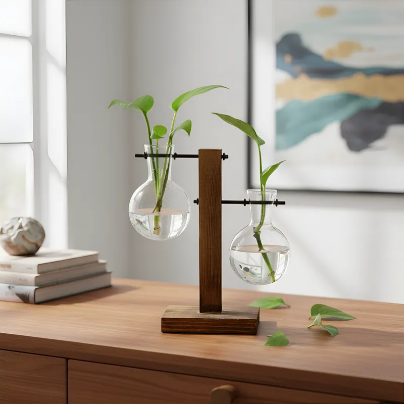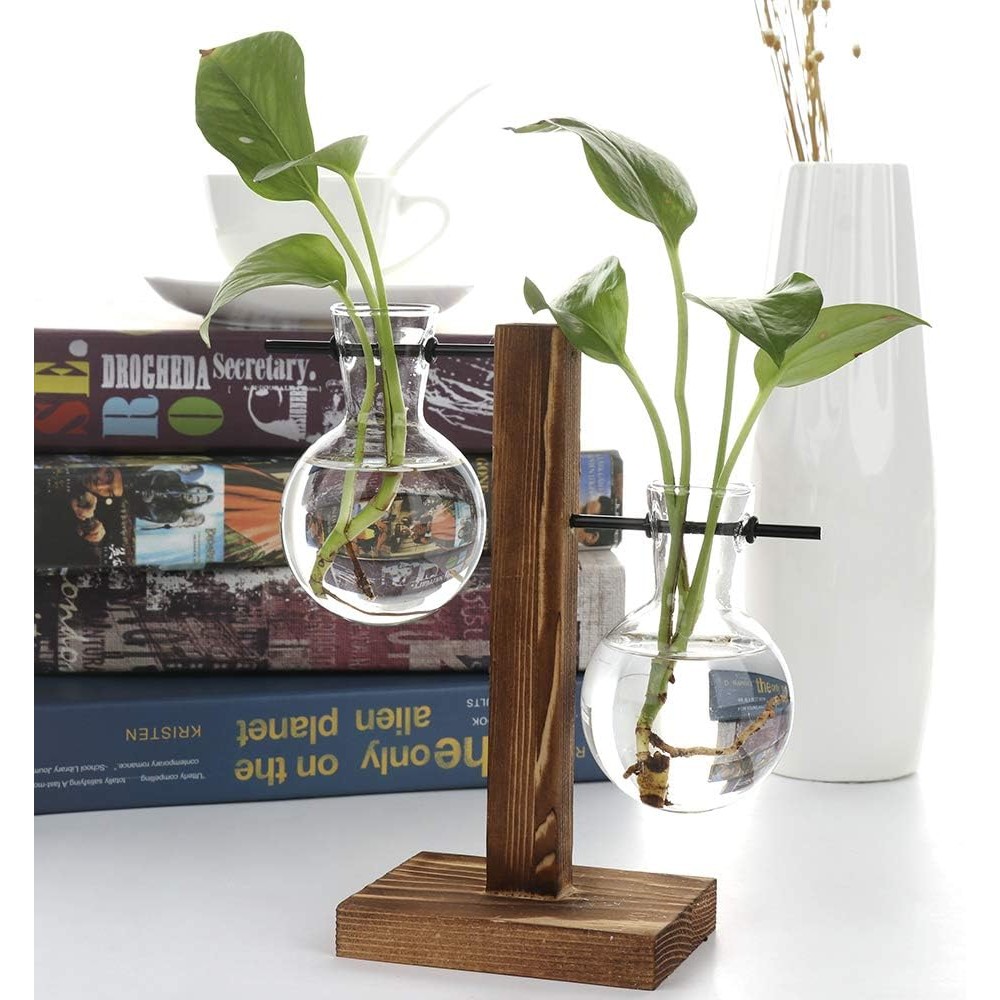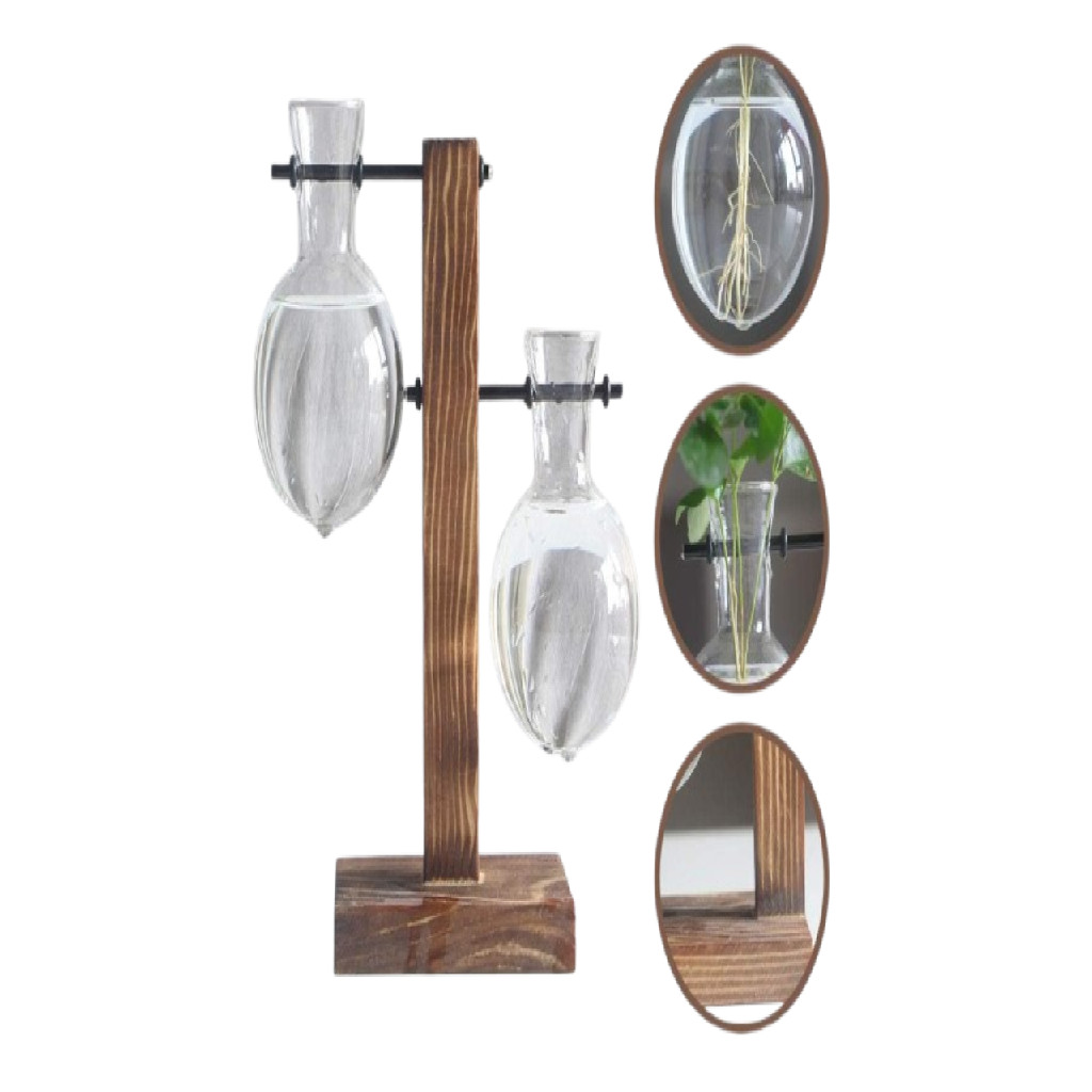 Vaso De Vidro Duplo Bulbo Com Suporte De Madeira Decorativo