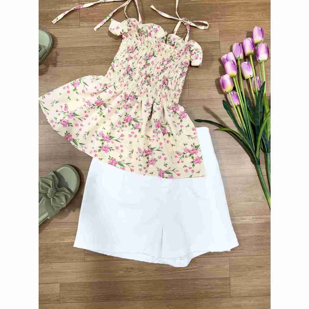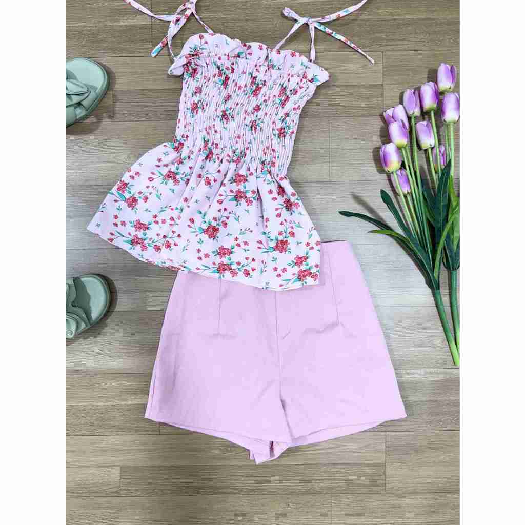 Conjunto feminino de duas peças, blusa estampada sem alças e shorts lisos, roupa casual de verão
