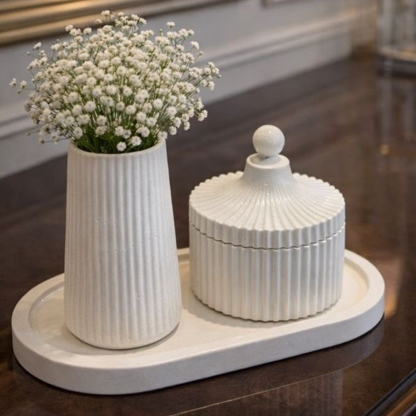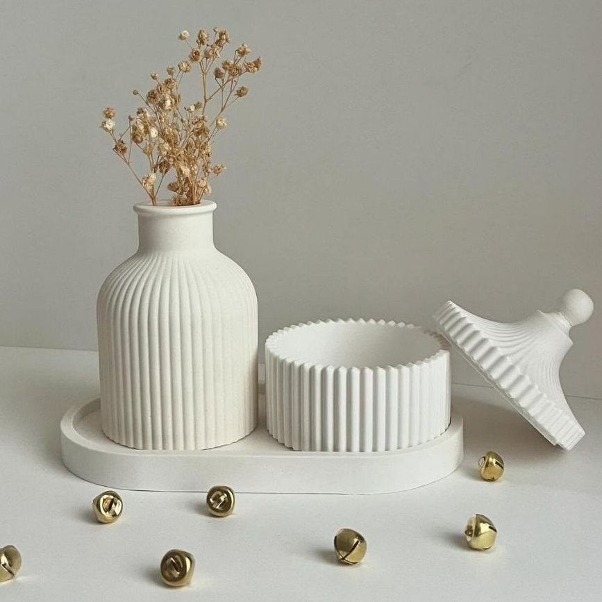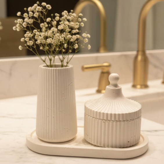 KIT DECORATIVO FEITO EM CIMENTO BRANCO BANDEJA, VASO, PORTA-JÓIAS MINIMALISTA DE LUXO