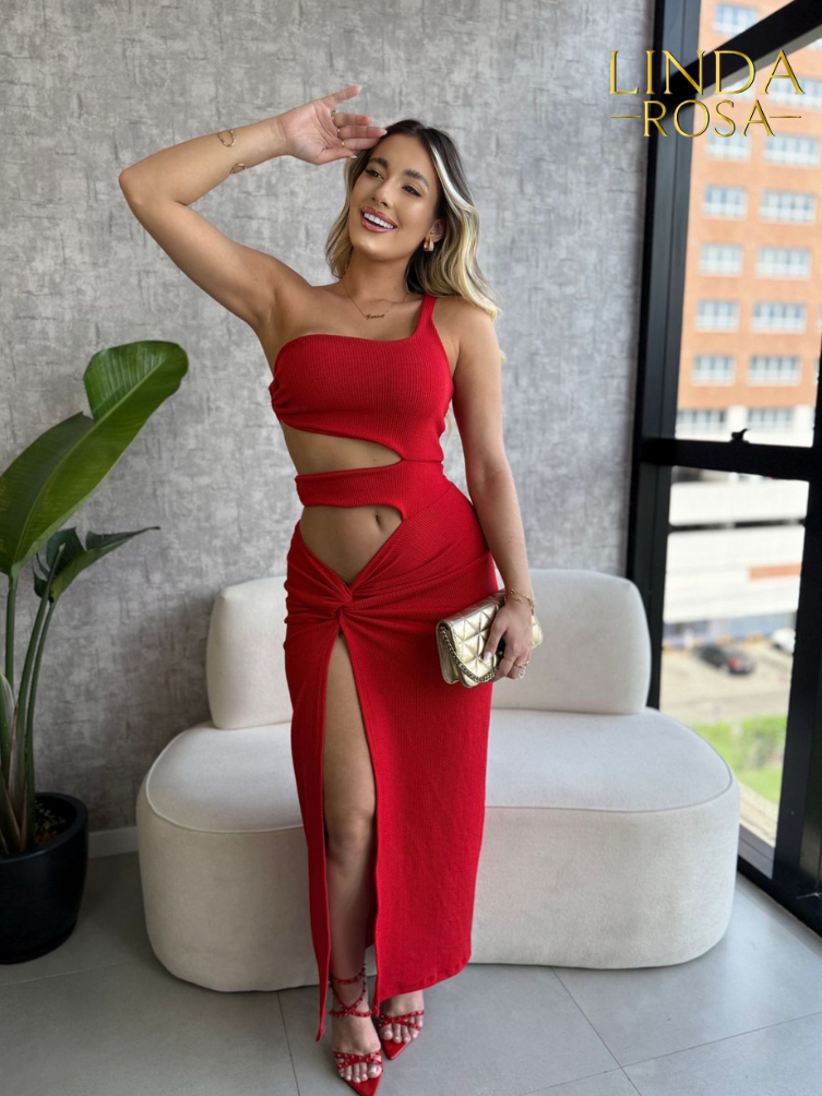 Vestido Feminino com Recortes e Nó Frontal com Abertura– Moda Festa 2025