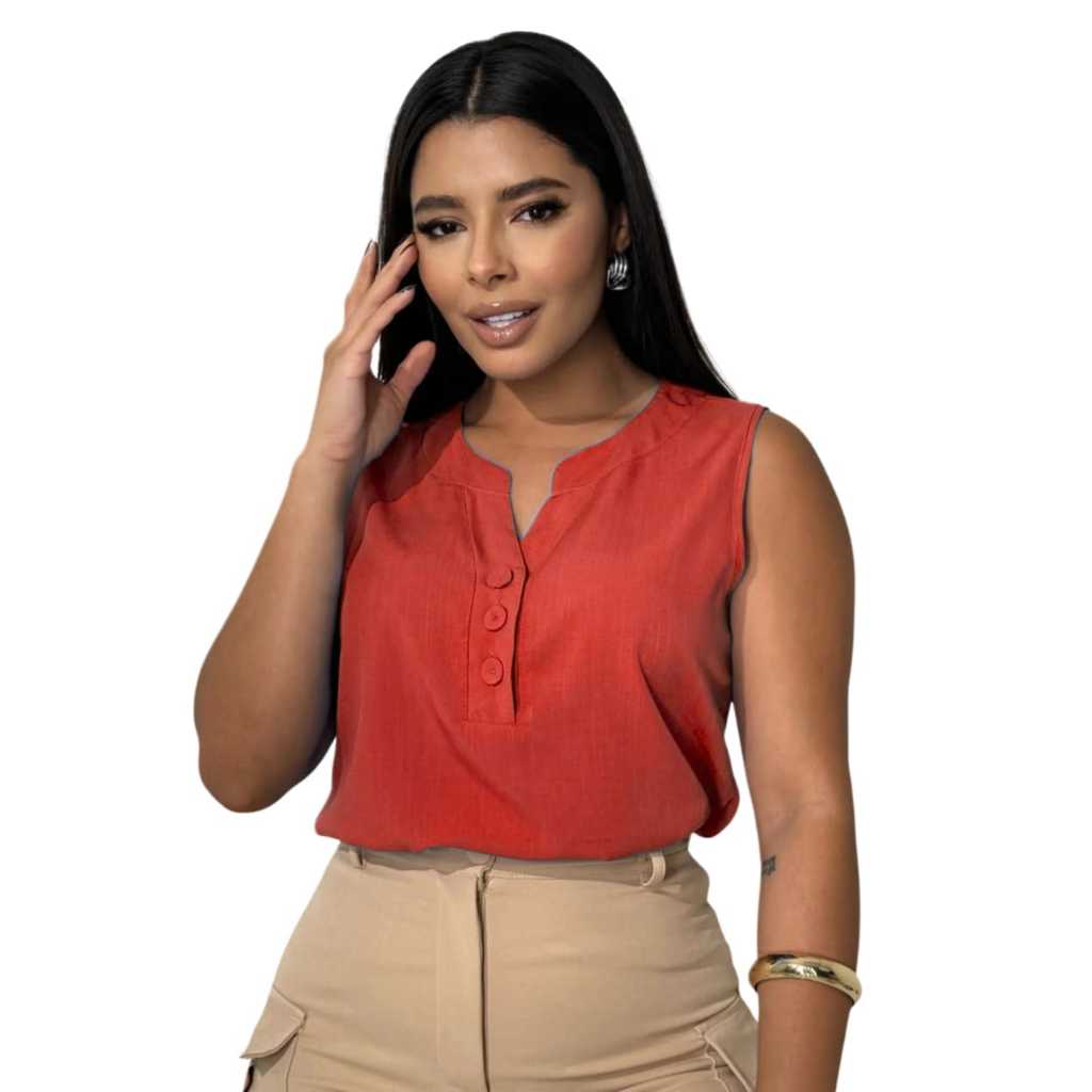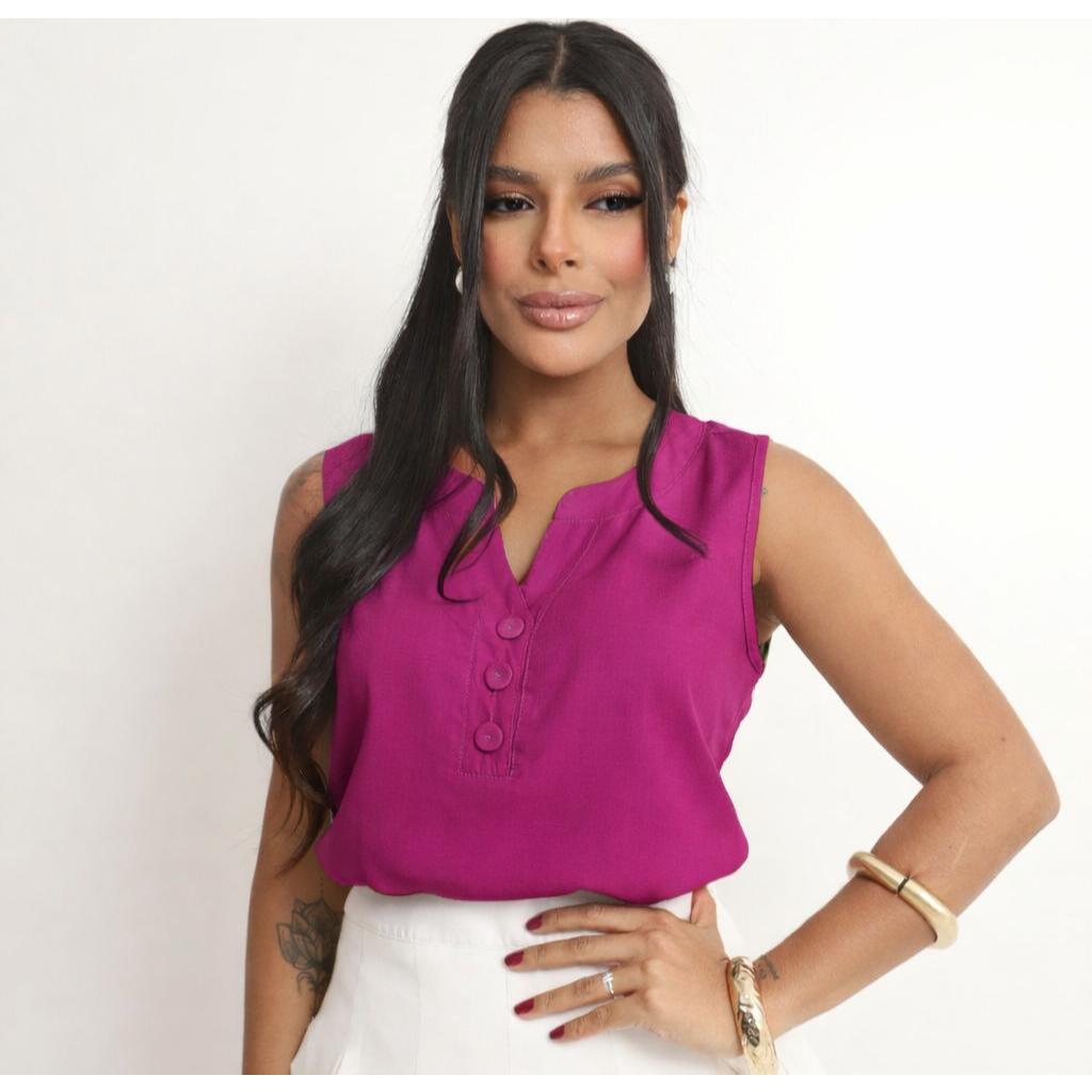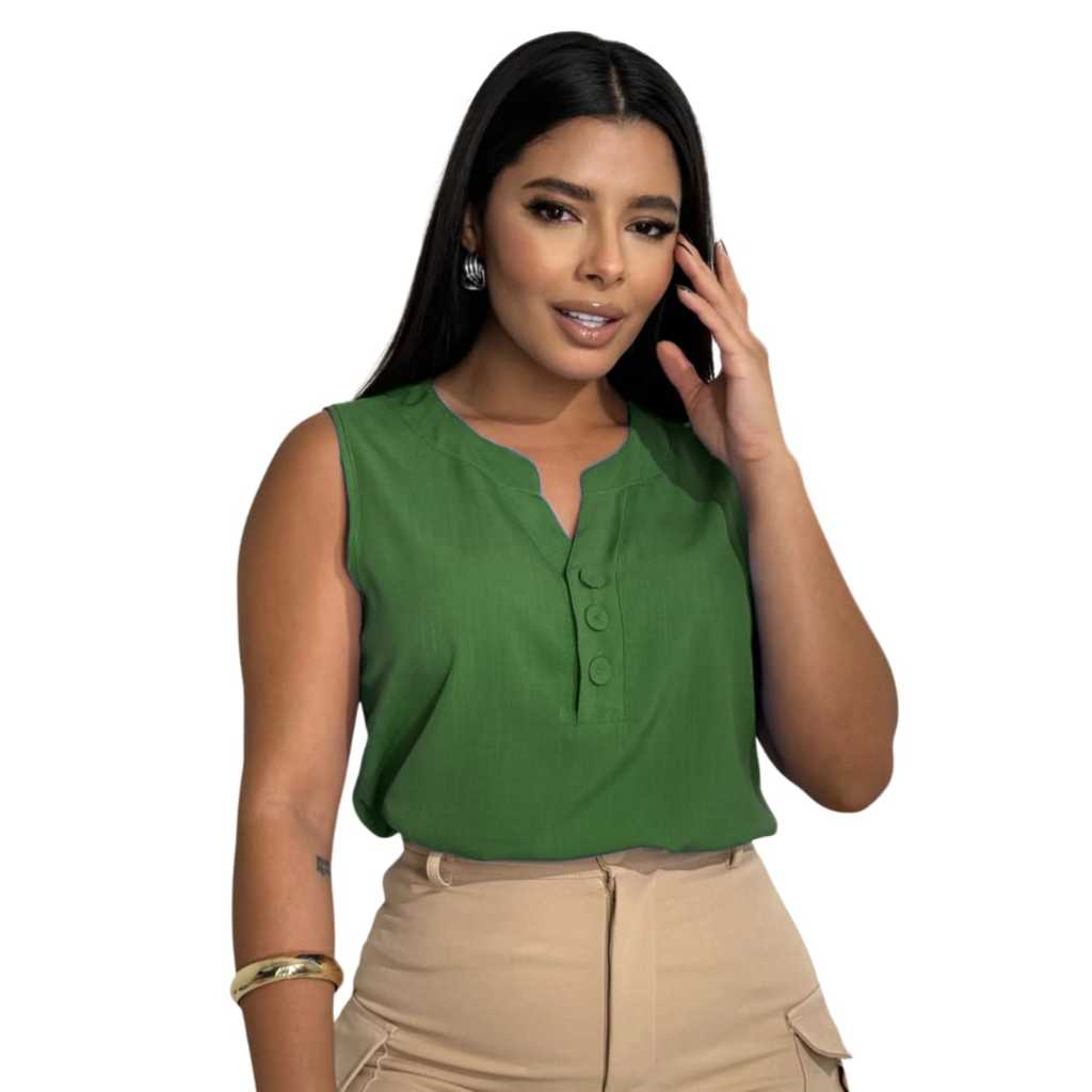 Blusa Regata Feminina Viscolinho Confortável -- M G GG - Decote V com Botões Encapados - Moda Verão