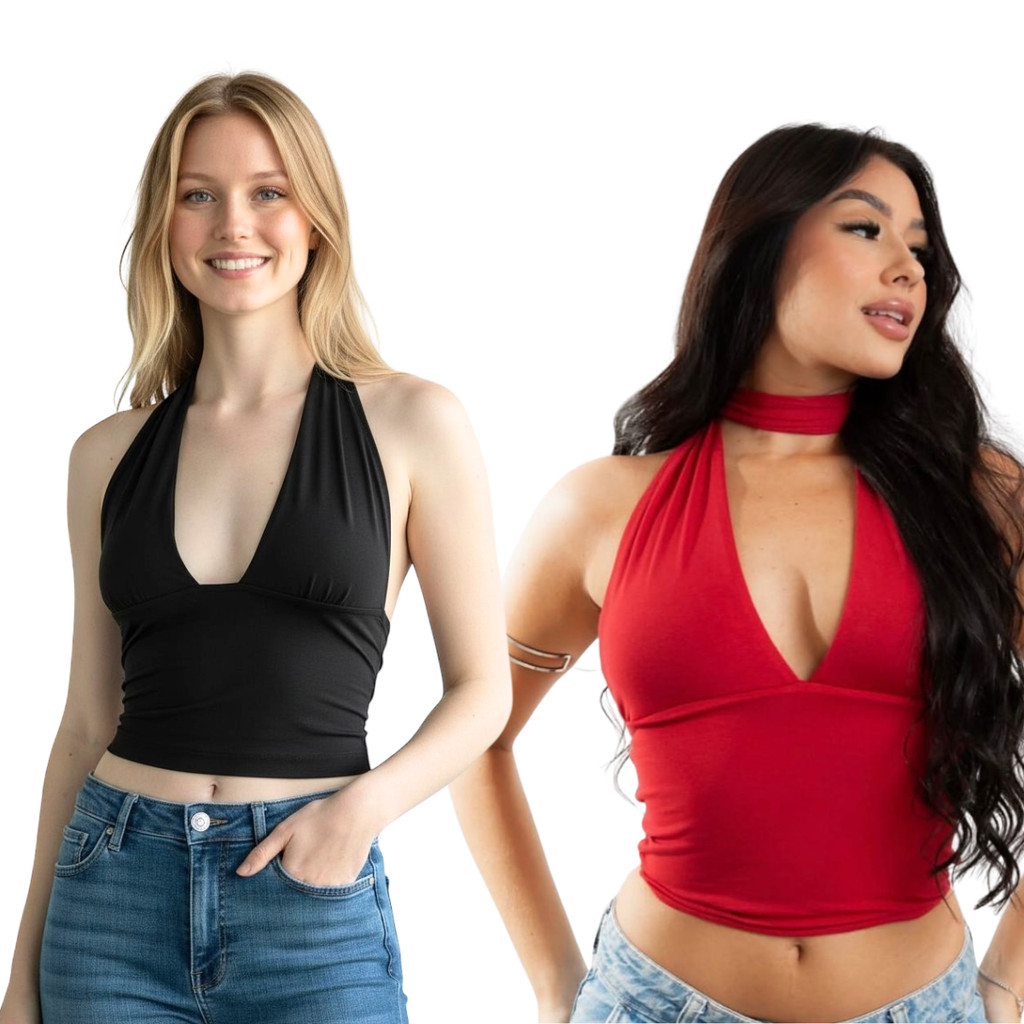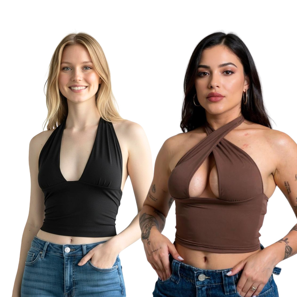 Kit 2 Blusa Cropped Feminino Top Com Amarraçao Multiformas Decote Forrado Festa Premium Decotado Suplex Slim Sustentação