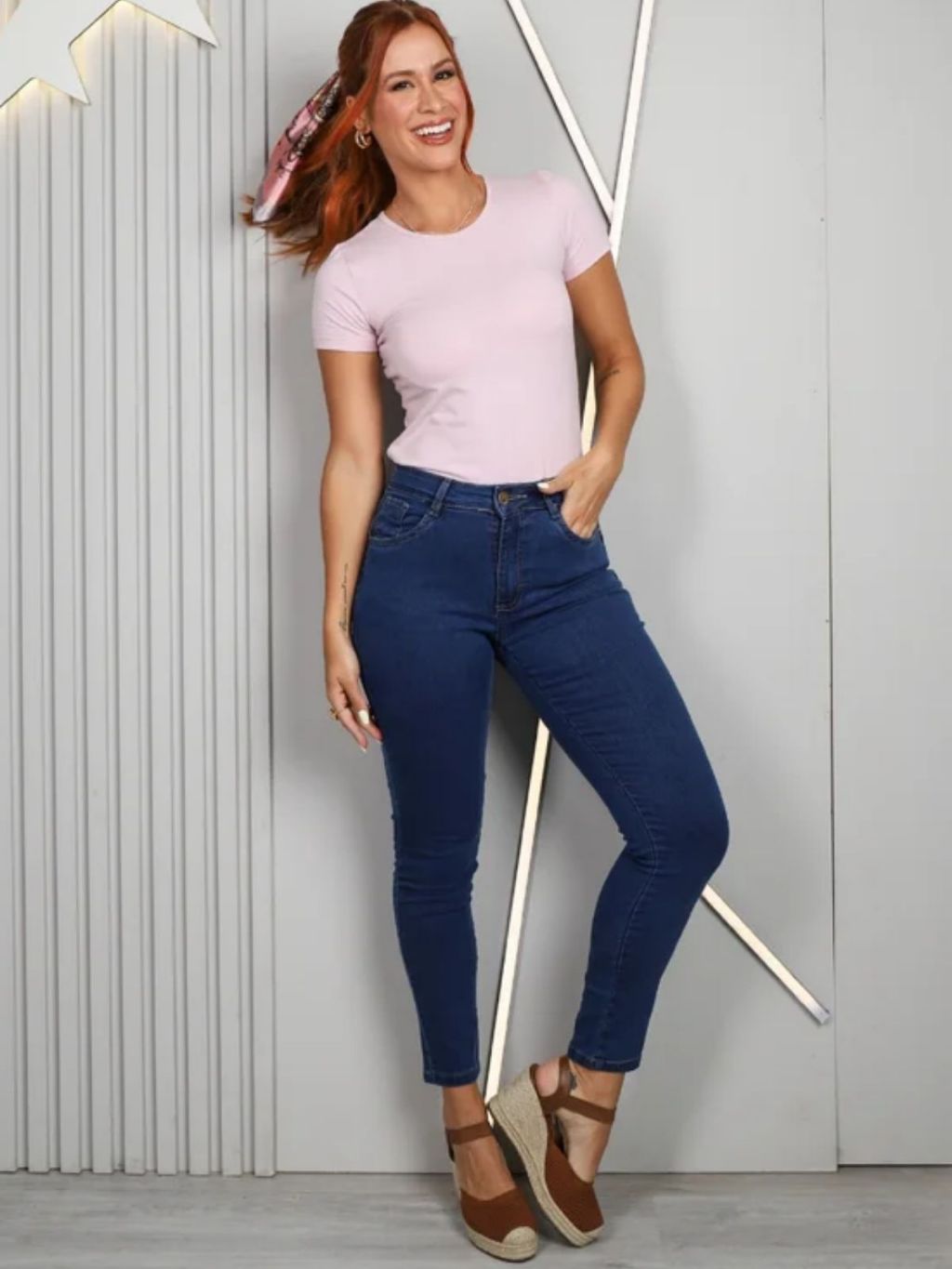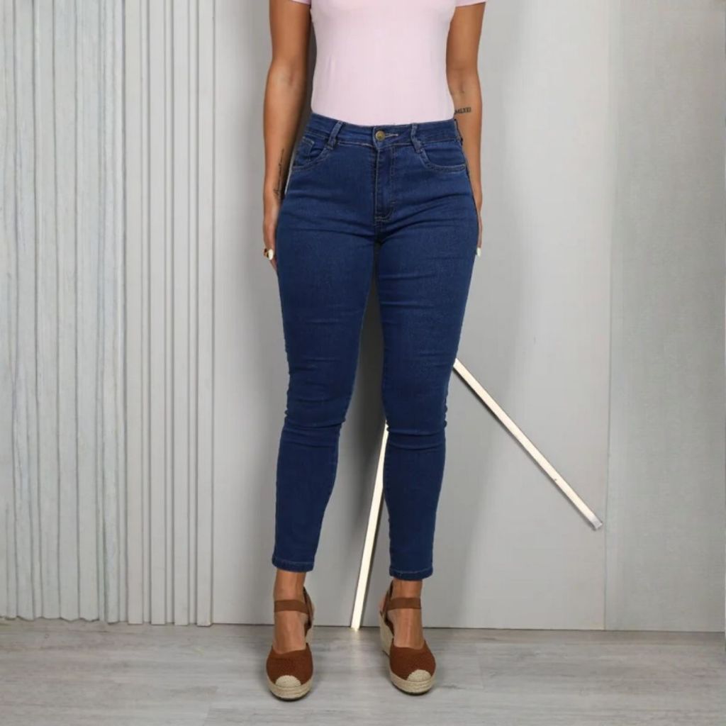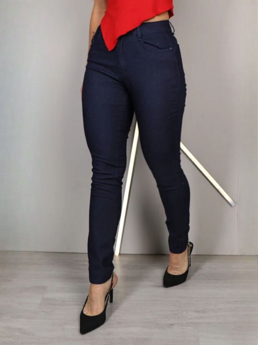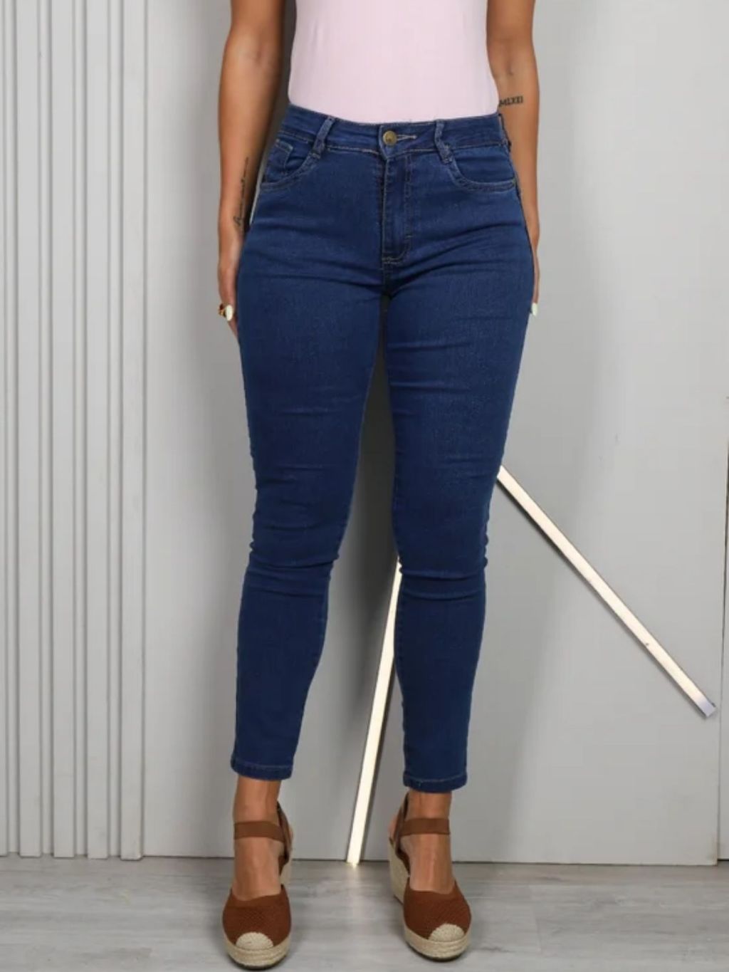 Calça Feminina Jeans Skinny Elastano Reta Cintura Media e Alta Empina Bumbum Modeladora Bolsos
