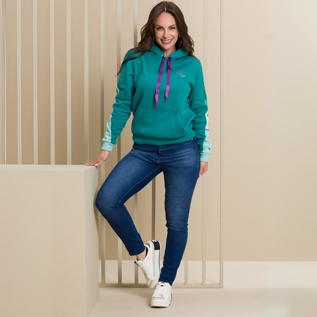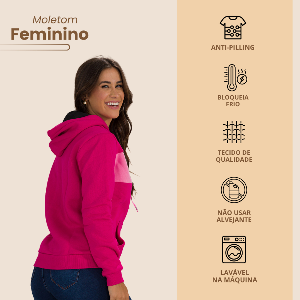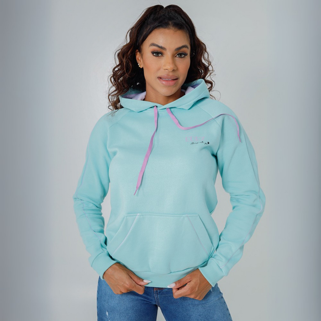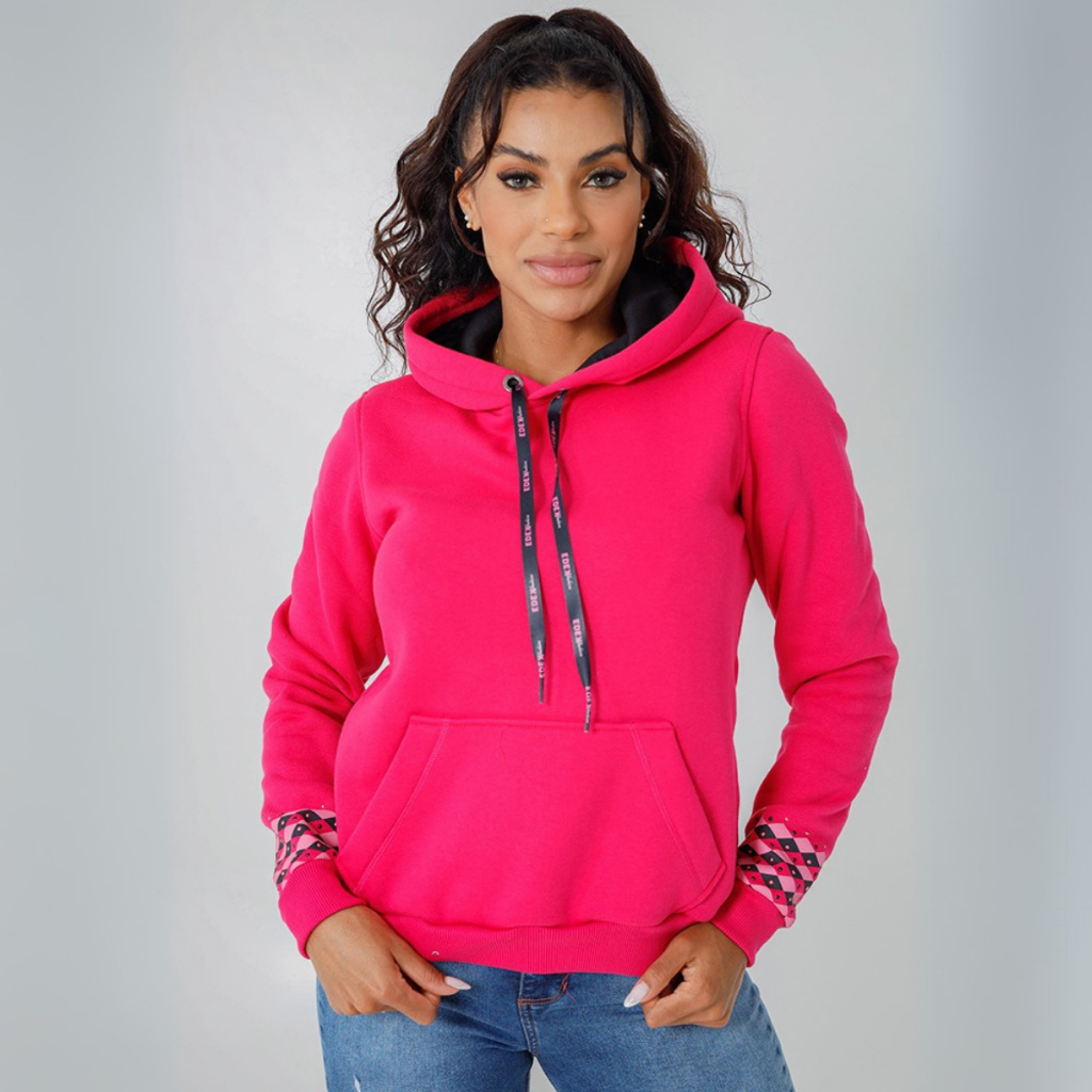 Moletom Feminino Estampado com Capuz Bolso Canguru Forro Peluciado Punho e Barra Canelados Casaco