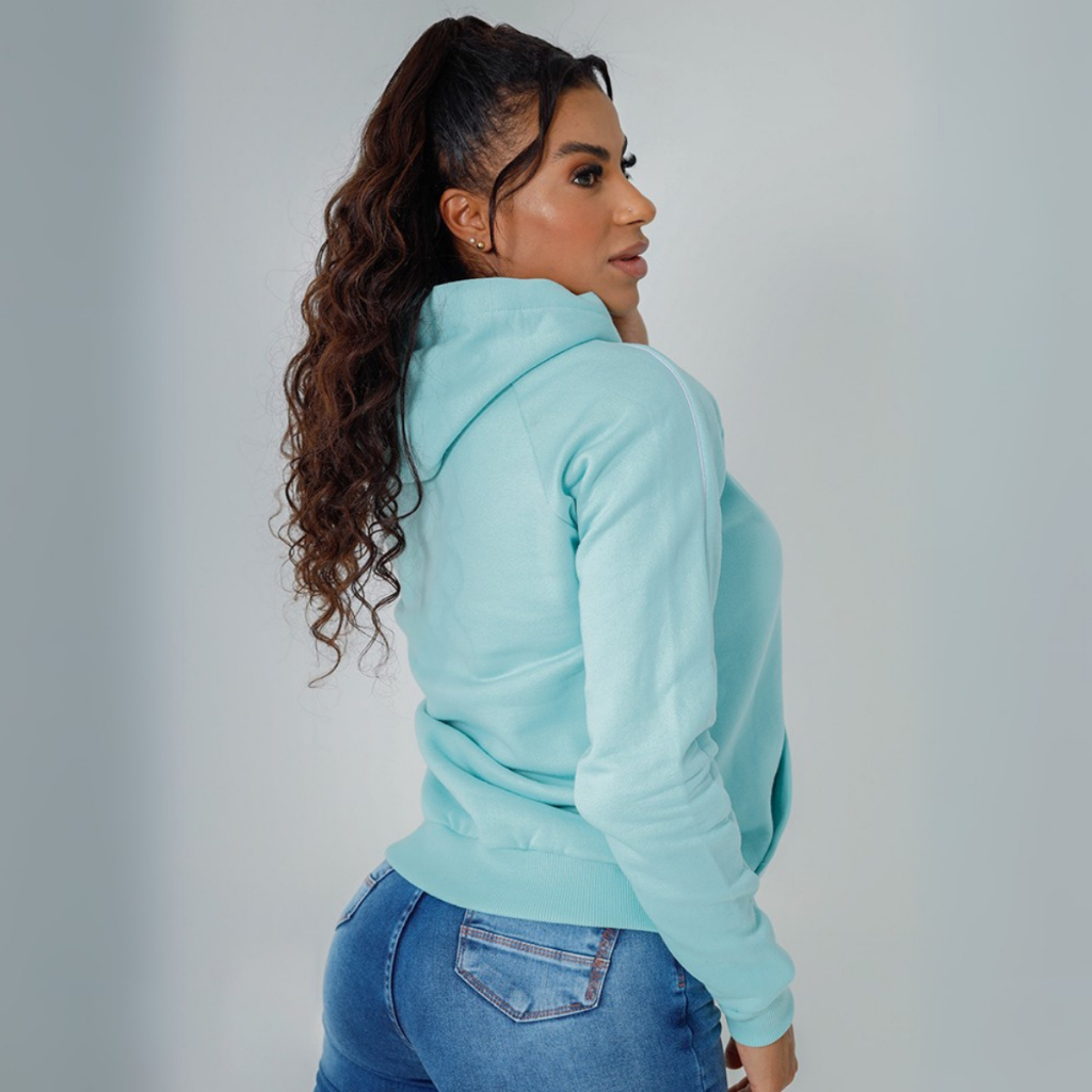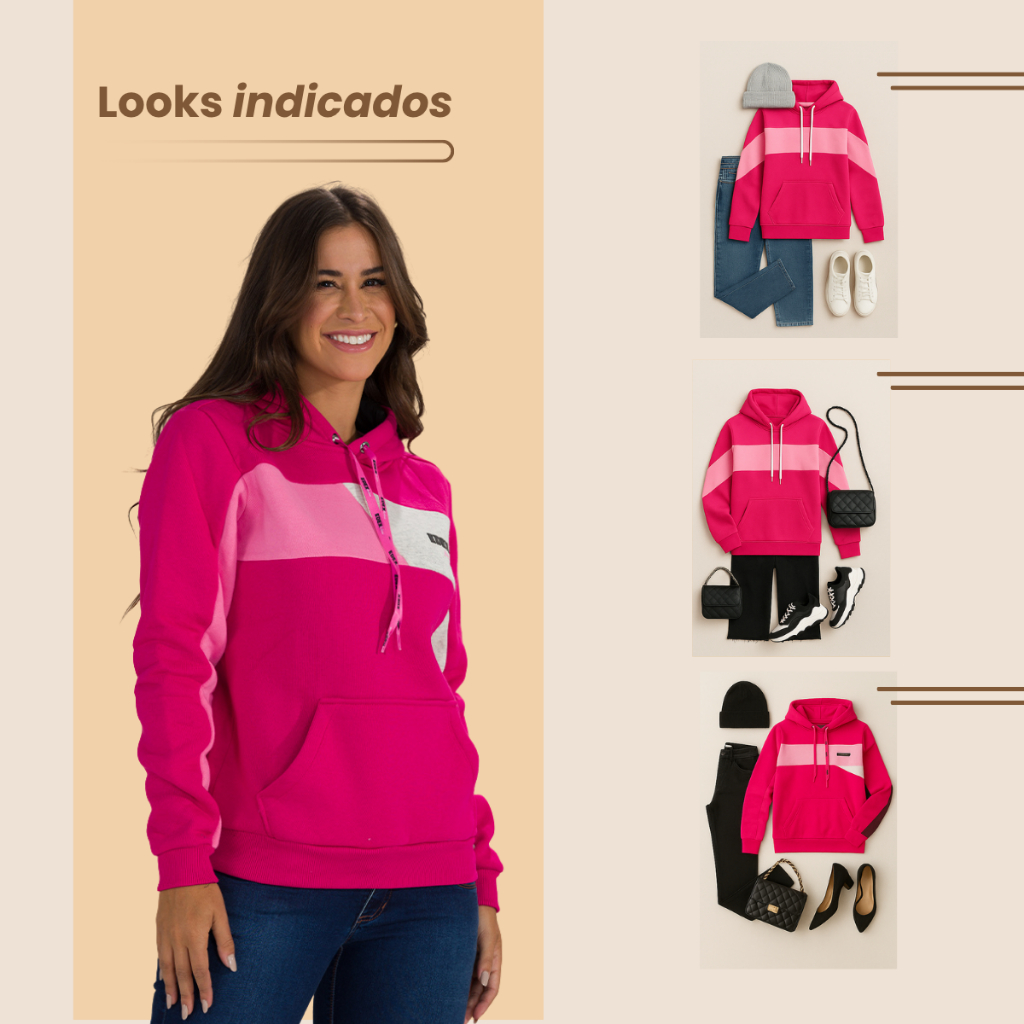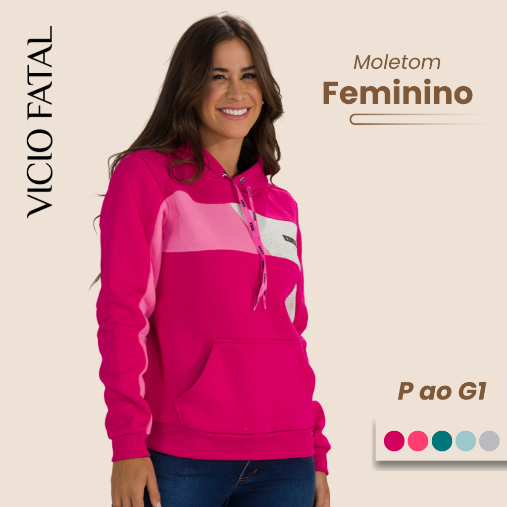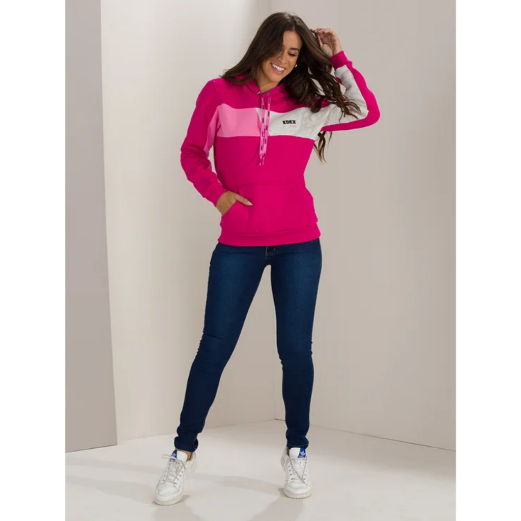 Moletom Feminino Estampado com Capuz Bolso Canguru Forro Peluciado Punho e Barra Canelados Casaco