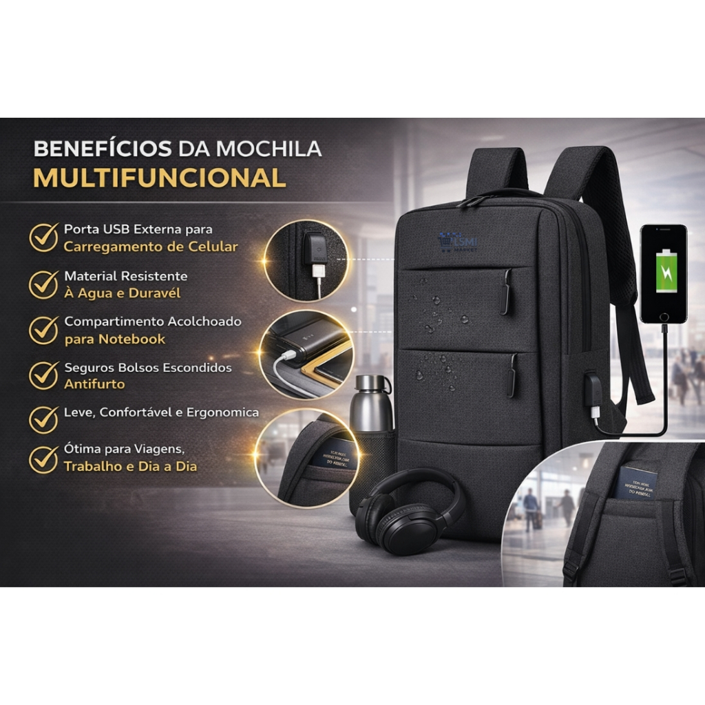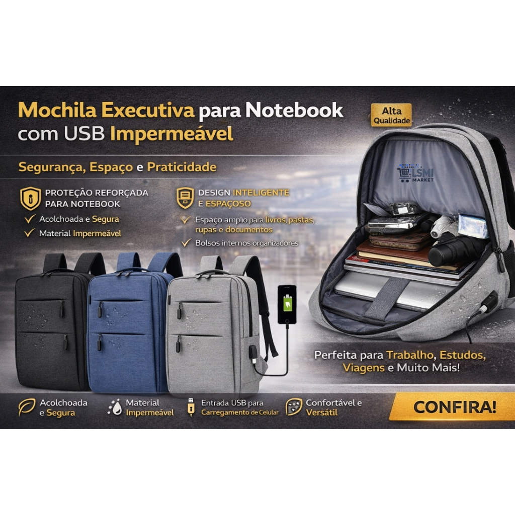 Mochila Notebook Impermeável Masculina Feminina Reforçada Grande Escolar Faculdade Viagem Trabalho Executiva Usb