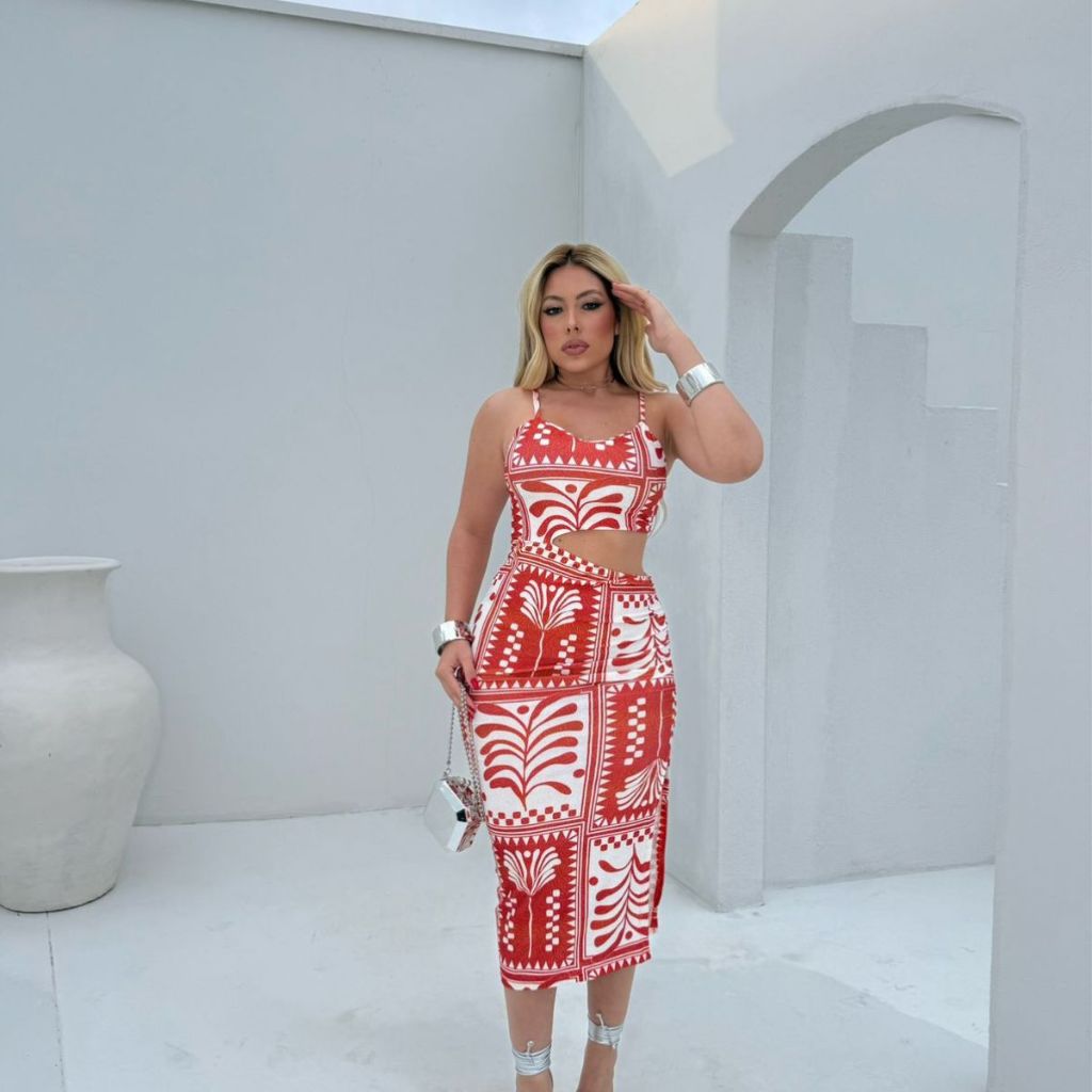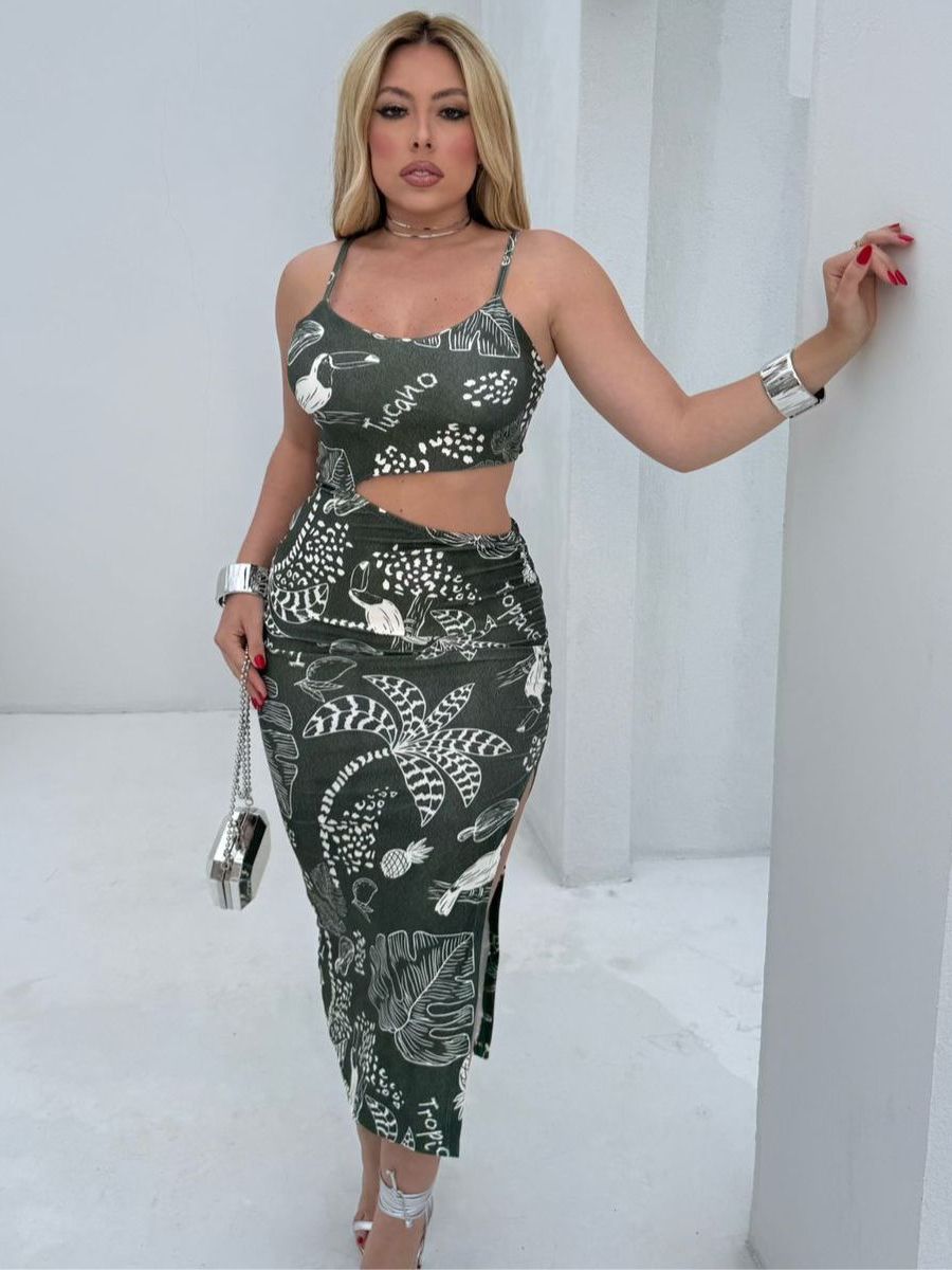 Vestido Midi com Bojo e fendas laterais detalhes nas costas abertura na barriga, Estampado moda feminina