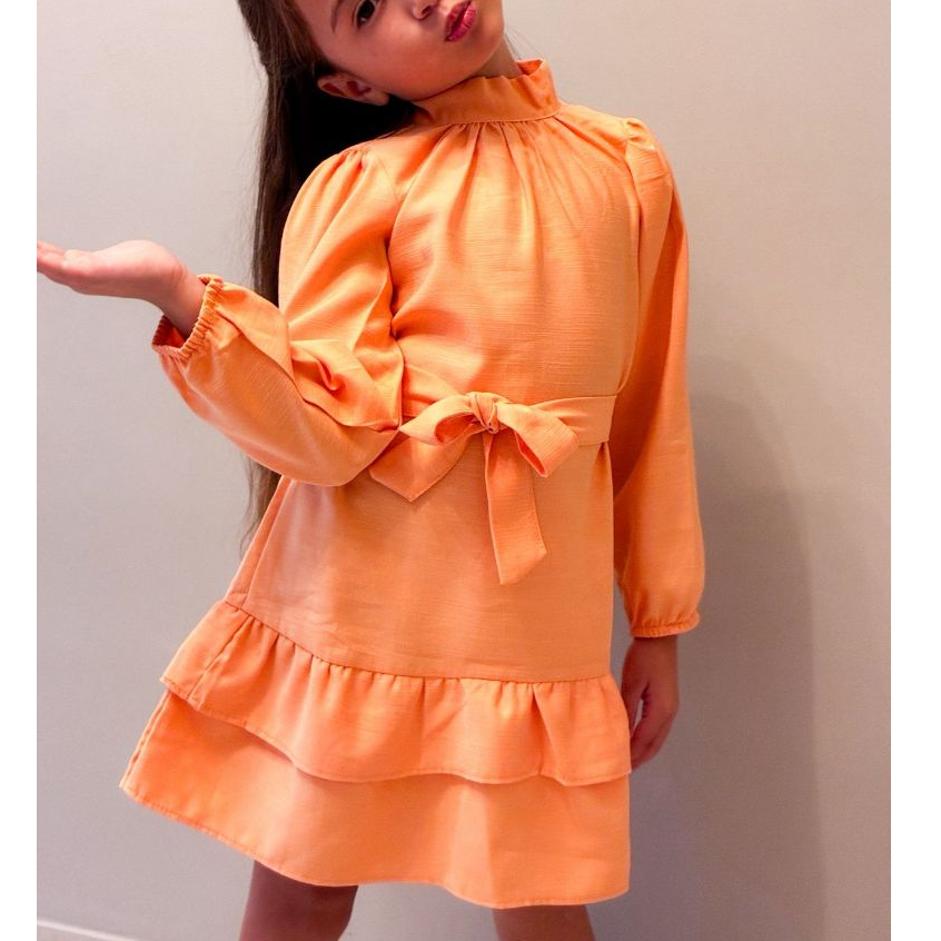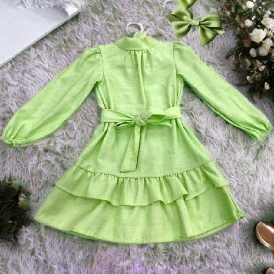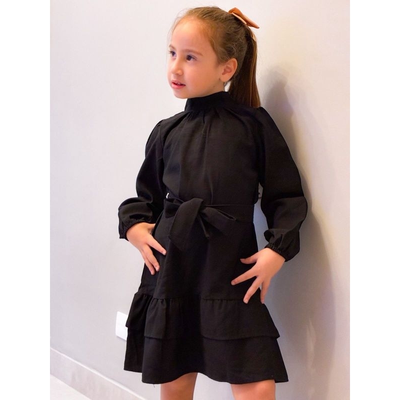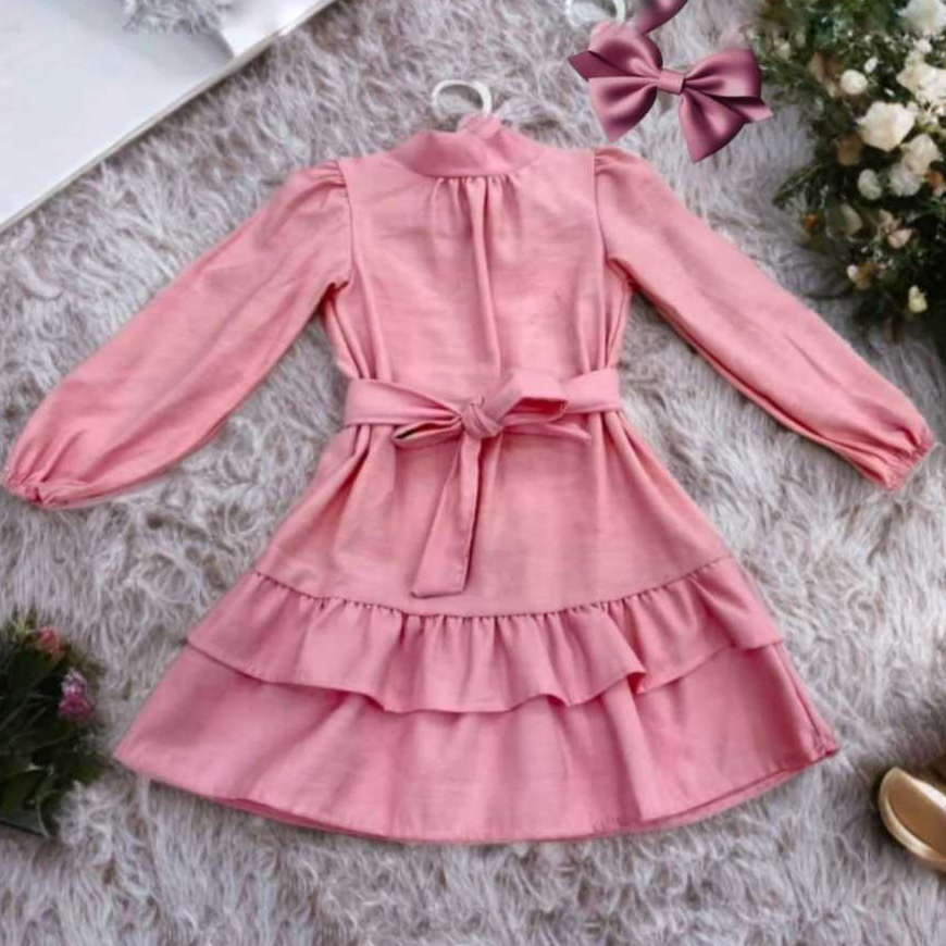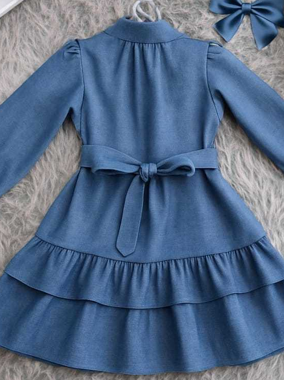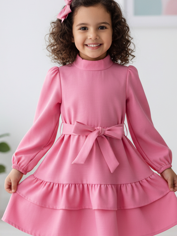 Vestido Infantil Feminino Manga Longa Babados e Faixa de laço Roupa Menina Elegante Moda Casual