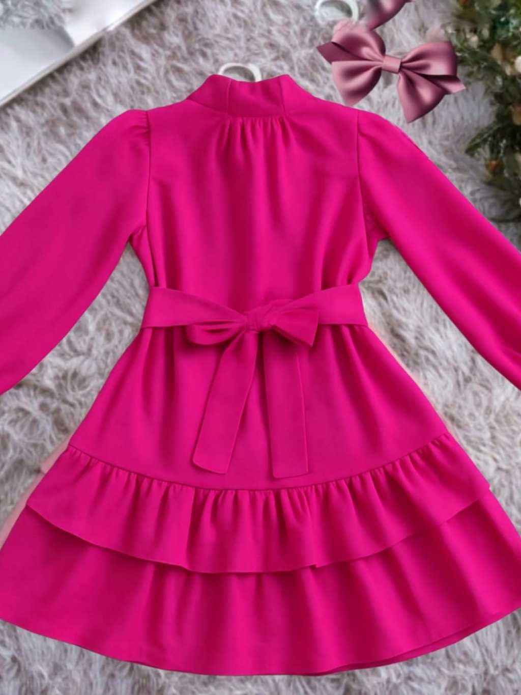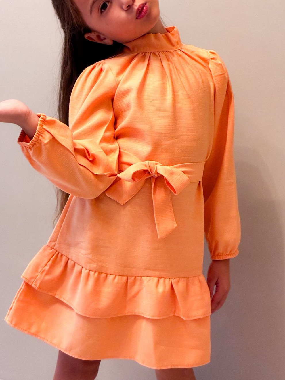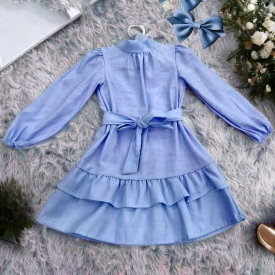 Vestido Infantil Feminino Manga Longa Babados e Faixa de laço Roupa Menina Elegante Moda Casual