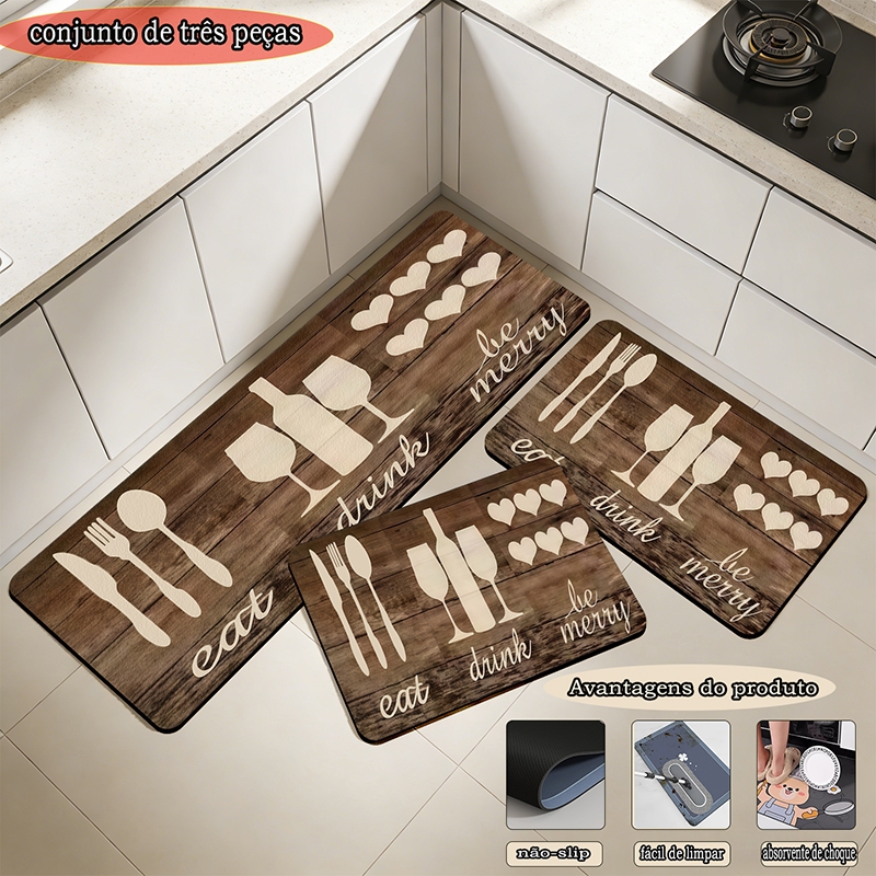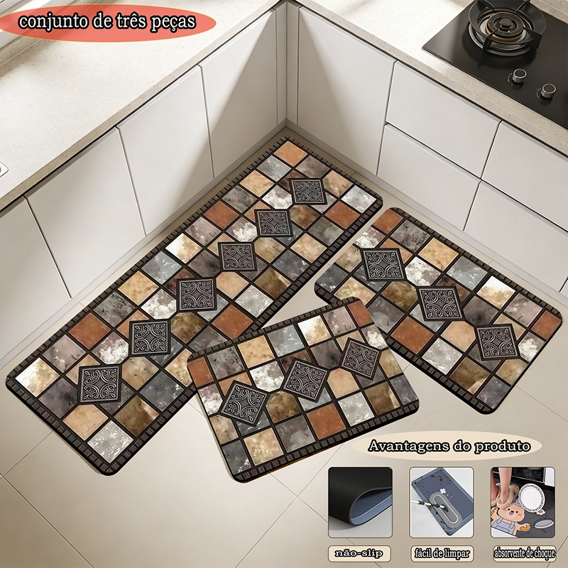 Cozinha com tapete de terra resistente à água e conjunto de 3 peças anti-deslizamento, tamanho inclui 90cm * 34cm e 60cm