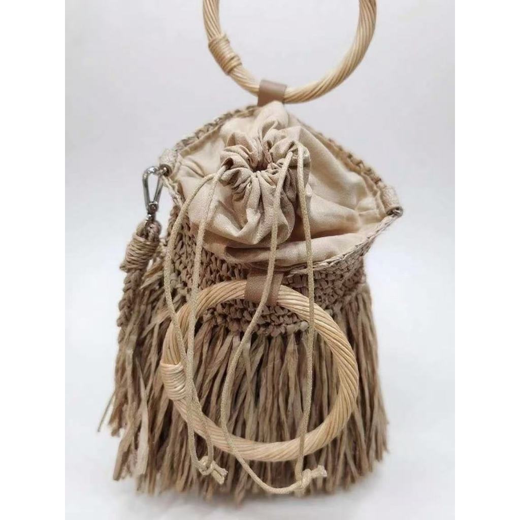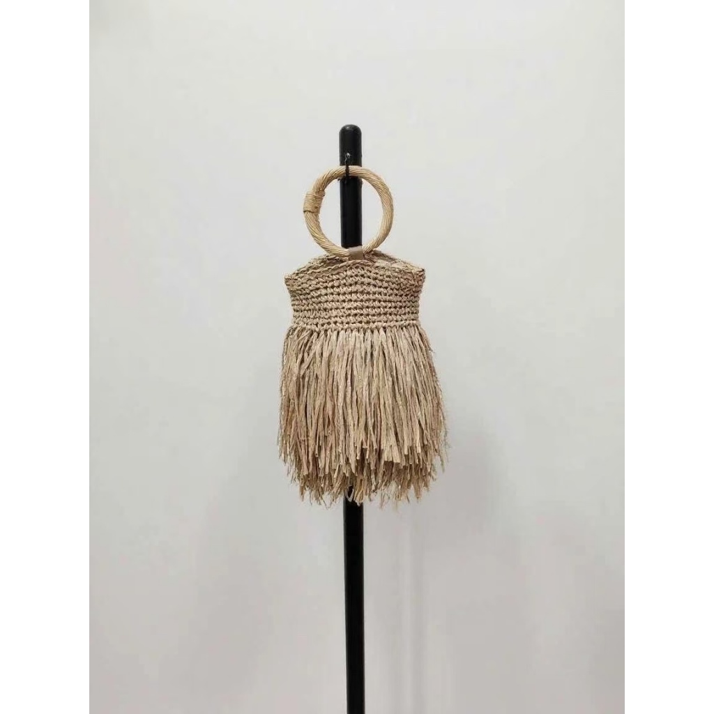 Bolsa Feminina de Palha com Alça de Mão Circular – Estilo Boho com Franjas Naturais