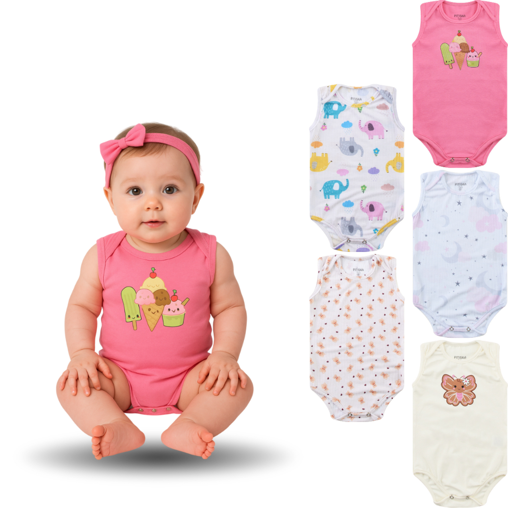 Kit 4 Peças Body Bebê Menina Regata Estampados Divertidos – Conforto e Estilo para o Dia a Dia