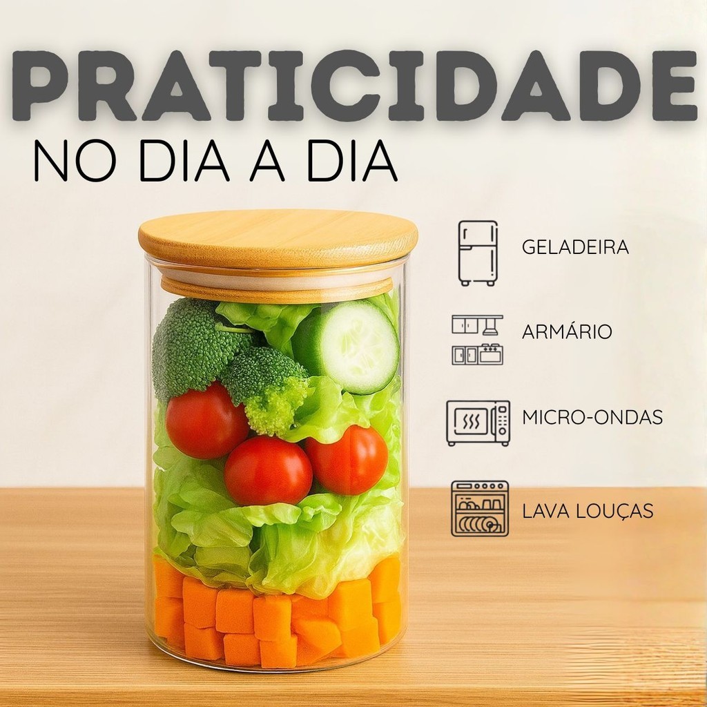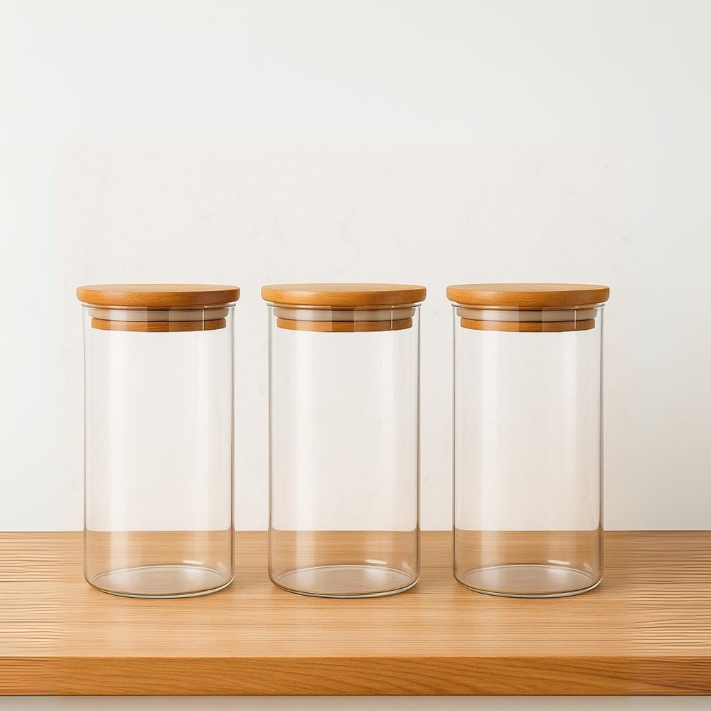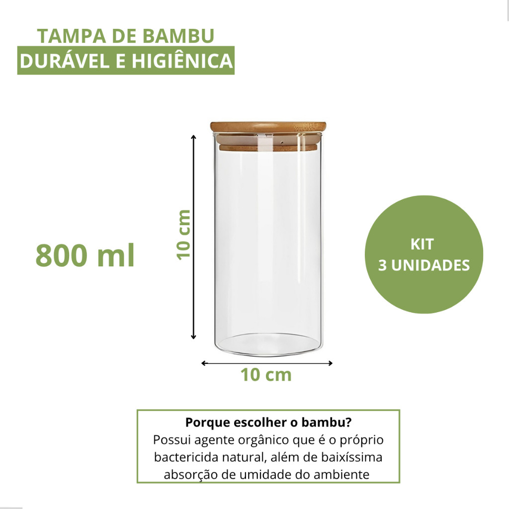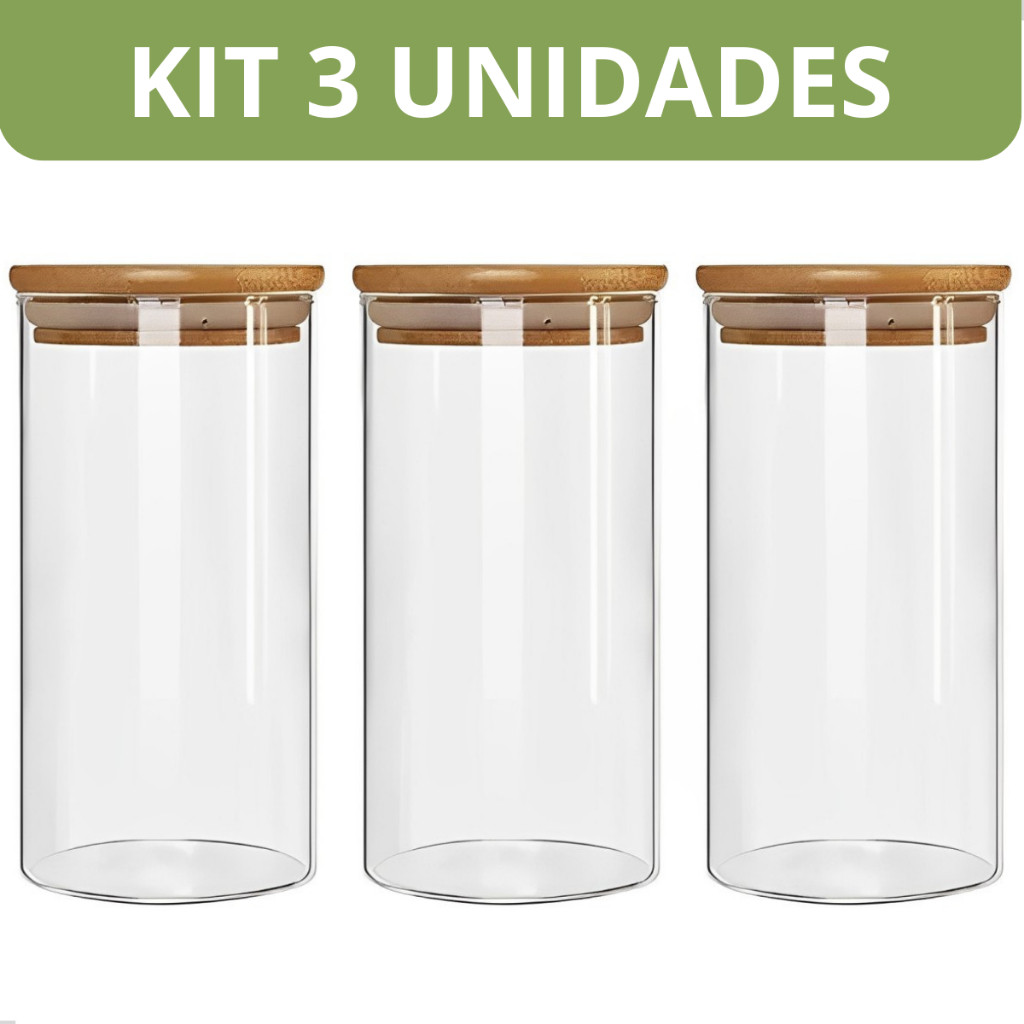 Conjunto 3 Potes Herméticos Com 800ml De Vidro Redondo Tampa De Bambu Mantimentos Tempero Alimento