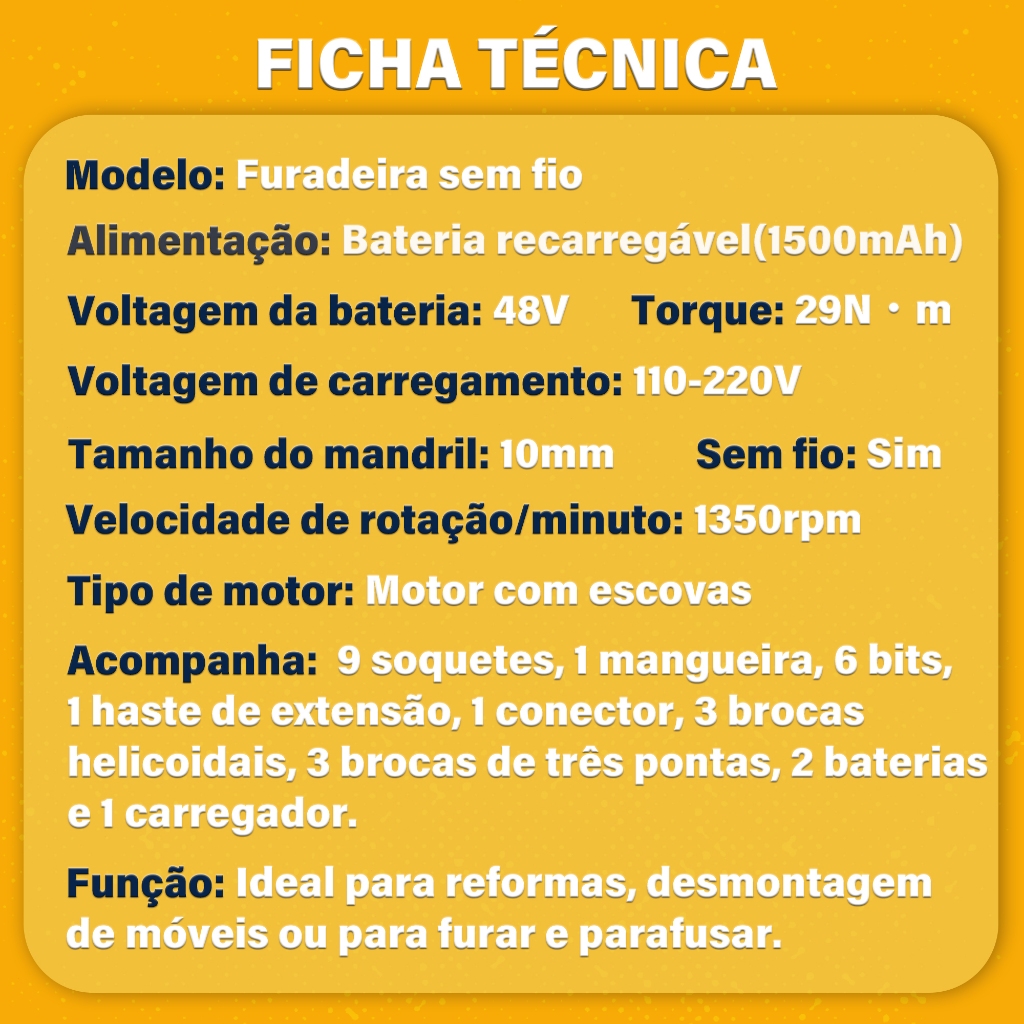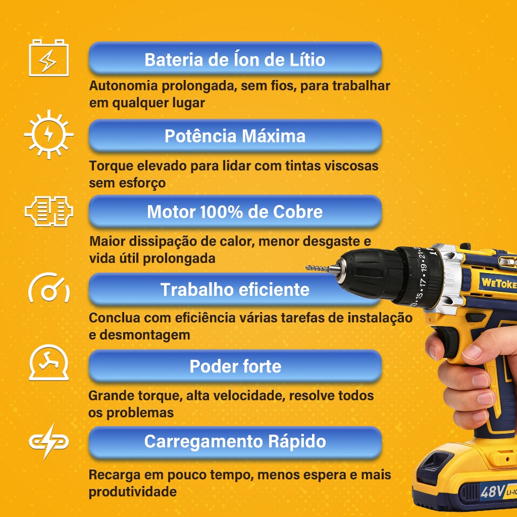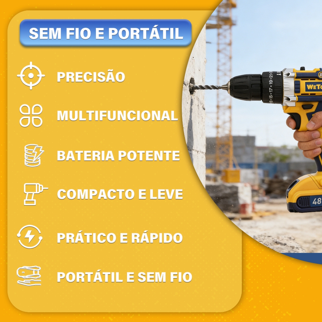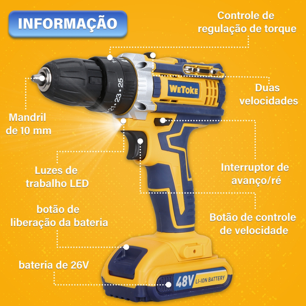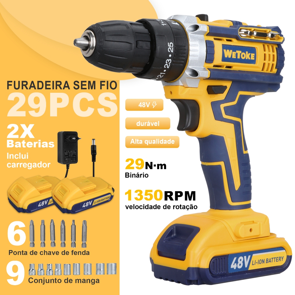 Furadeira Parafusadeira Impacto 48v Sem Fio 2 Baterias 1300mah 1400rpm 35nm Led Carregador Rápido E Kit Completo