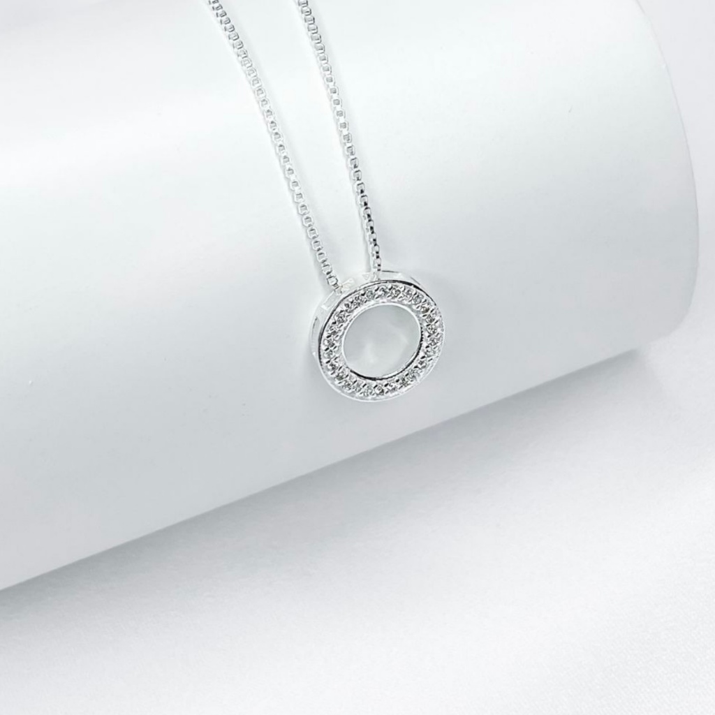 Colar Feminino com Pingente Redondo Vazado Cravejado em Zircônias banho Prata 925, Elegante e Minimalista para Presente