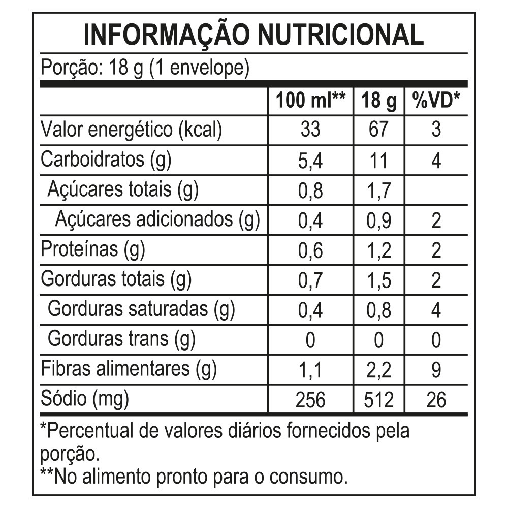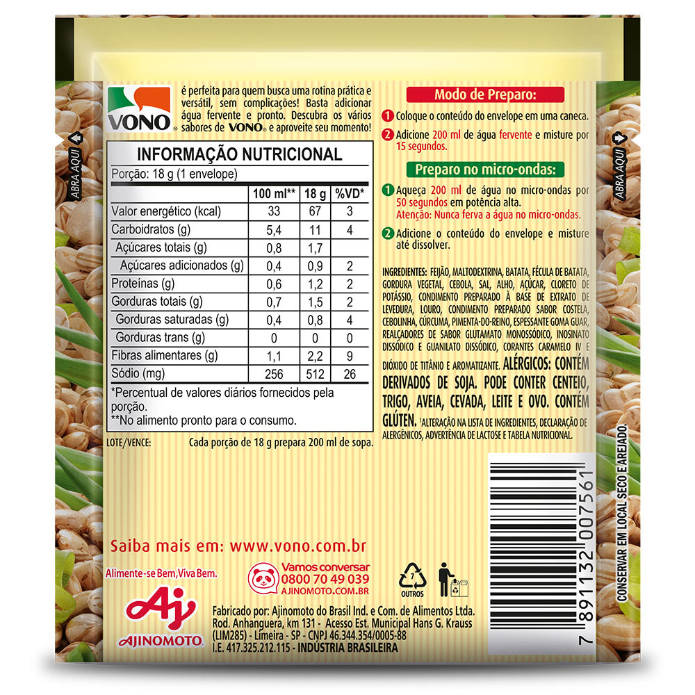Kit 10 Unidades Sopas Cremosas VONO® Individual Sabor Caldinho de Feijão 18G