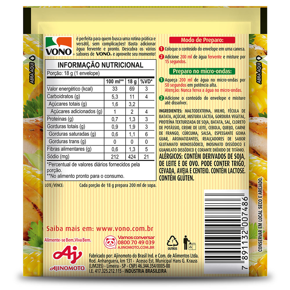 Kit 10 Unidades Sopas Cremosas VONO® Individual Sabor Milho com Frango 18G