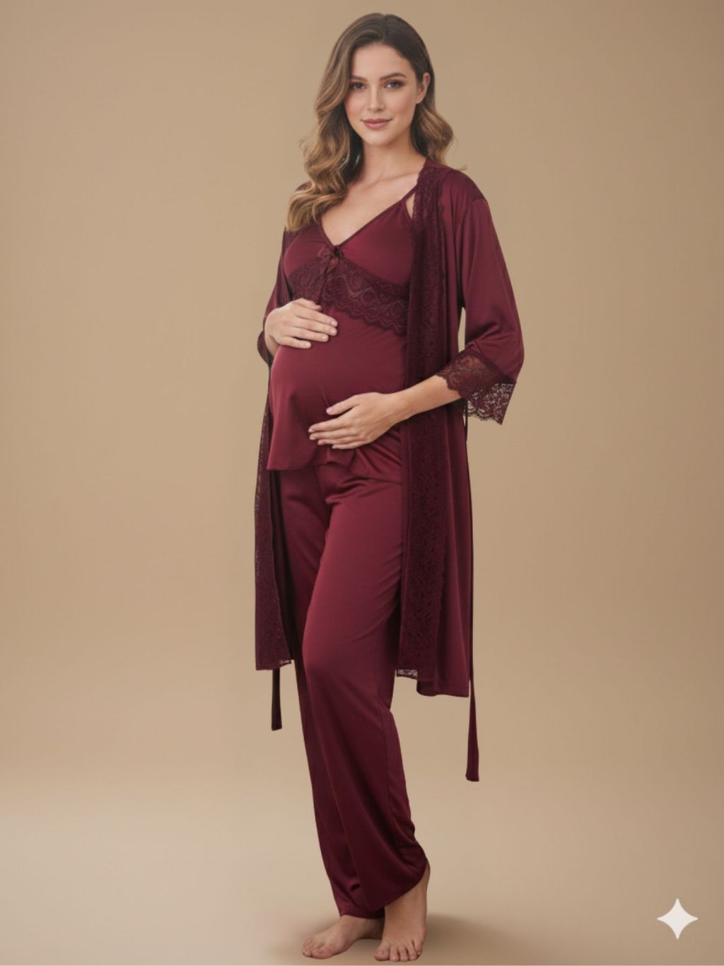 KIT Pijama Amamentação BabyDoll com CALÇA Longa e Blusa Com Click + ROBE em Renda
