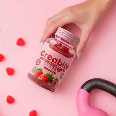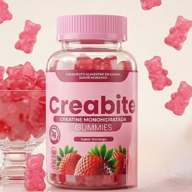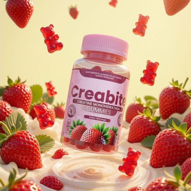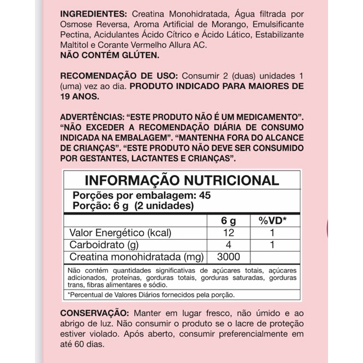 Pote de creatina em goma de 60 unidades Sabor Morango/zero açúcar 100% pura mono hidratada/importada