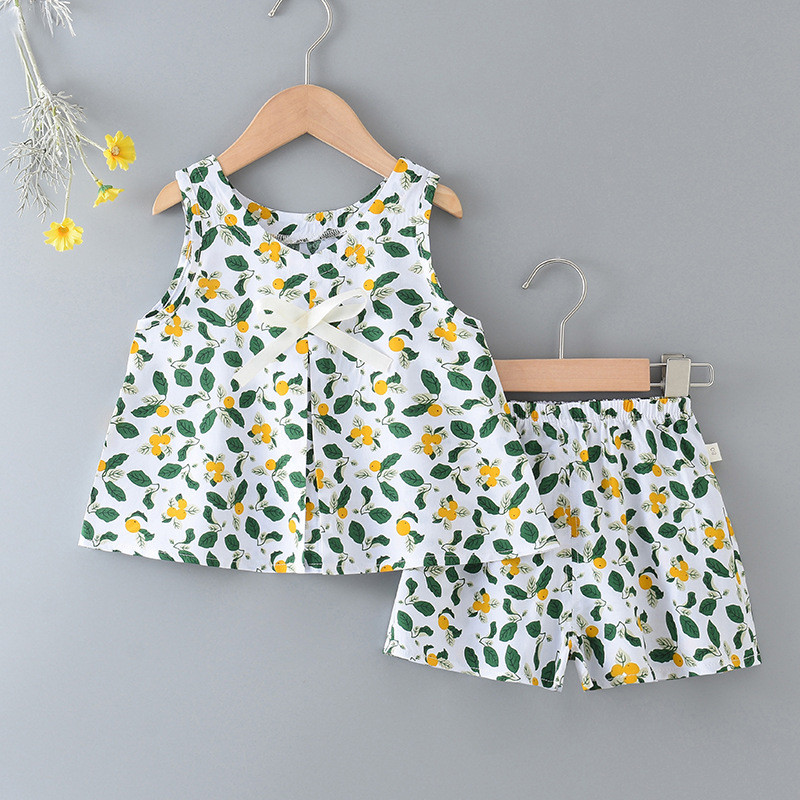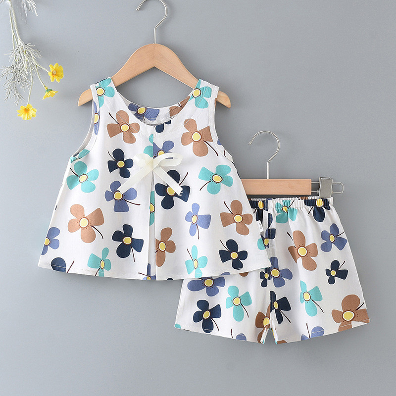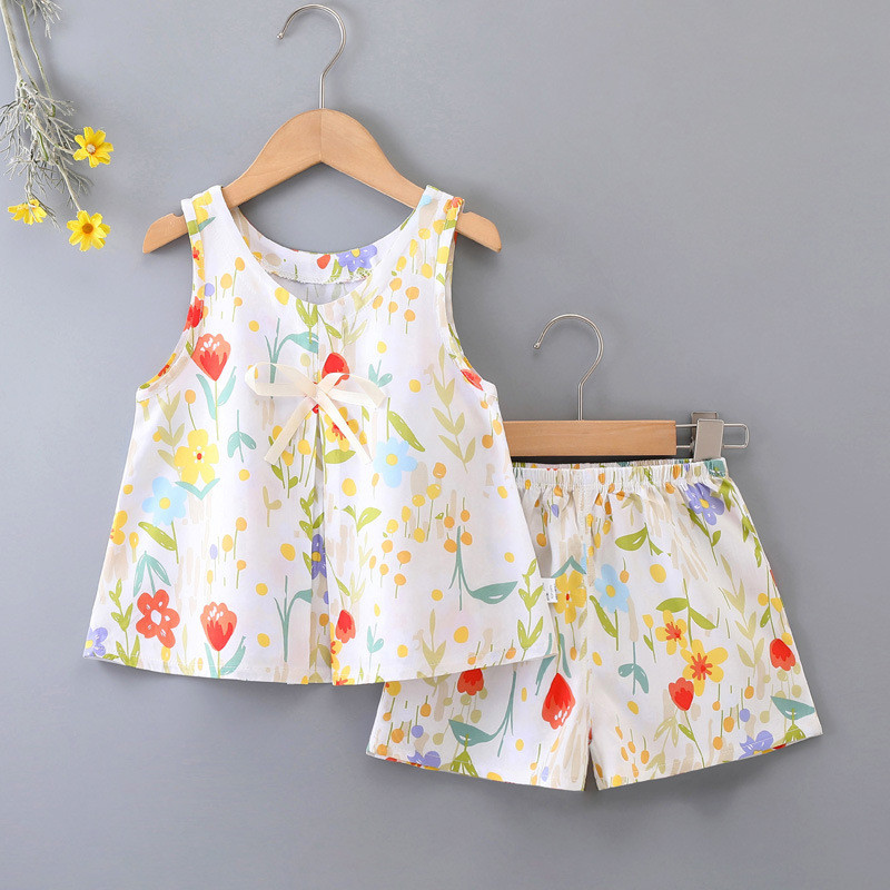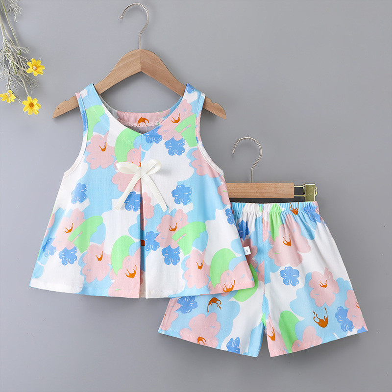 Terno de seda de algodão infantil verão estilo fino moda menina bebê sem mangas Shorts colete algodão seda Loungewear te