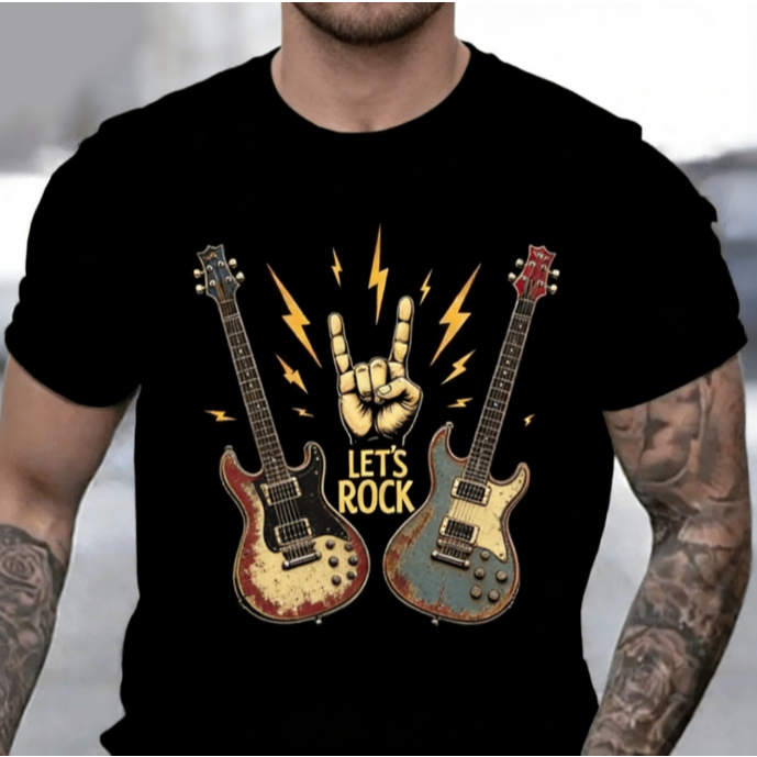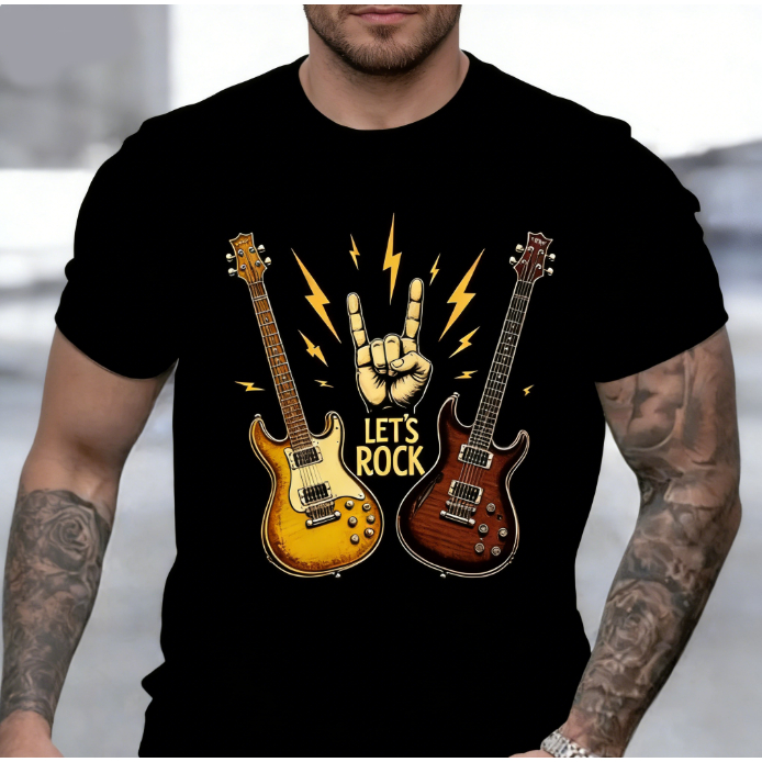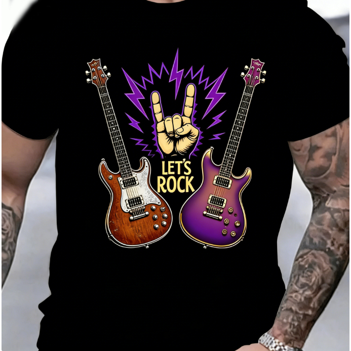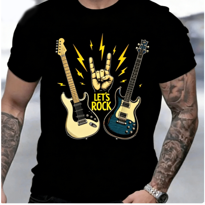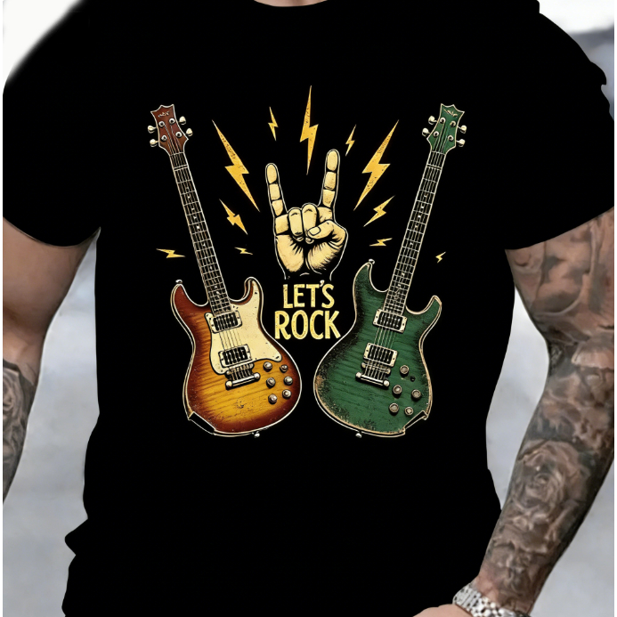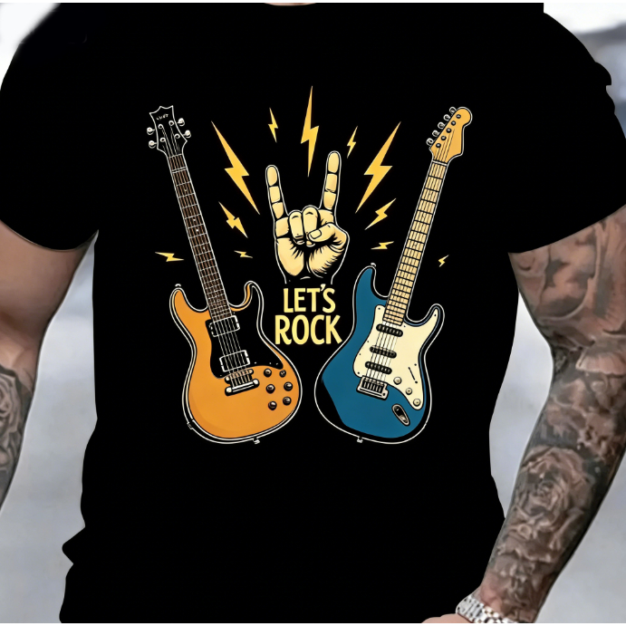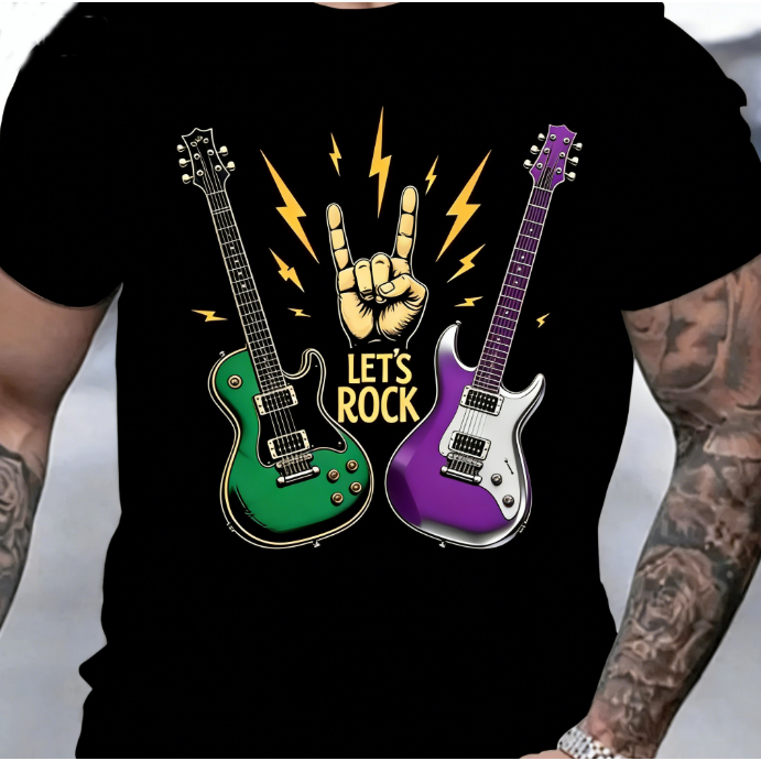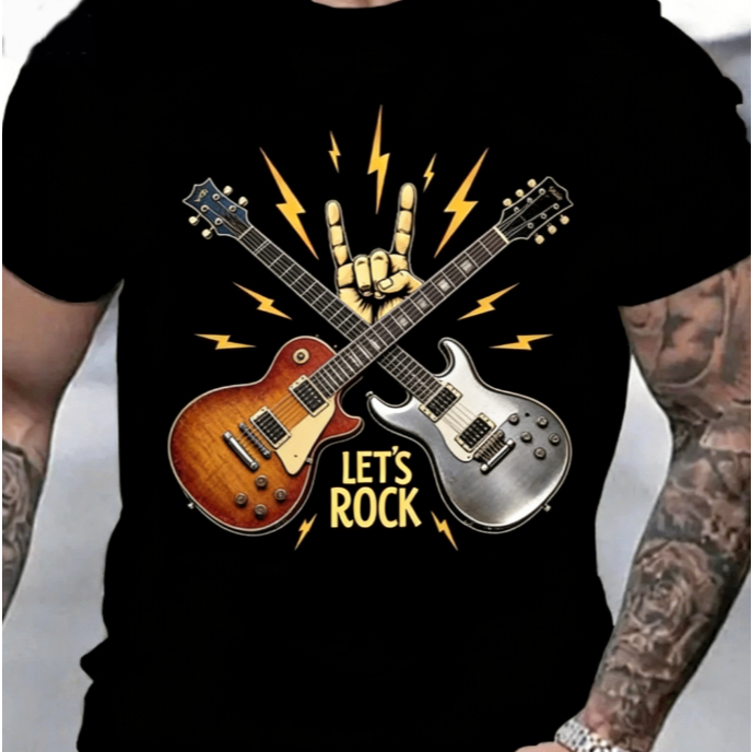 Bonito Camiseta Estampada Com Guitarra De Rock, Preta, 100% Algodão, Masculina